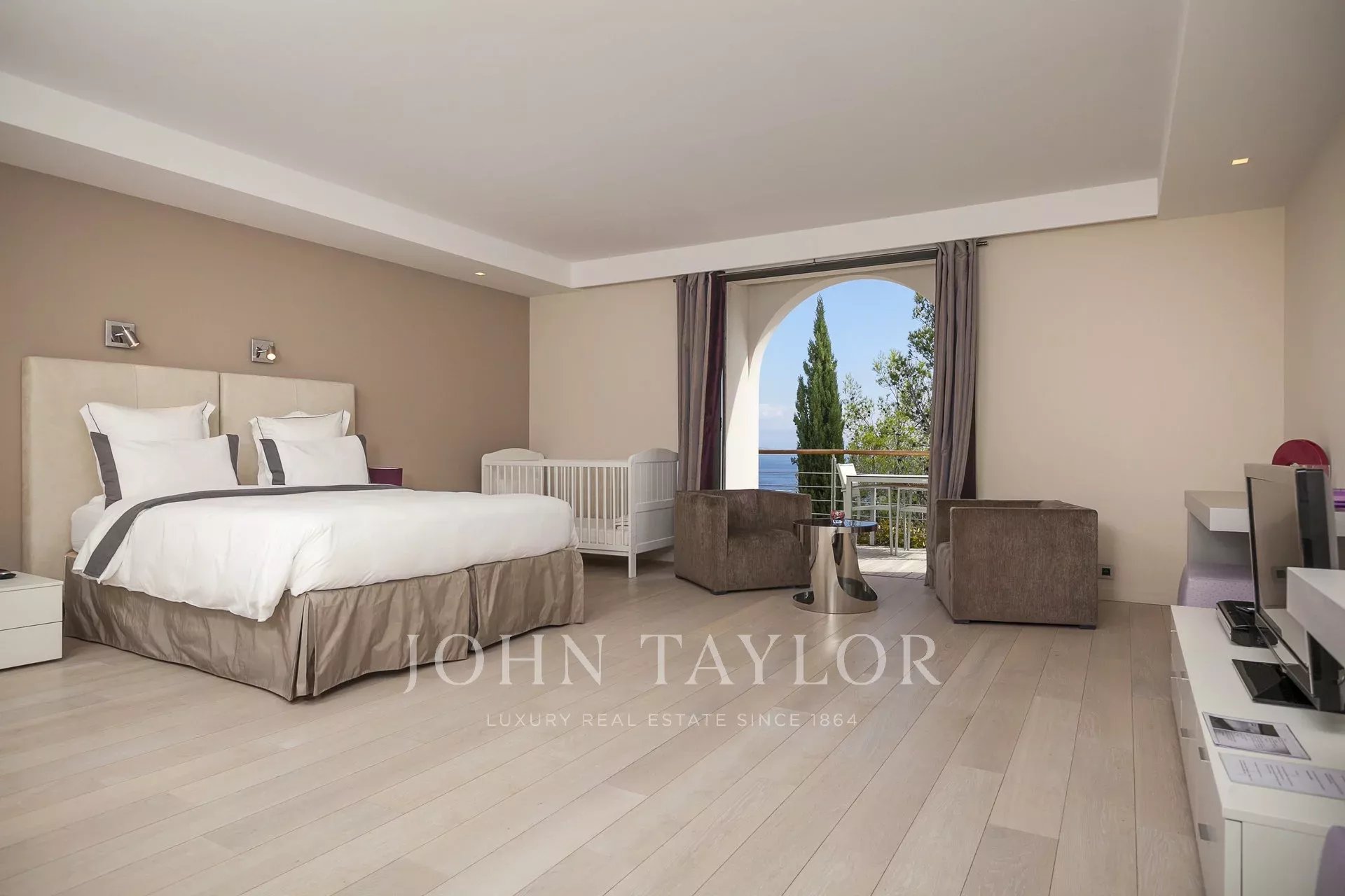 Большая спальня с 2 ванные комнаты-сьюты с видом на порт Сен-Жан-Кап-Ферра и открытый бассейн. Зона ТB с аудио/видео системой.