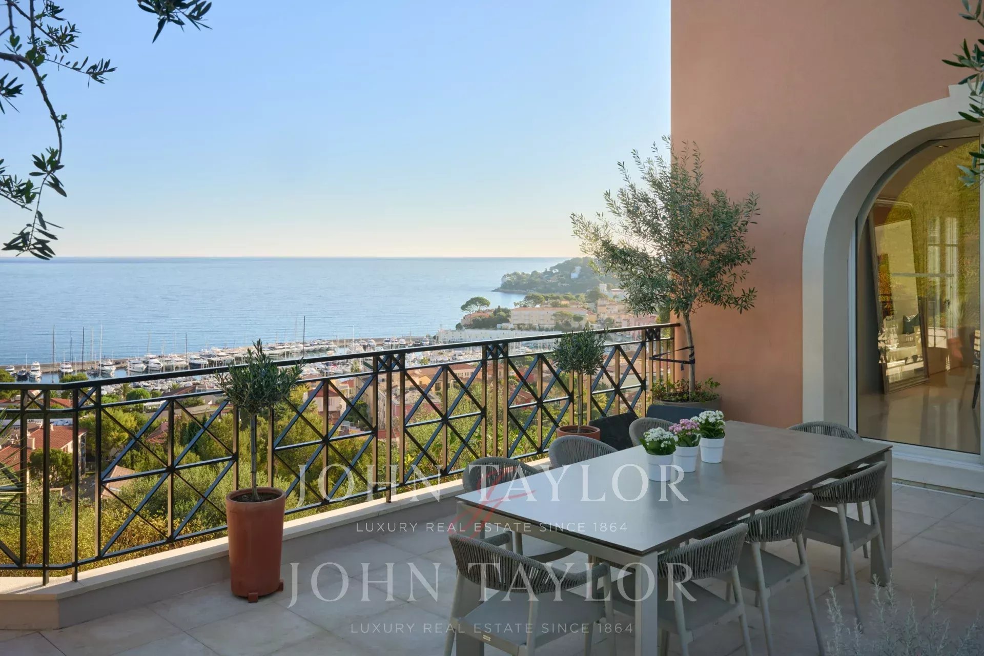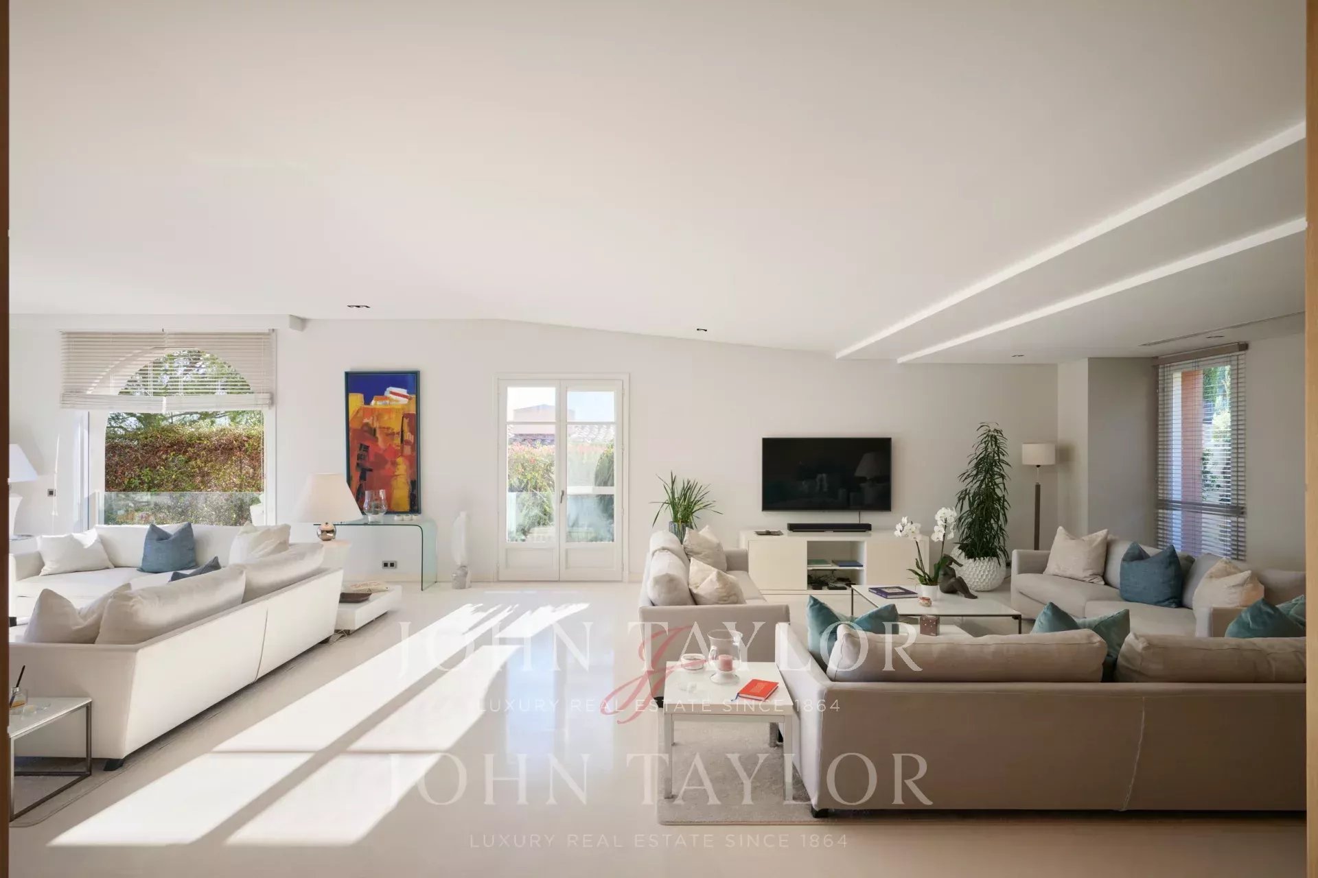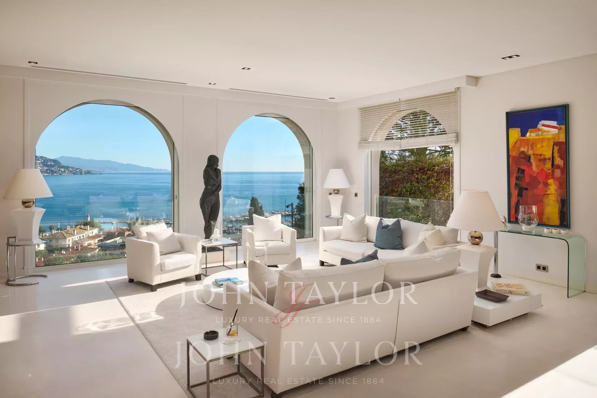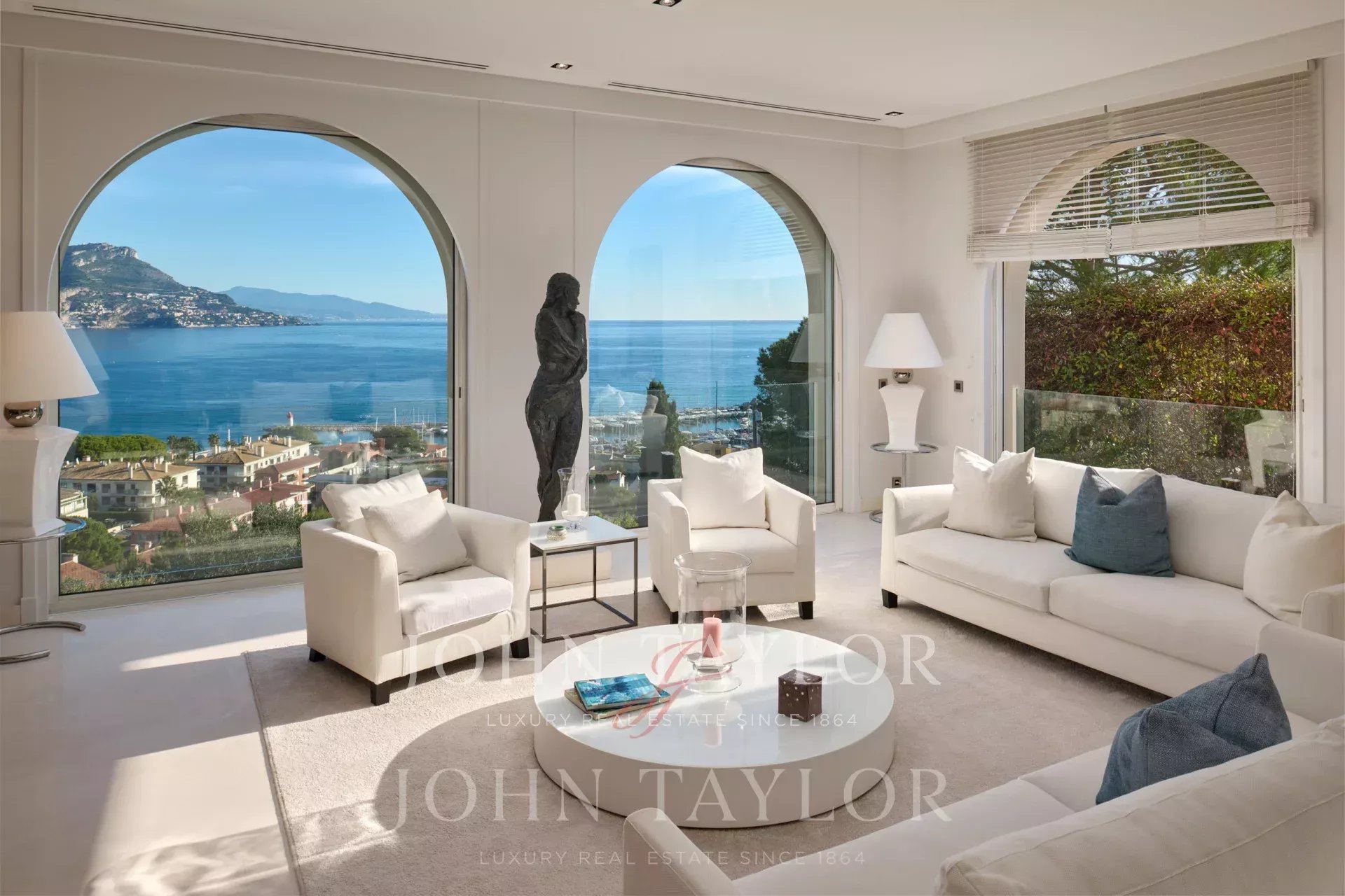 Очень светлая двойная гостиная с видом на порт Сен-Жан-Кап-Ферра с телевизионной зоной.