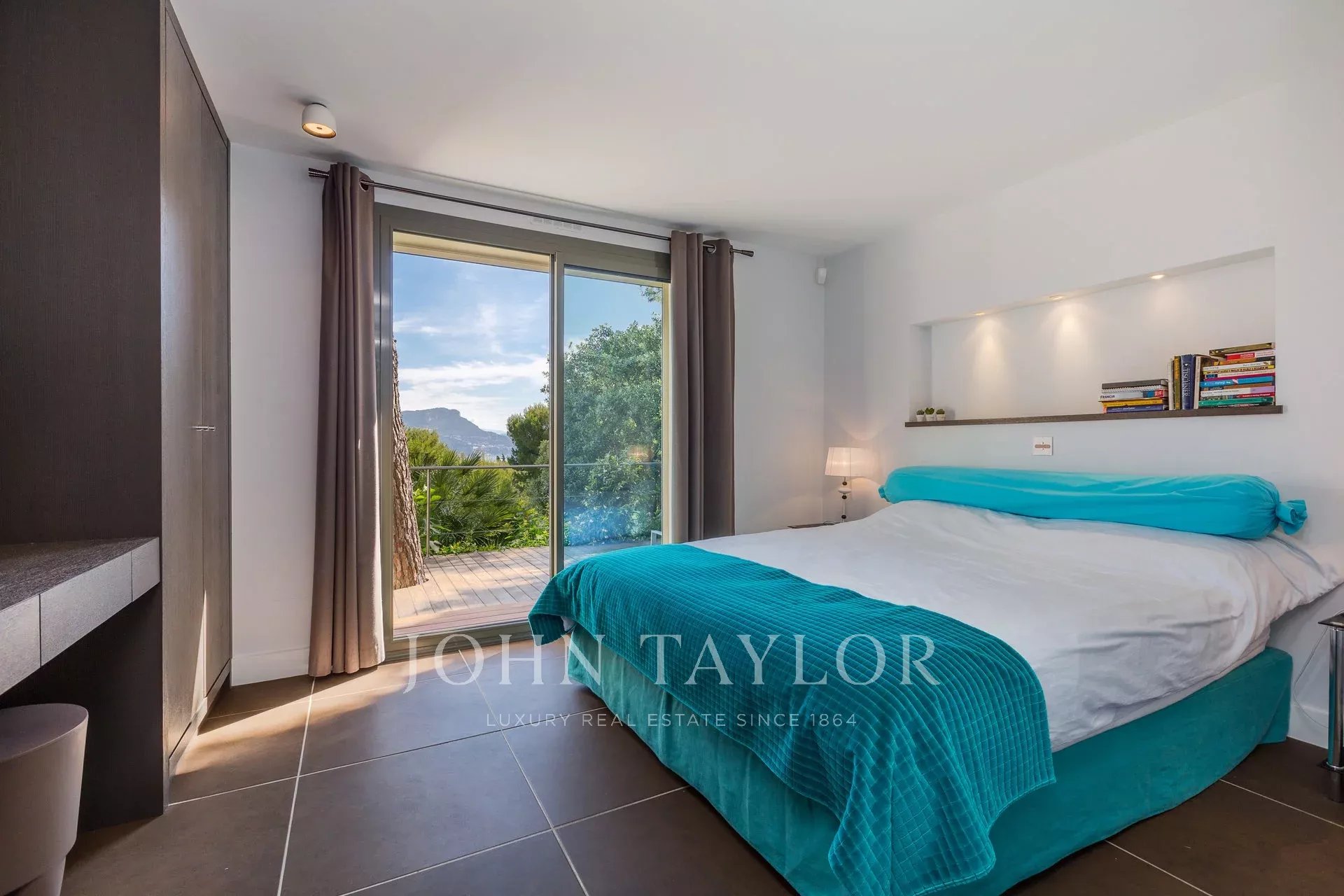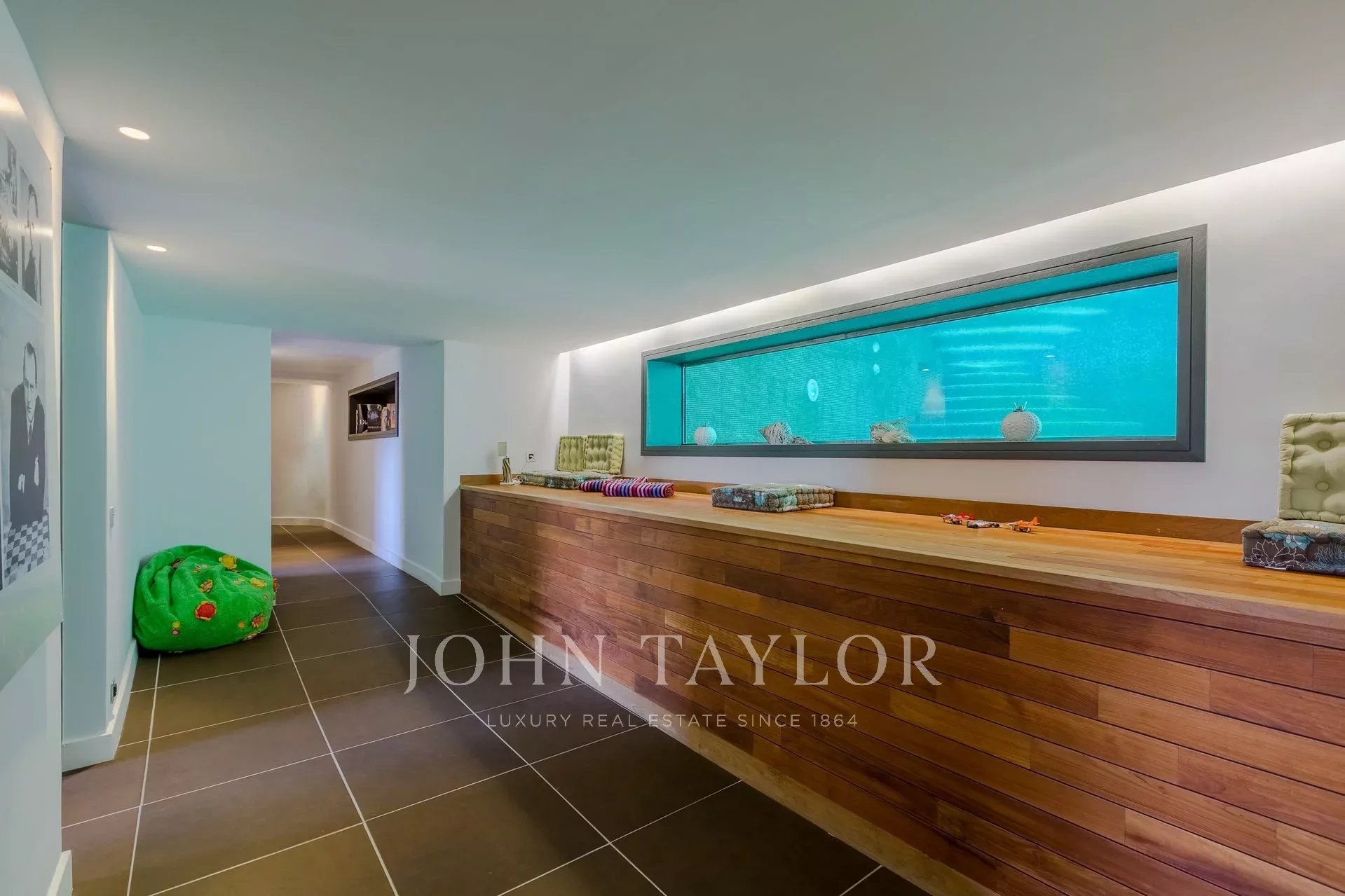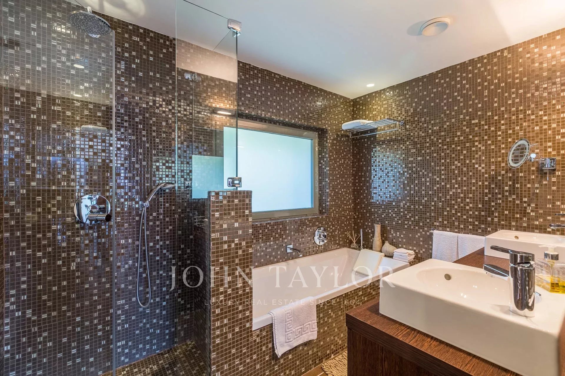 гостиной, столовой, полностью оборудованной кухни, пяти спален и пяти ванных комнат. Вилла полностью оснащена кондиционером. Бассейн с подогревом, сигнализация, парковка на 5-6 автомобилей.