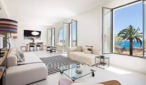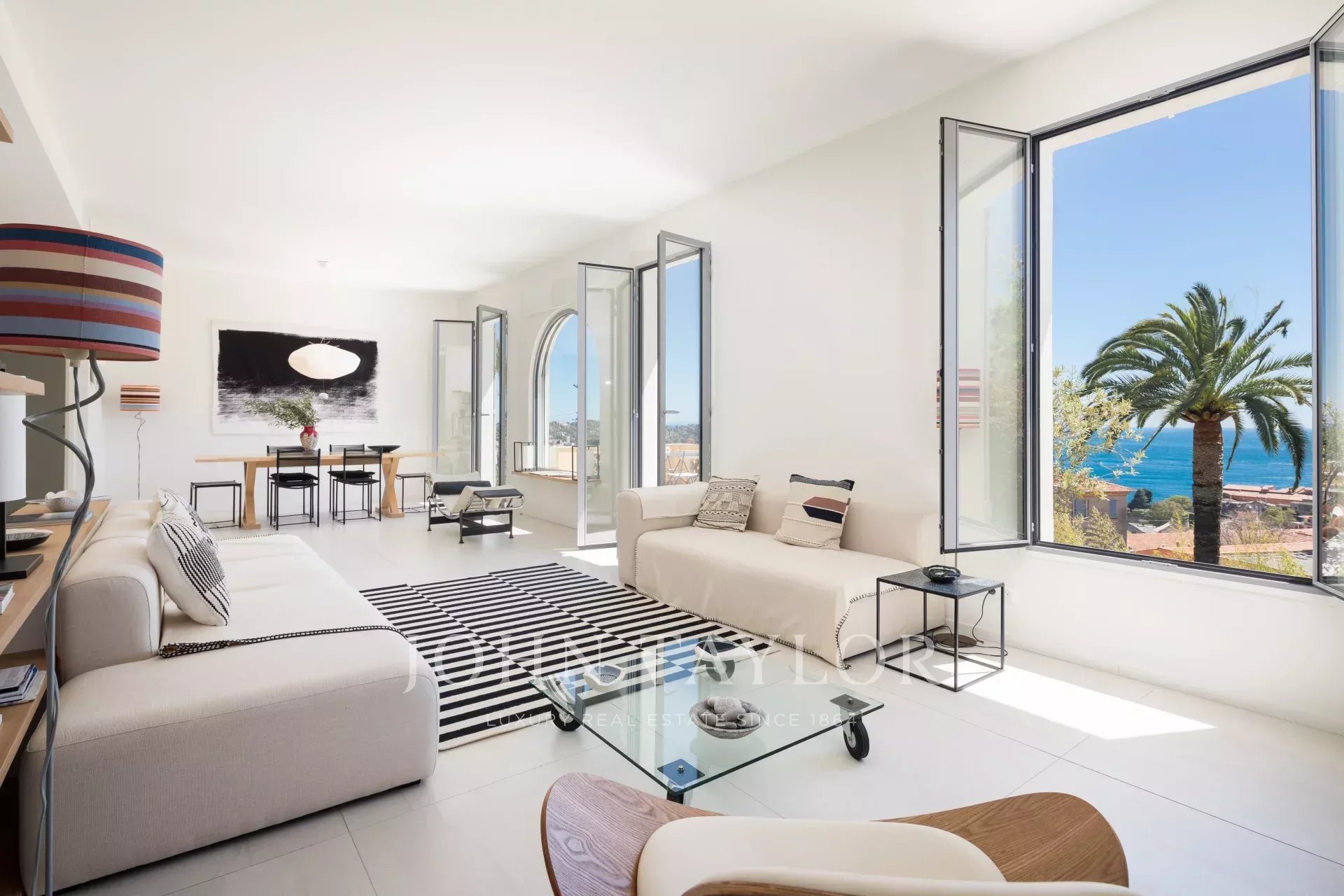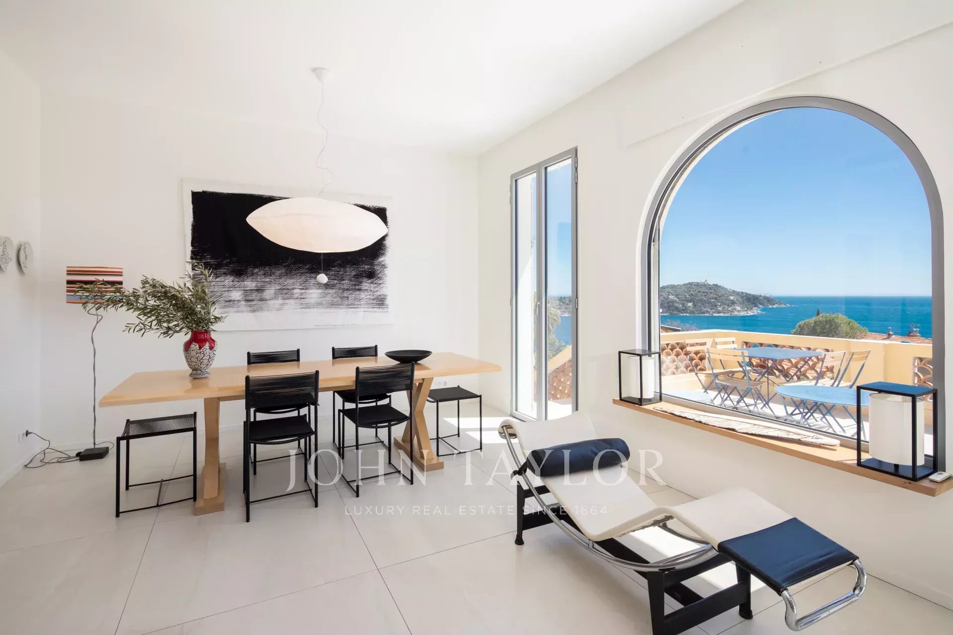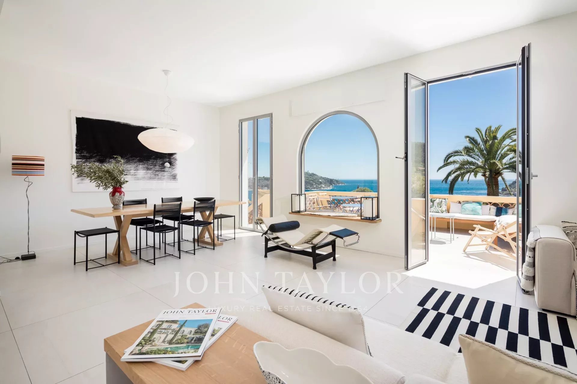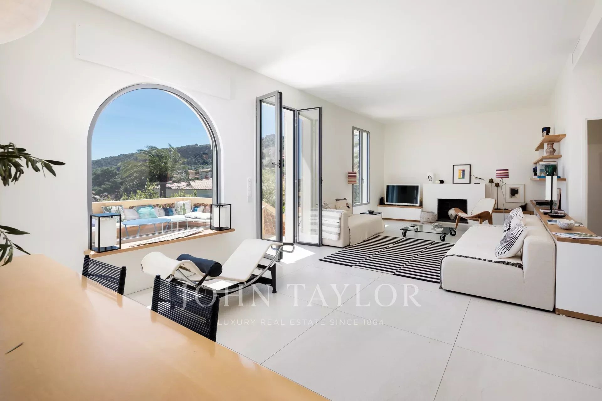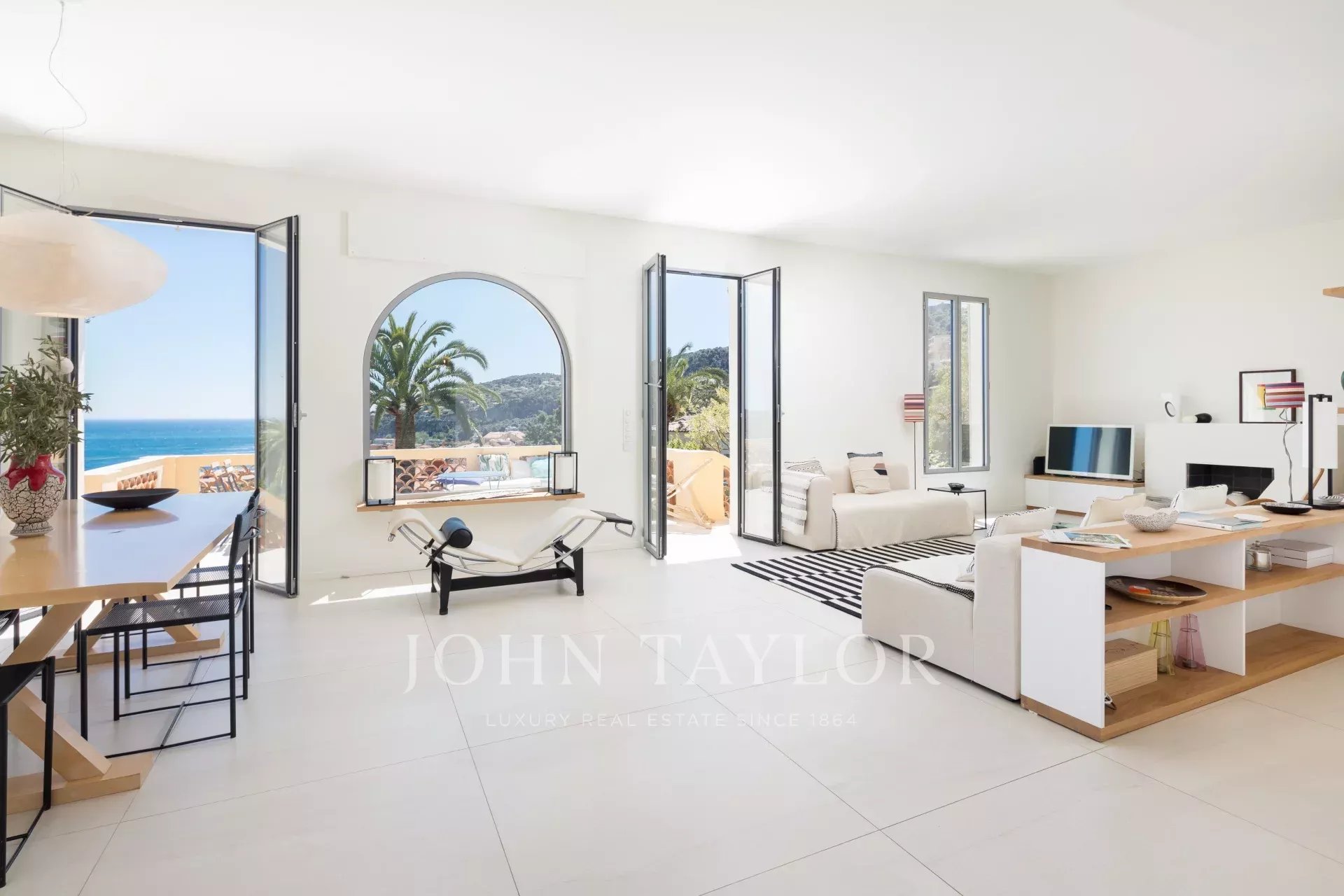 Гостиная с телевизором / столовая, выходящая на большую террасу с видом на море