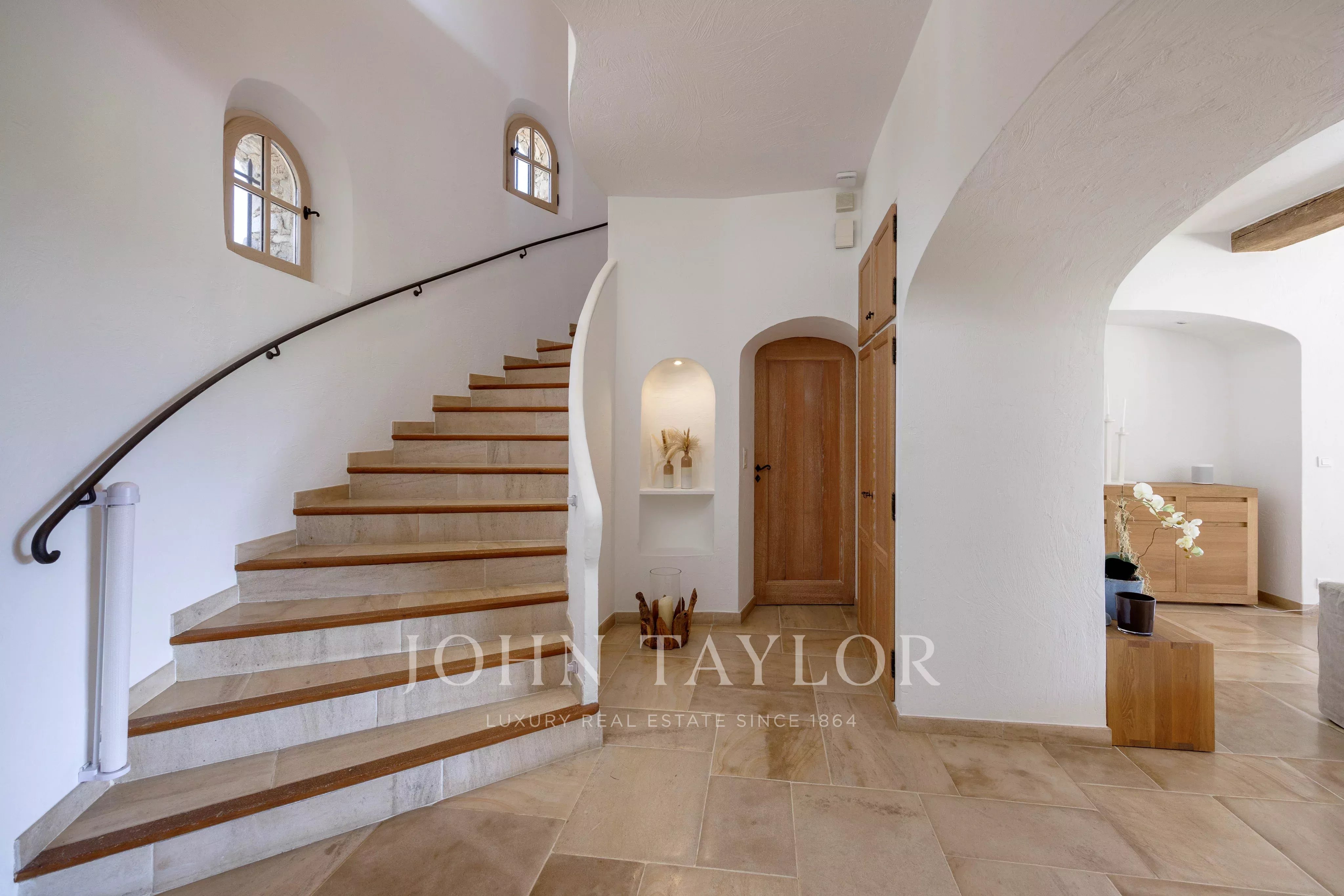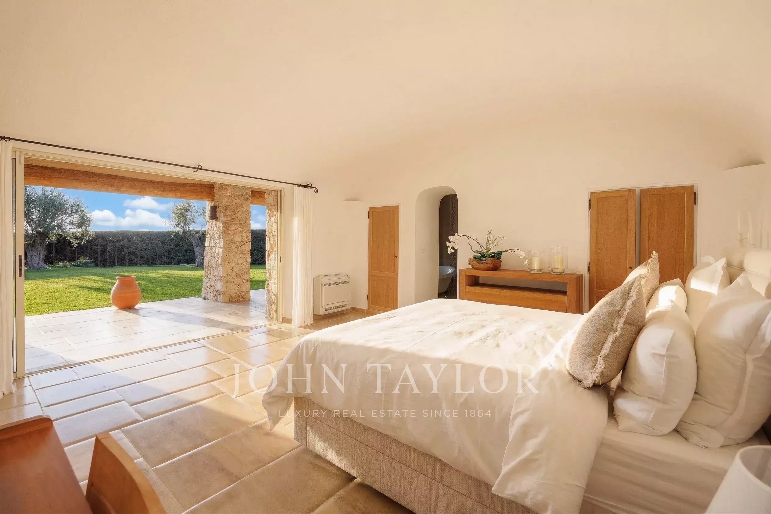 Наверху две элегантные спальни, каждая из которых имеет собственную душевую комнату, большую гардеробную и выход на террасу с приятным видом на море.