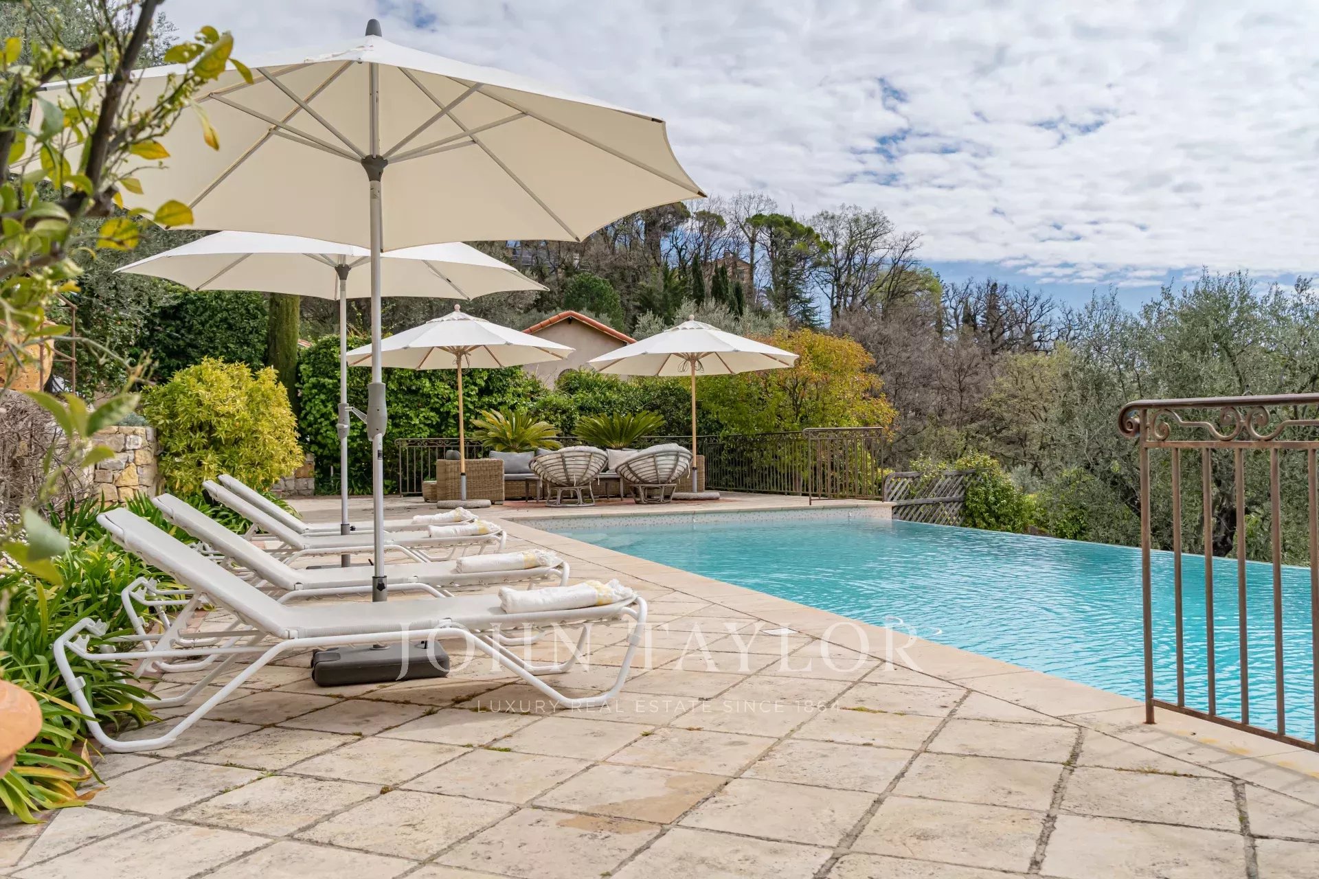 бассейн (12x5 м) с жалюзи, который можно подогревать, парковка на 2 машины, кондиционер и охлаждение пола, площадка для игры в буль, сигнализация и централизованное закрытие жалюзи.