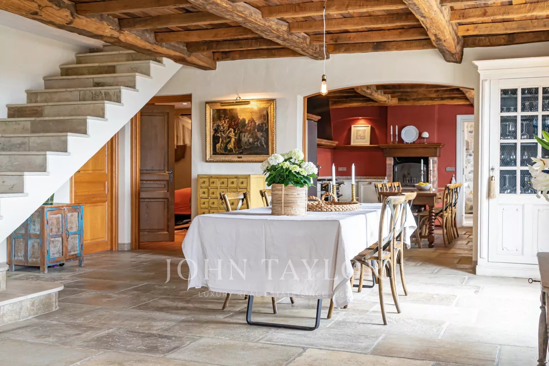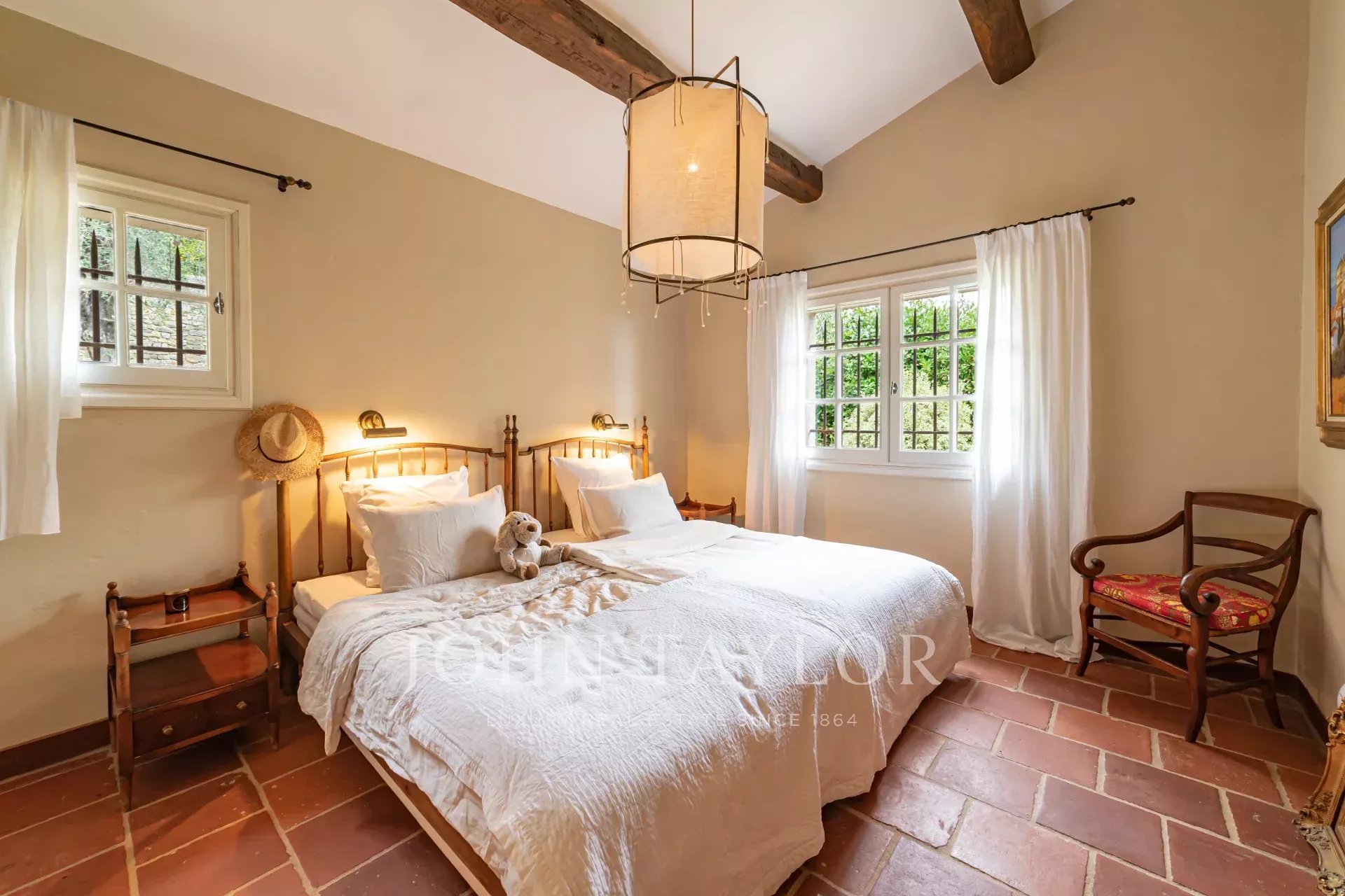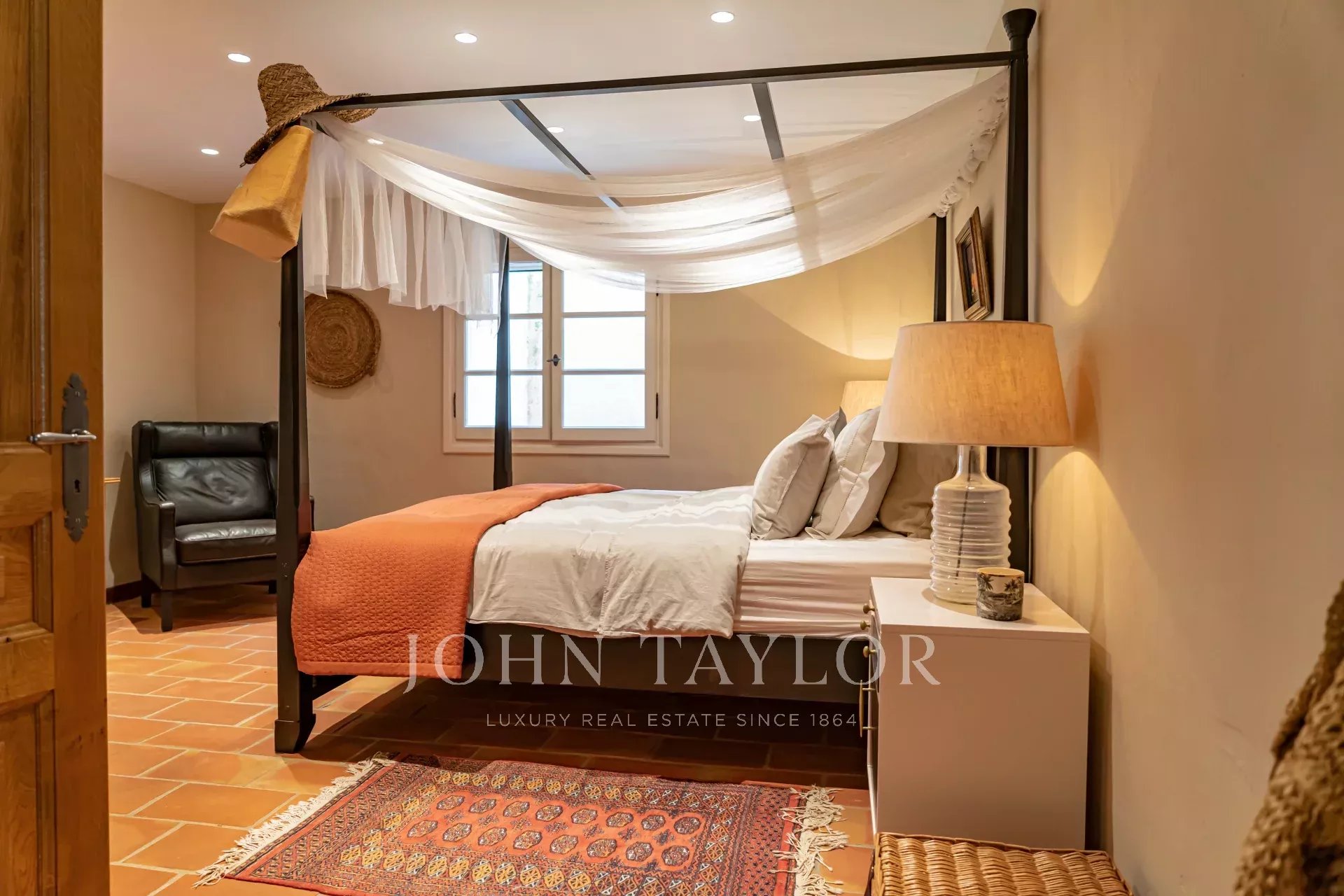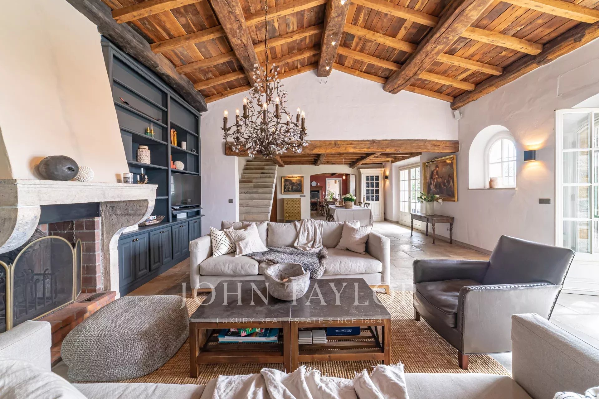 прихожая с гостевым туалетом, большая гостиная с камином, телевизором и аудиосистемой, столовая, выходящая на полностью оборудованную кухню с камином, летняя кухня с барбекю, спальня N°1 (без кондиционера) с двуспальной кроватью и душевой комнатой (умывальник, душ, туалет), гардероб, прачечная.