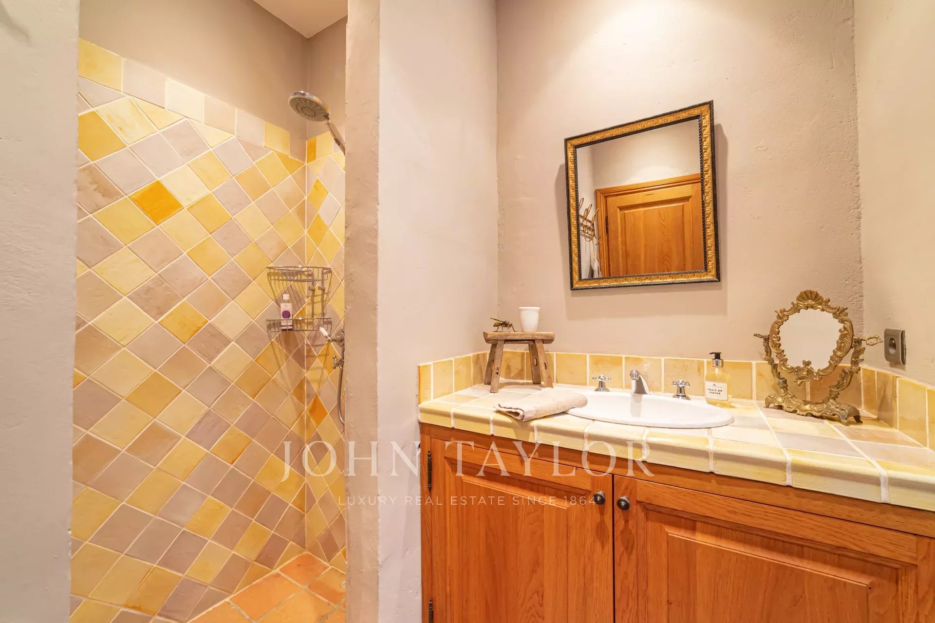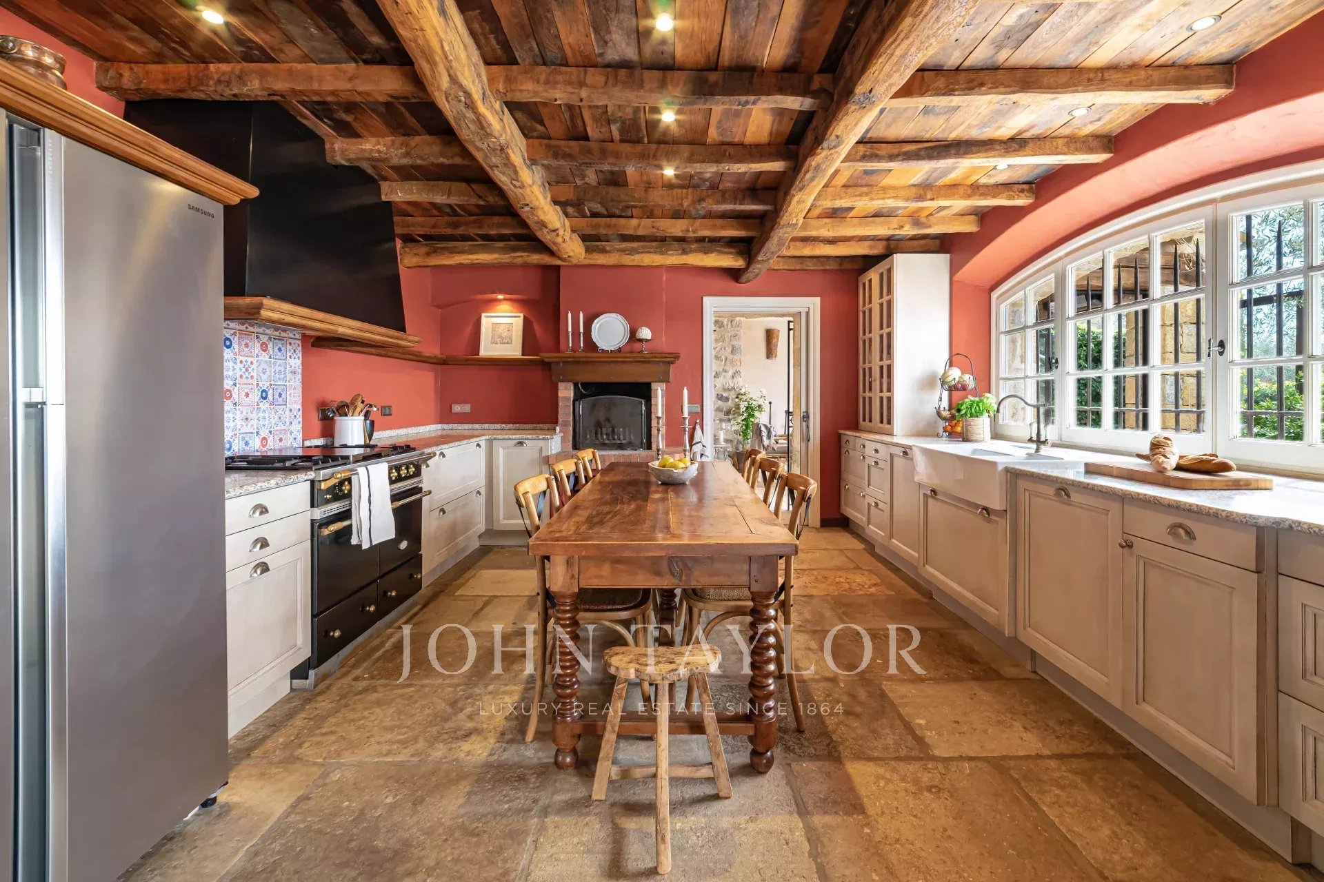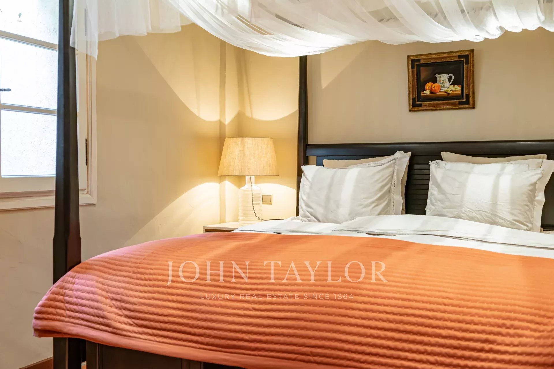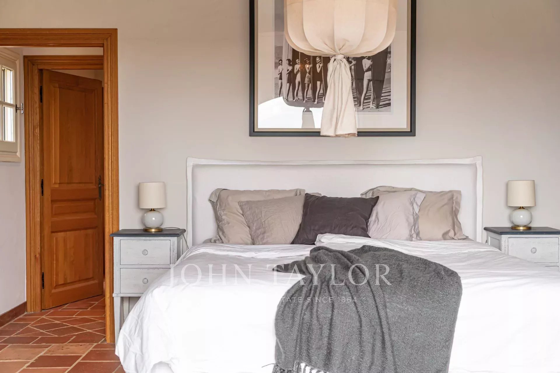 прихожая с гостевым туалетом, большая гостиная с камином, телевизором и аудиосистемой, столовая, выходящая на полностью оборудованную кухню с камином, летняя кухня с барбекю, спальня N°1 (без кондиционера) с двуспальной кроватью и душевой комнатой (умывальник, душ, туалет), гардероб, прачечная.