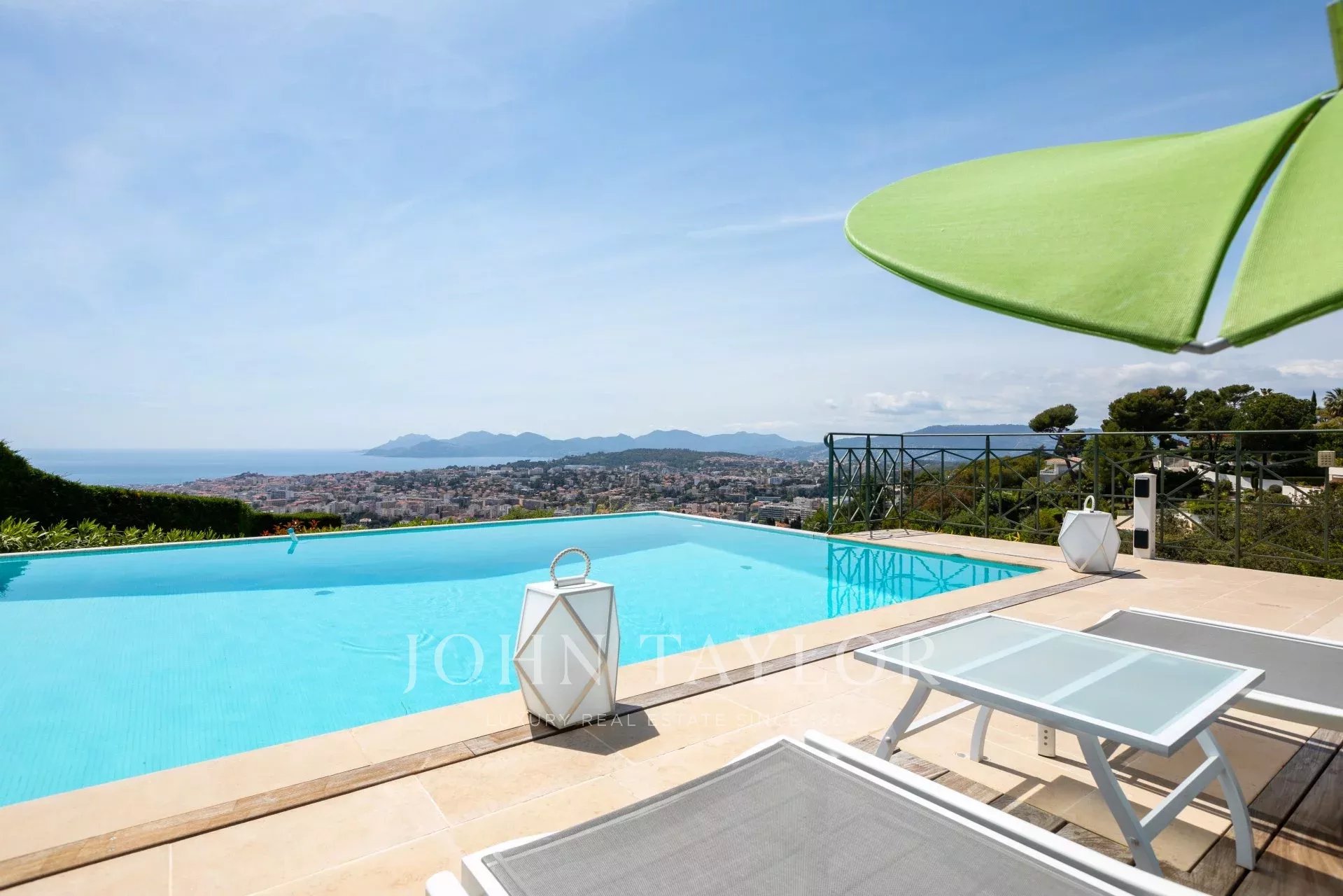Расположенный на высотах Канн в частном домене, эта великолепная новая современная вилла, полностью оборудованная кондиционером, имеет прекрасный вид на море, на залив Канн и на горы Эстерель.