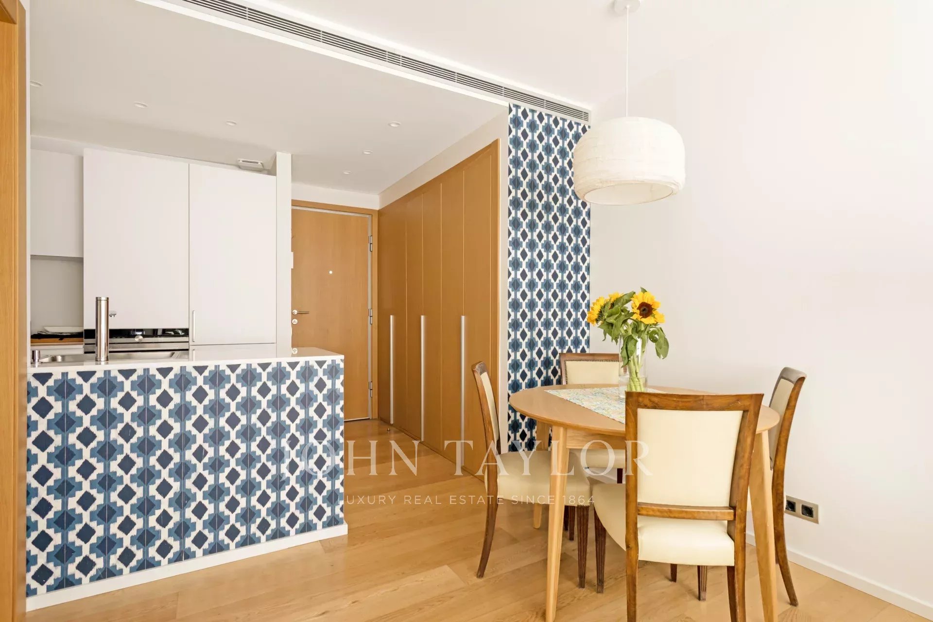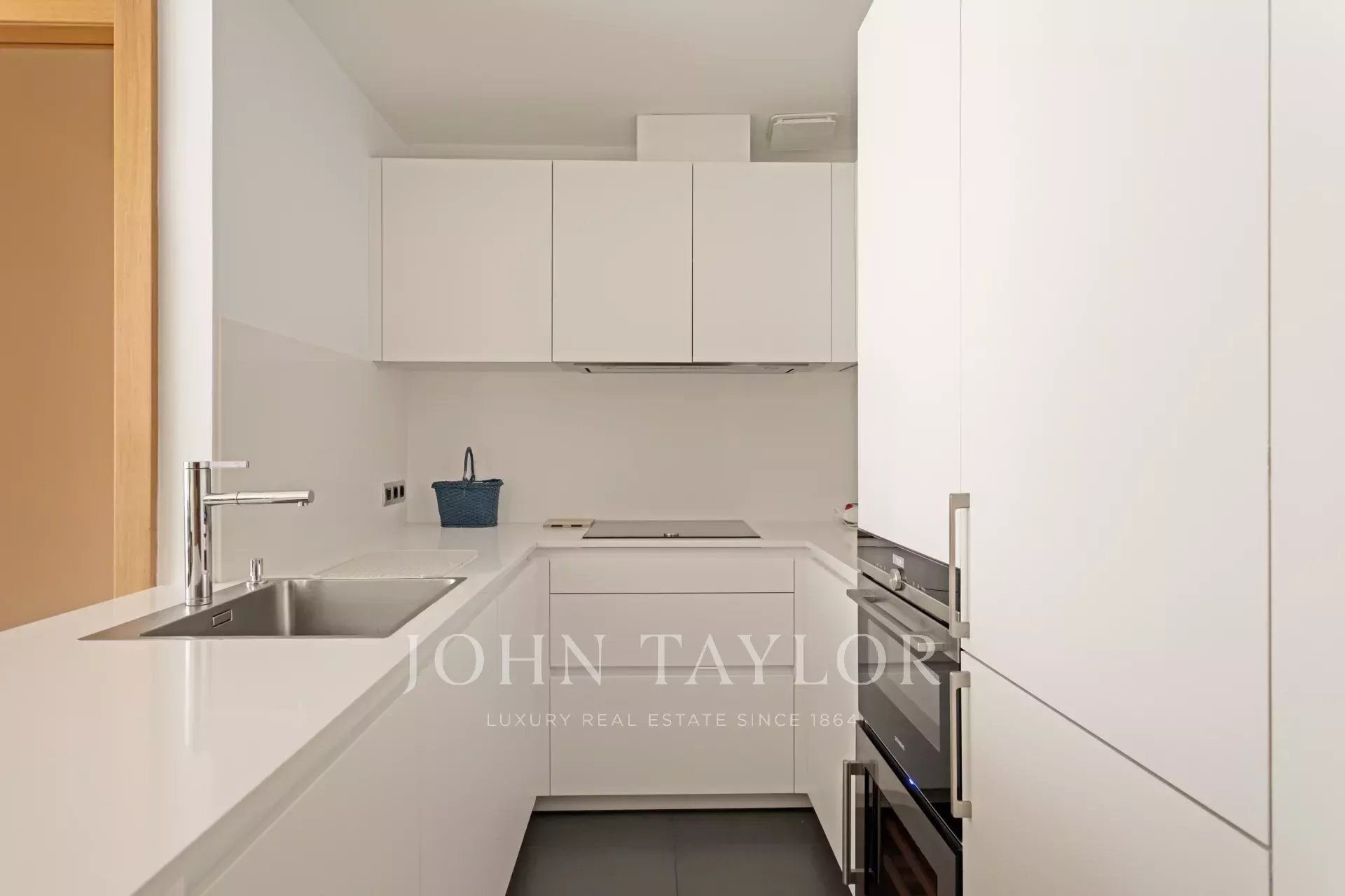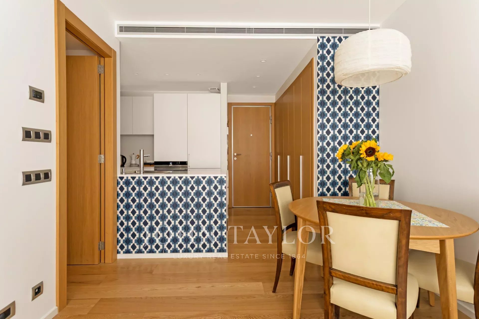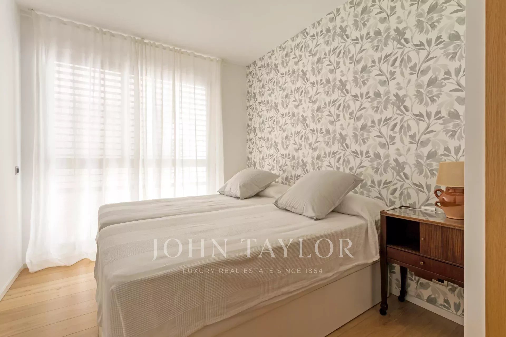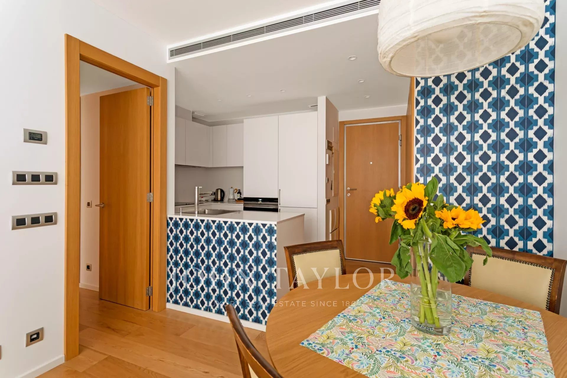 Эта квартира на 4-м этаже в здании 2018 года постройки имеет площадь 110 м² и состоит из светлой гостиной-столовой с кухней открытого плана, главной спальни со встроенными шкафами и ванной комнатой, еще одной спальни со встроенным шкафом и ванной комнаты напротив, которая также служит в качестве гостевого туалета.