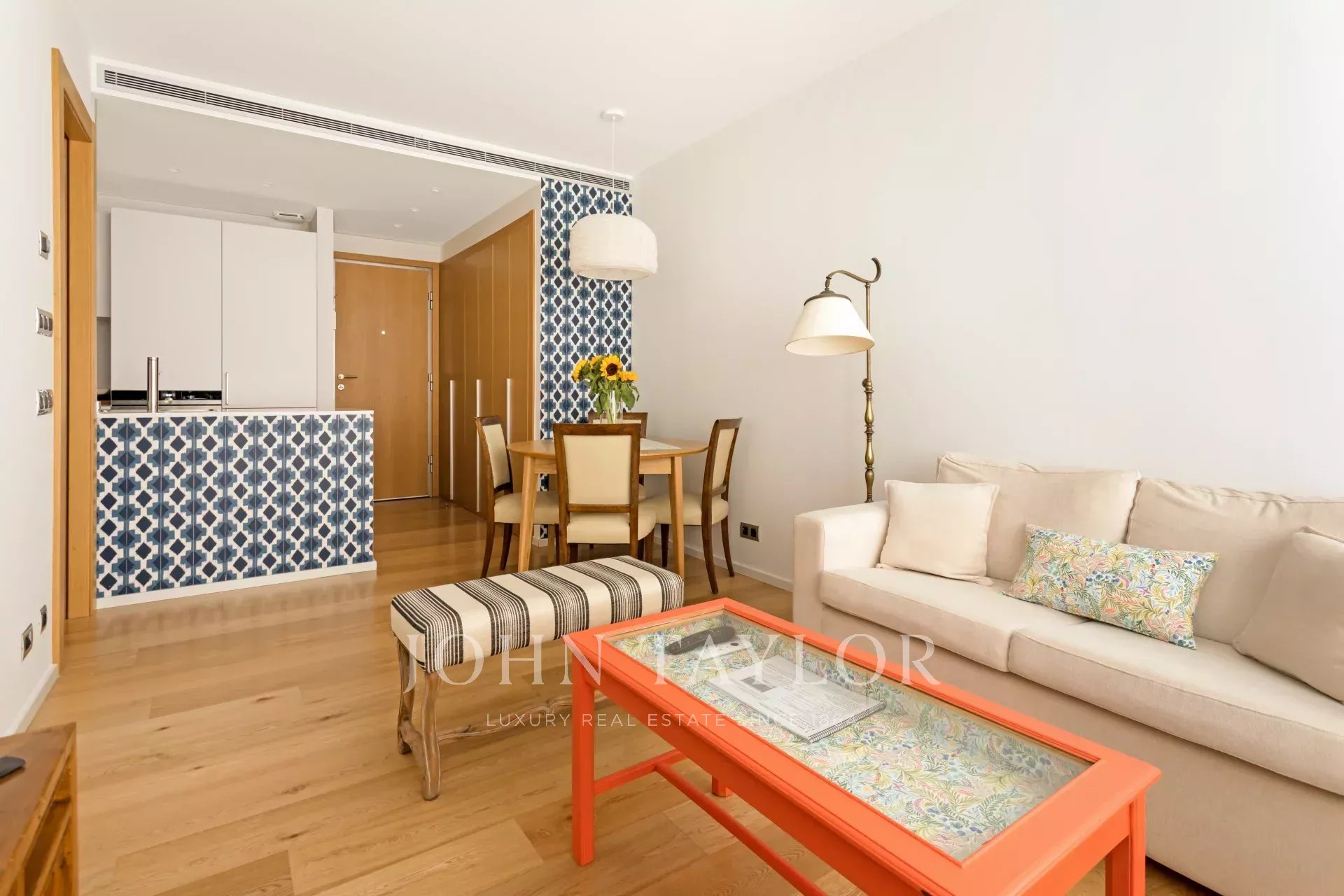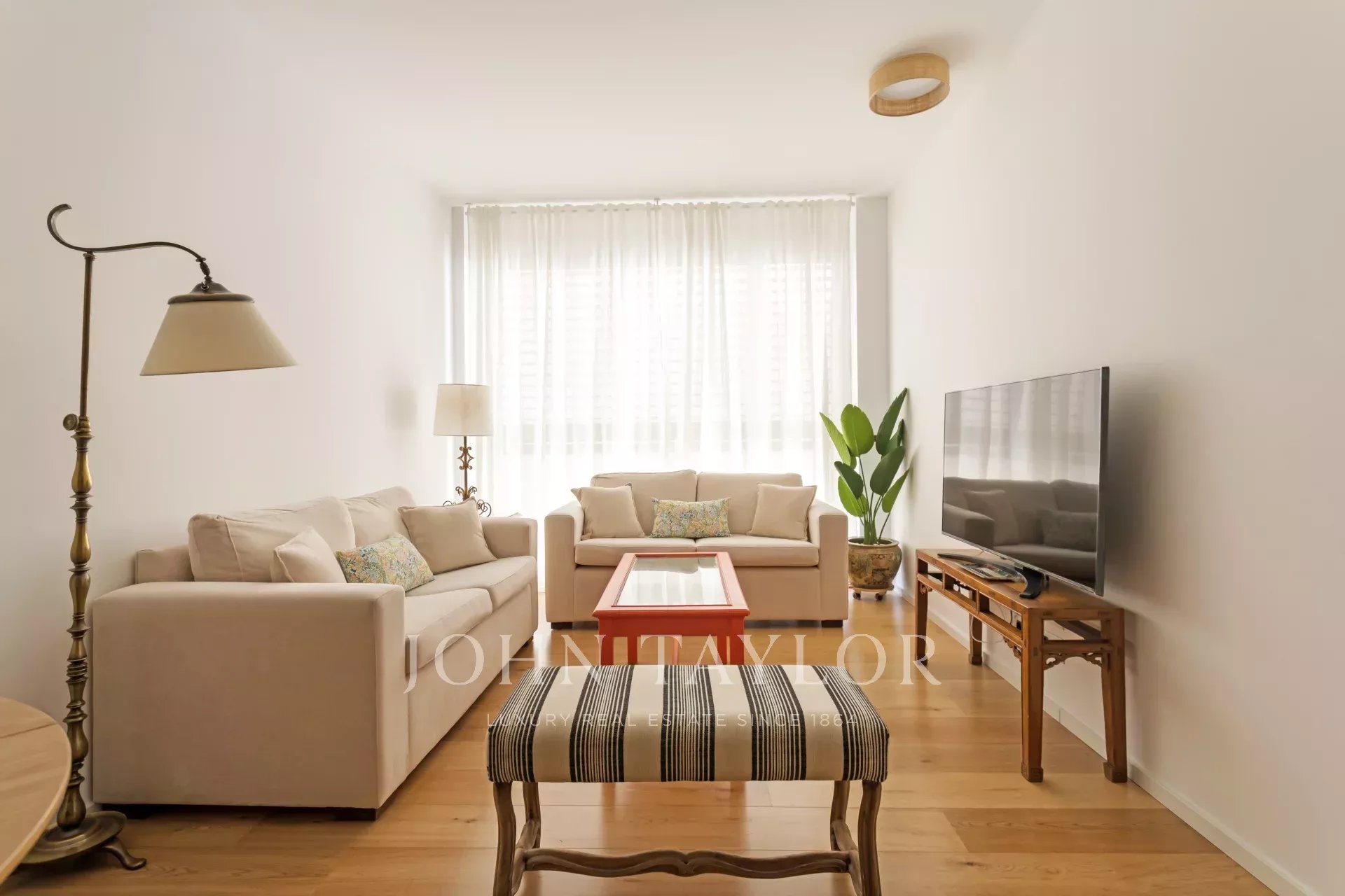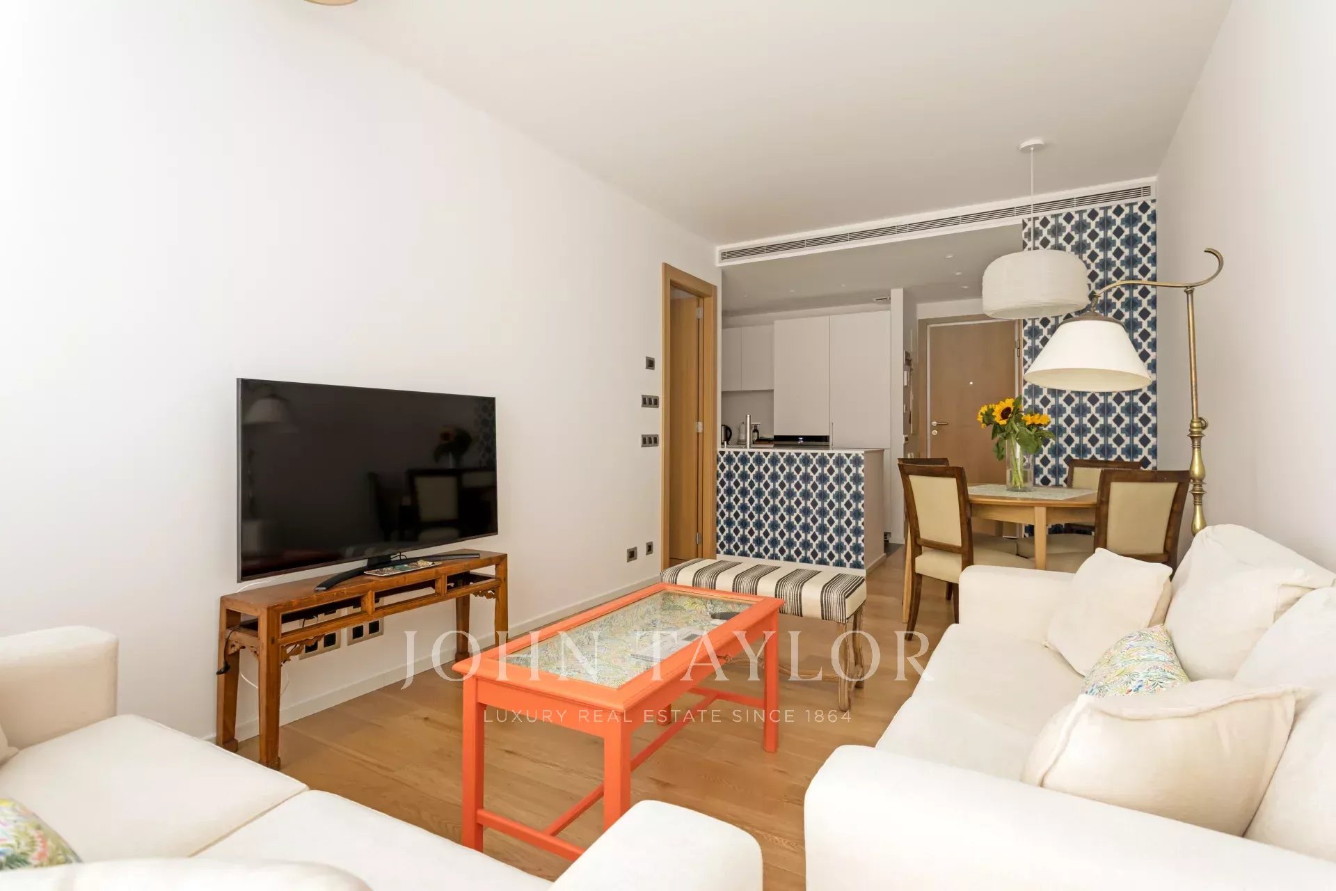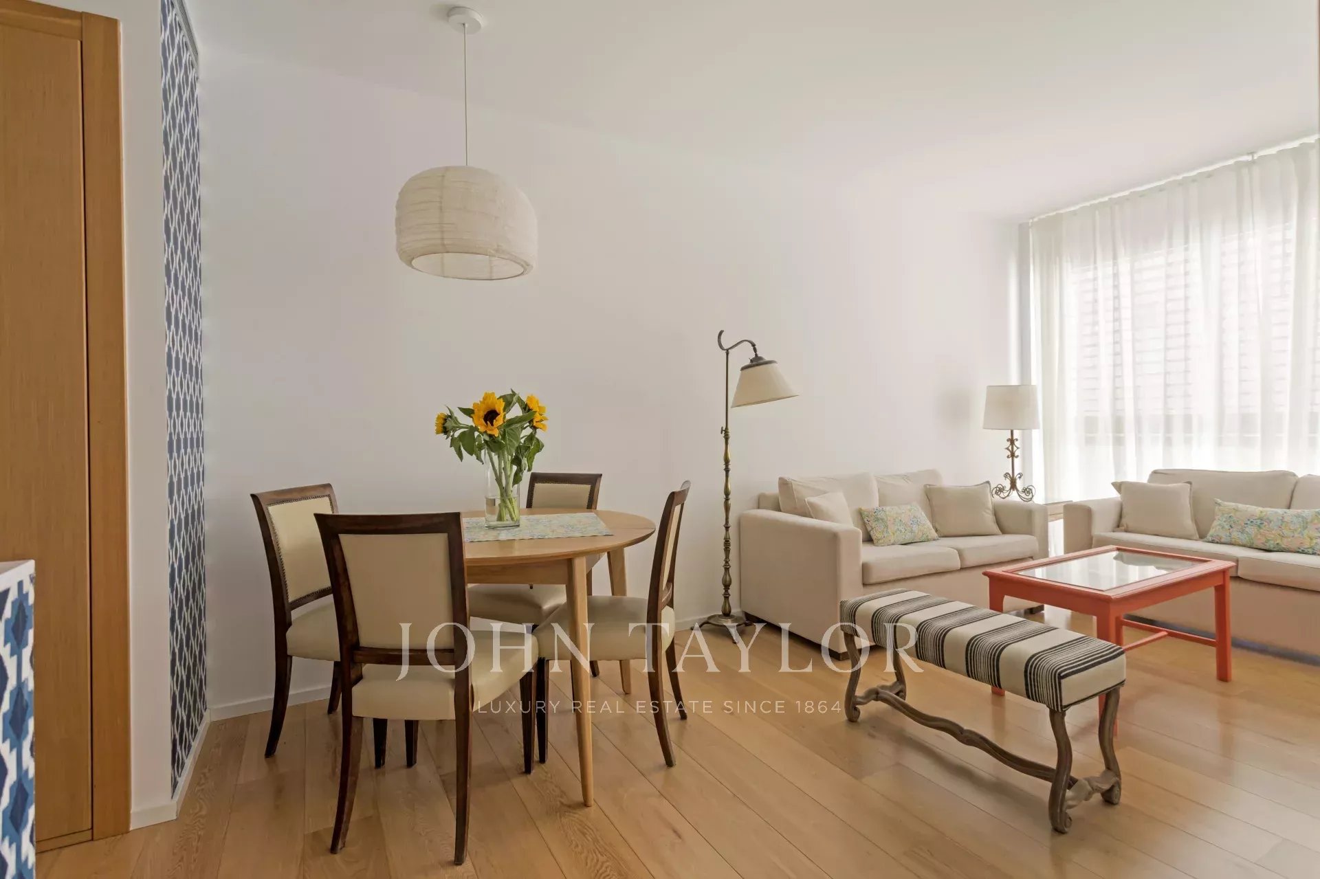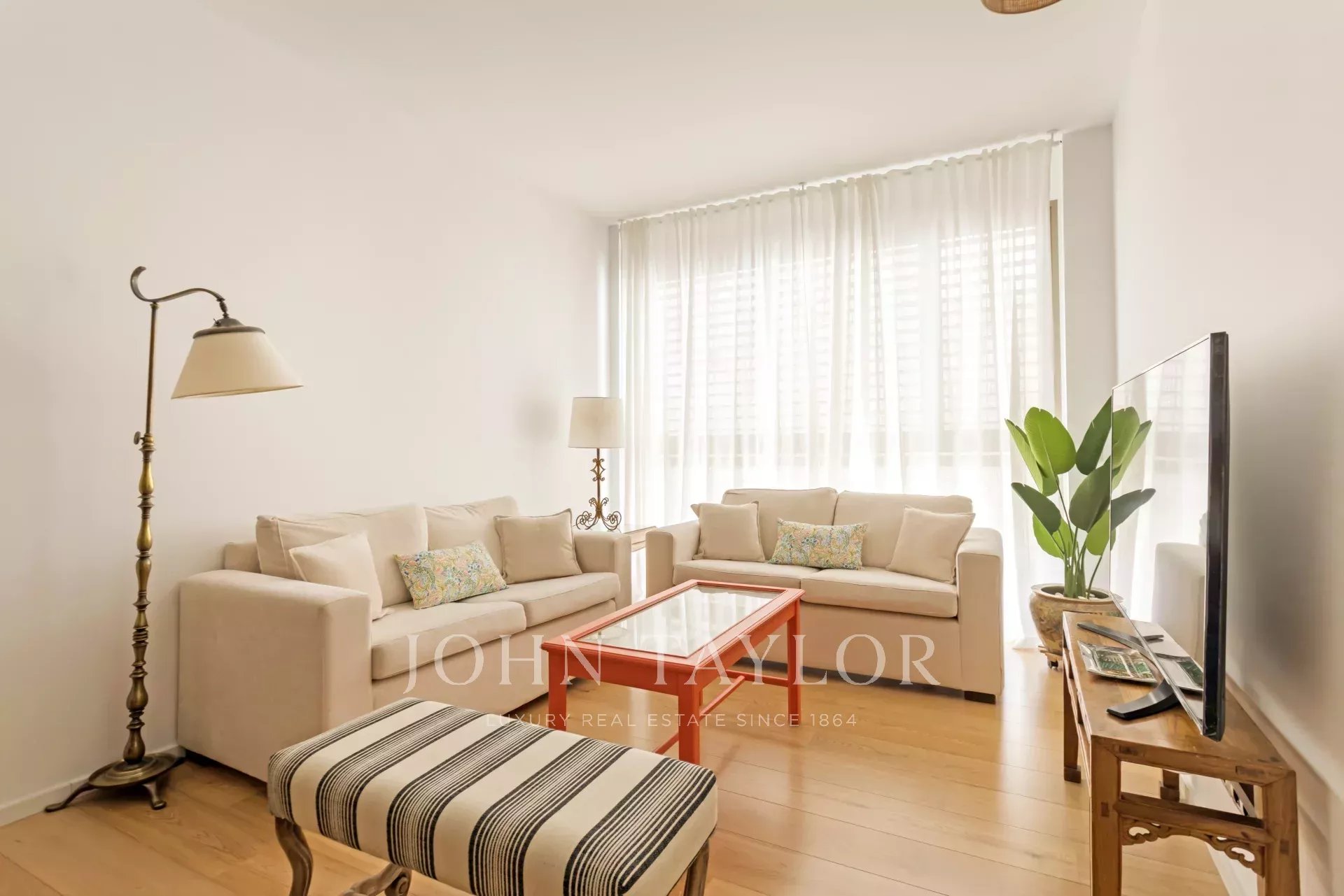 Эта квартира на 4-м этаже в здании 2018 года постройки имеет площадь 110 м² и состоит из светлой гостиной-столовой с кухней открытого плана, главной спальни со встроенными шкафами и ванной комнатой, еще одной спальни со встроенным шкафом и ванной комнаты напротив, которая также служит в качестве гостевого туалета.