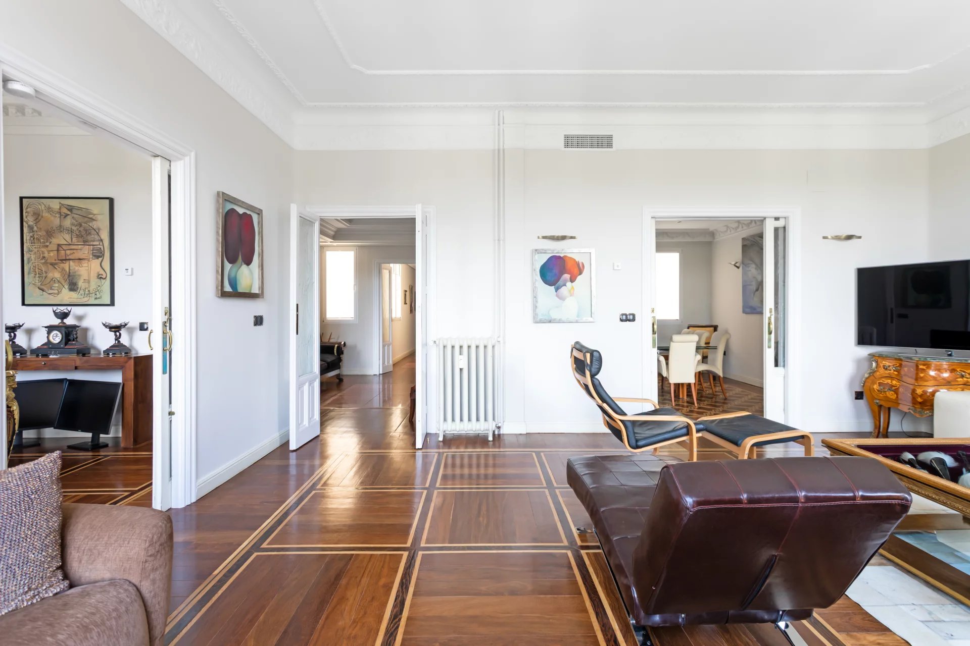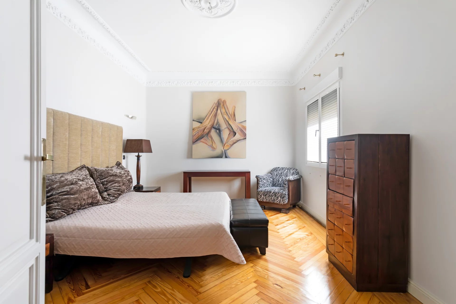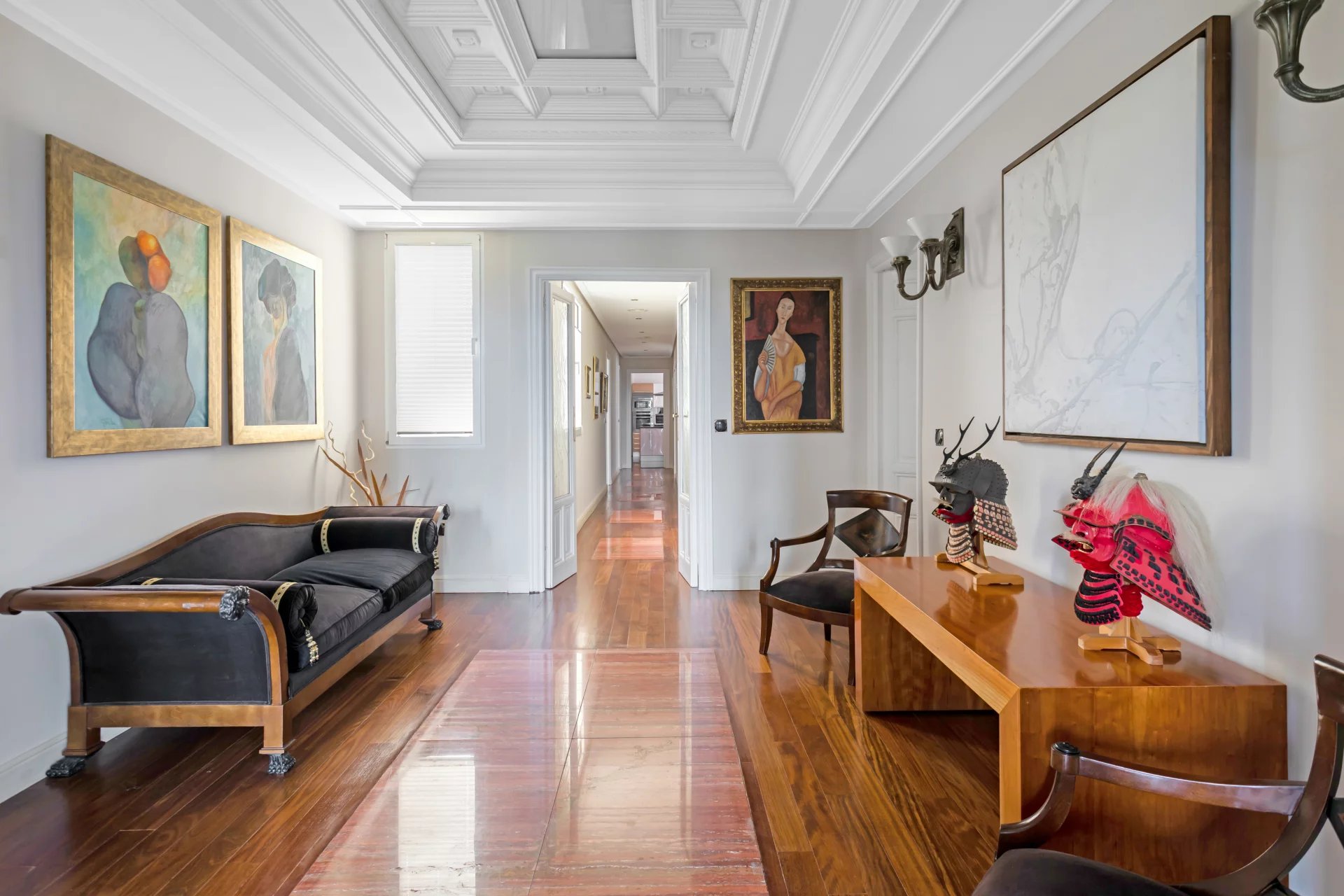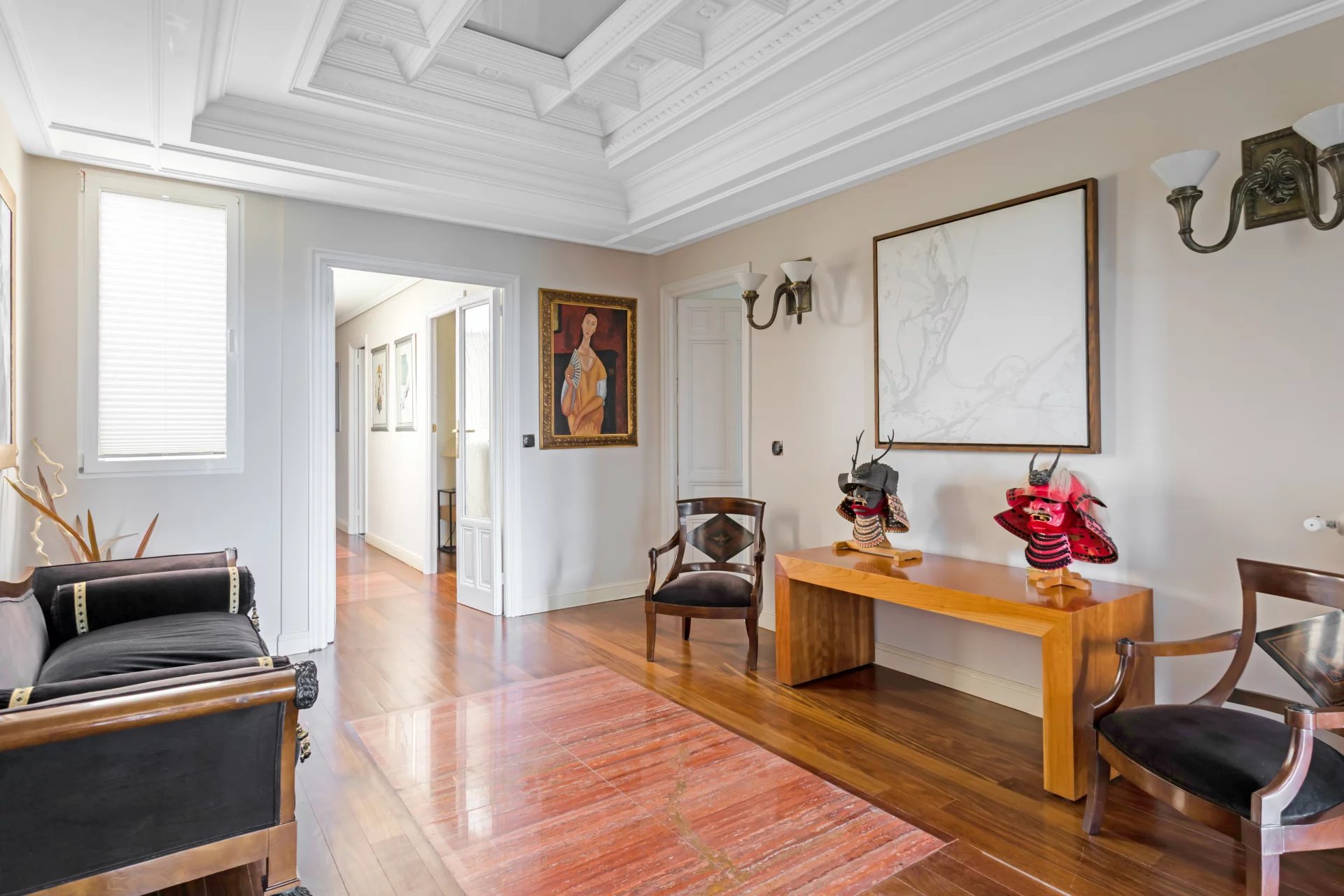 Эта квартира идеально расположена на пятом этаже одного из самых представительных классических зданий в районе Иеронимос, в двух шагах от музея Прадо.