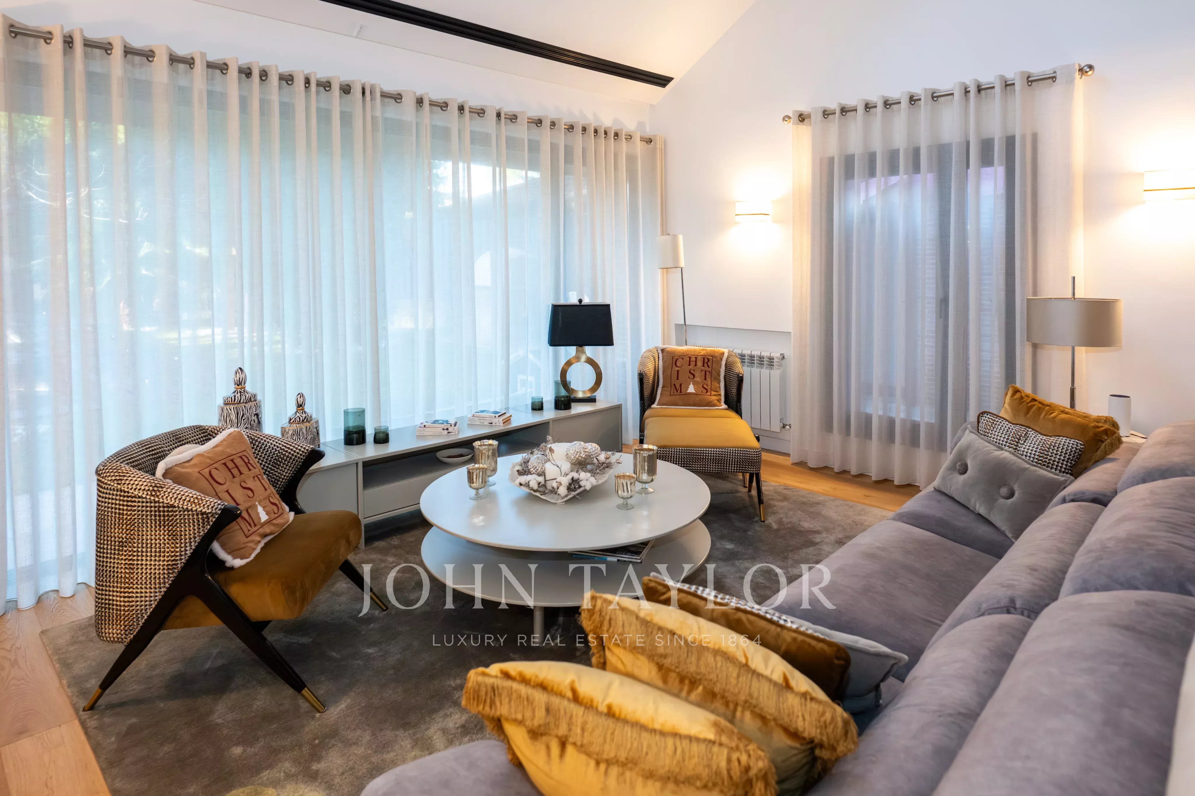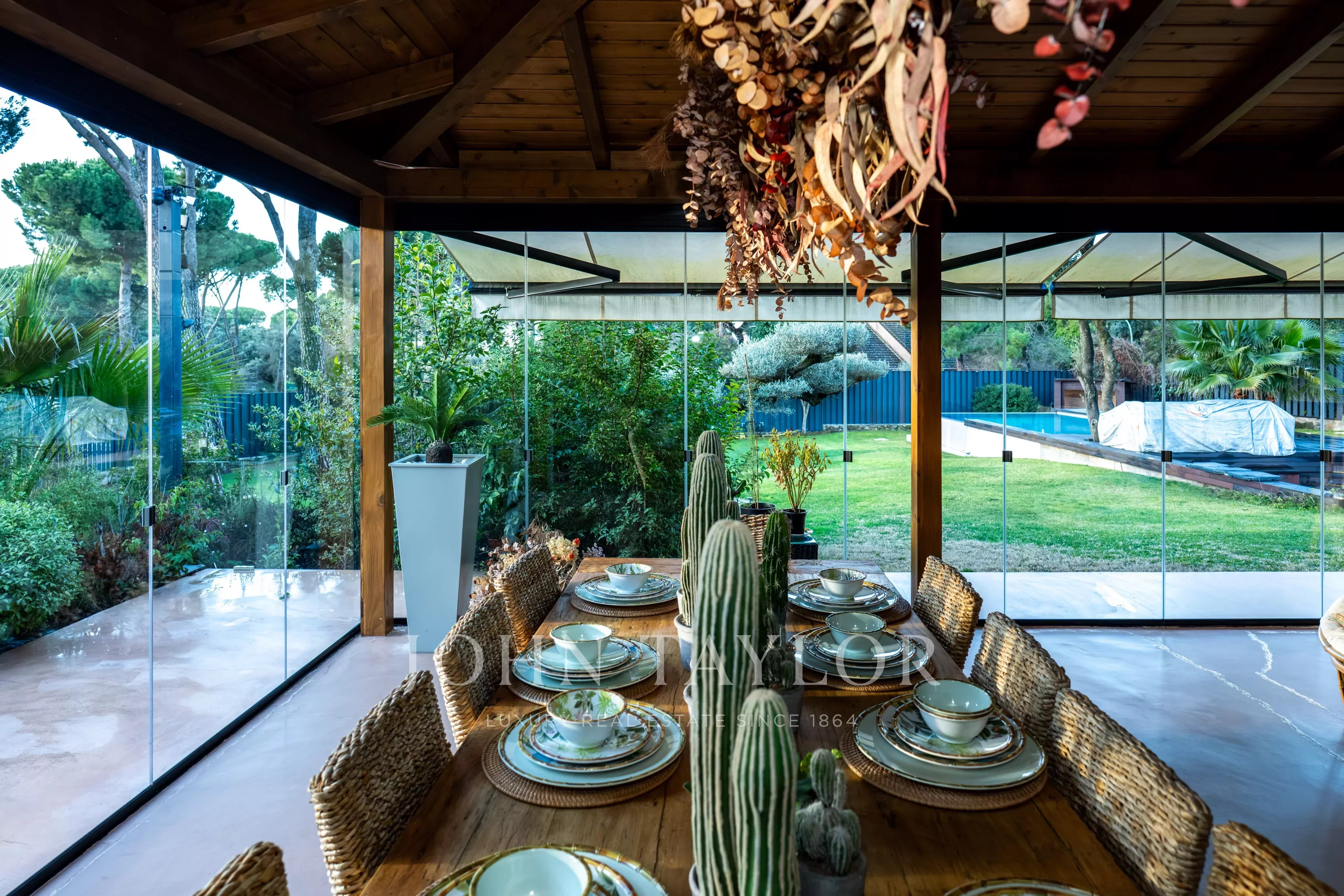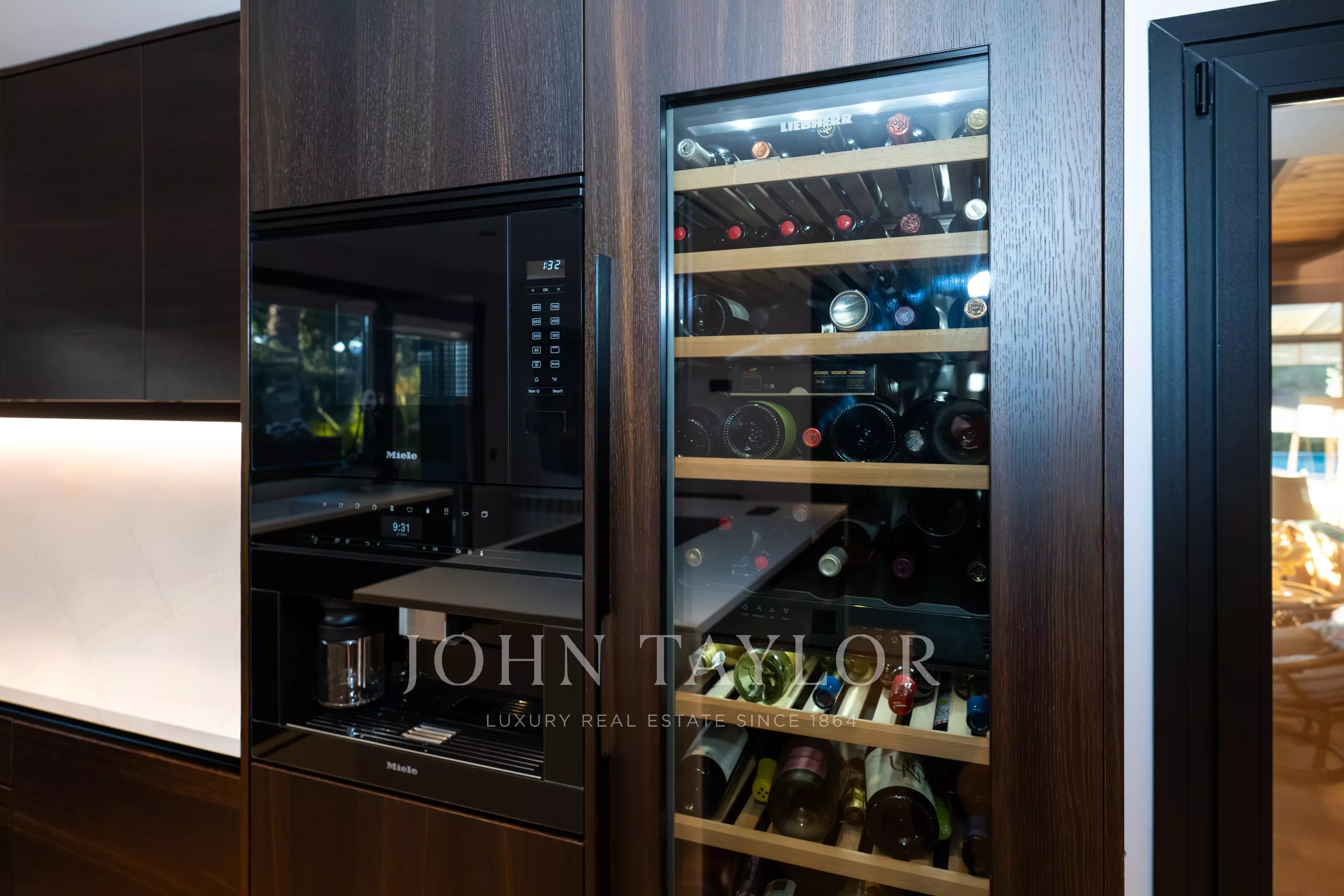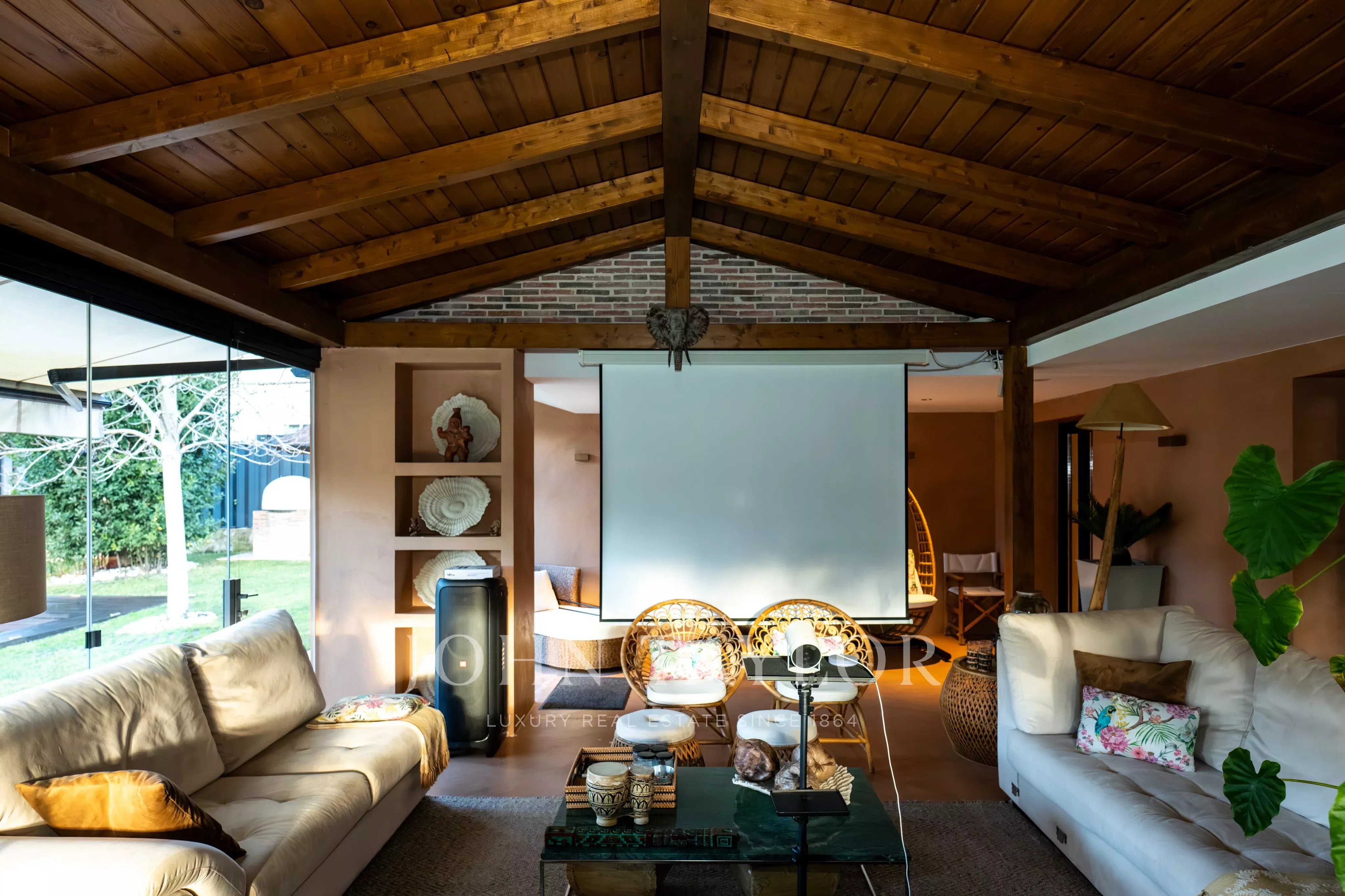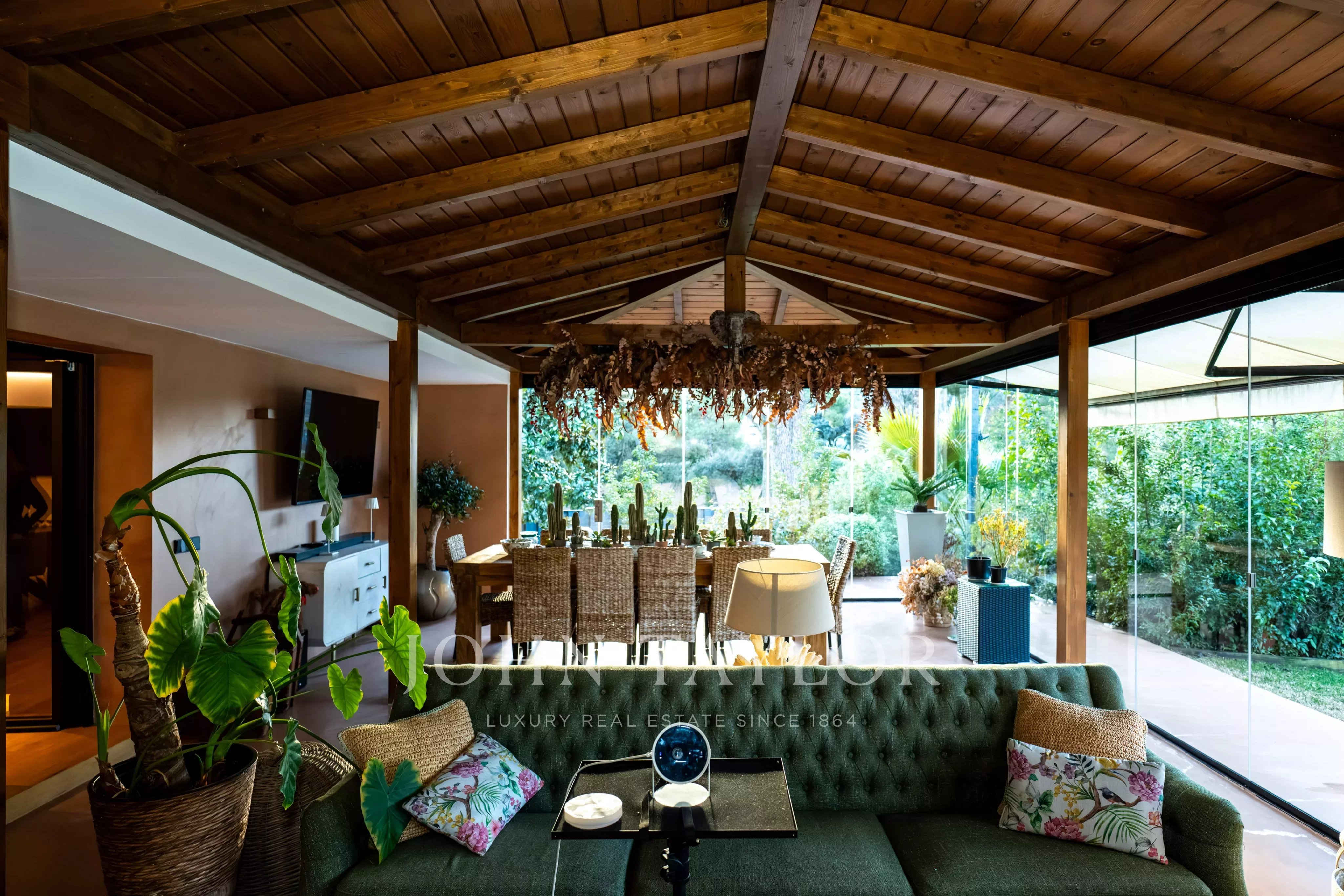 Вилла распределена на два этажа и отличается большими площадями, высокими потолками, обилием естественного света и функциональной планировкой. Основная жилая зона включает просторную гостиную с камином и прямым выходом в сад. Полностью оборудованная кухня имеет большие размеры и идеально подходит как для повседневного проживания, так и для приёма гостей, дополняется закрытой и кондиционируемой зоной, предназначенной для встреч и мероприятий в любое время года.