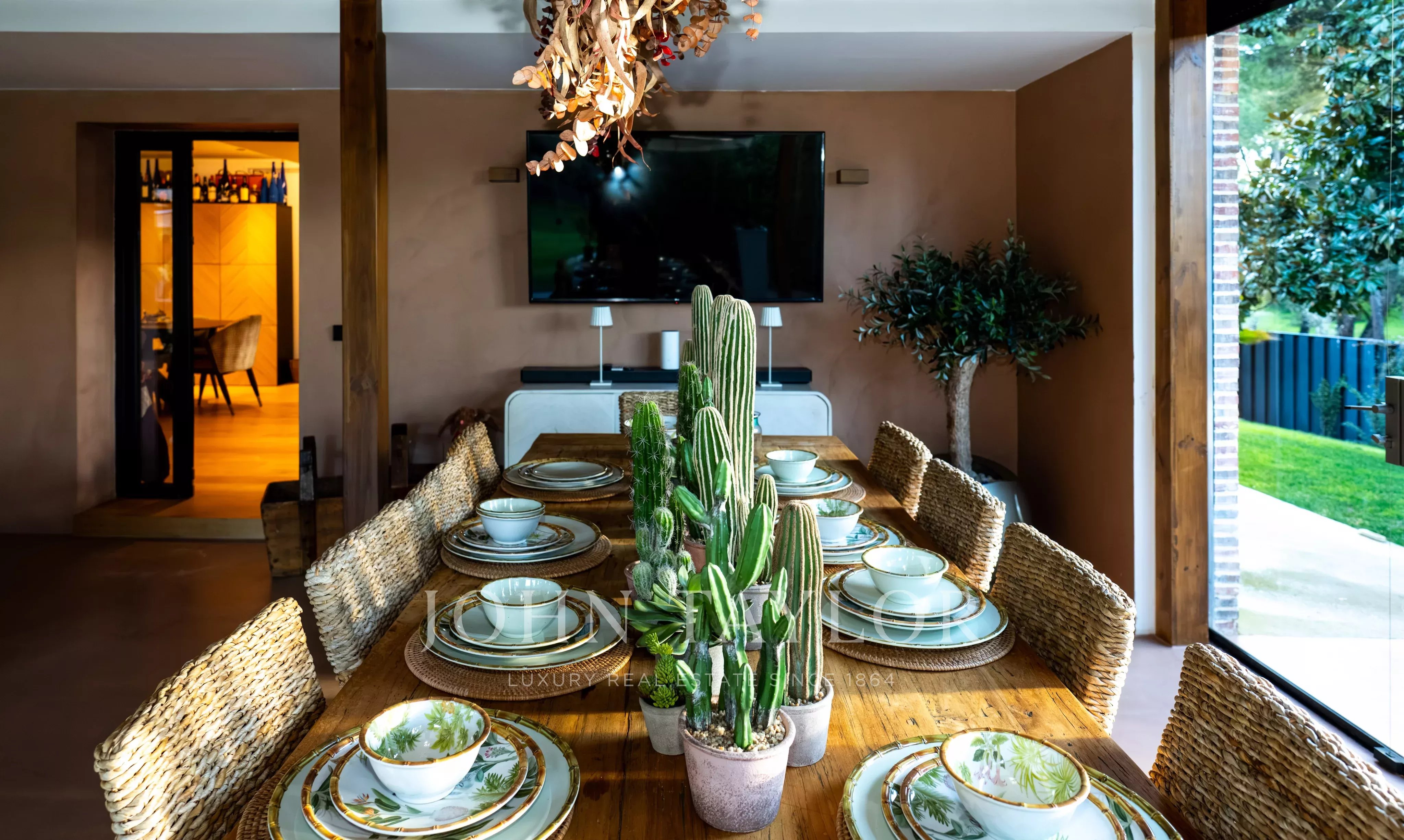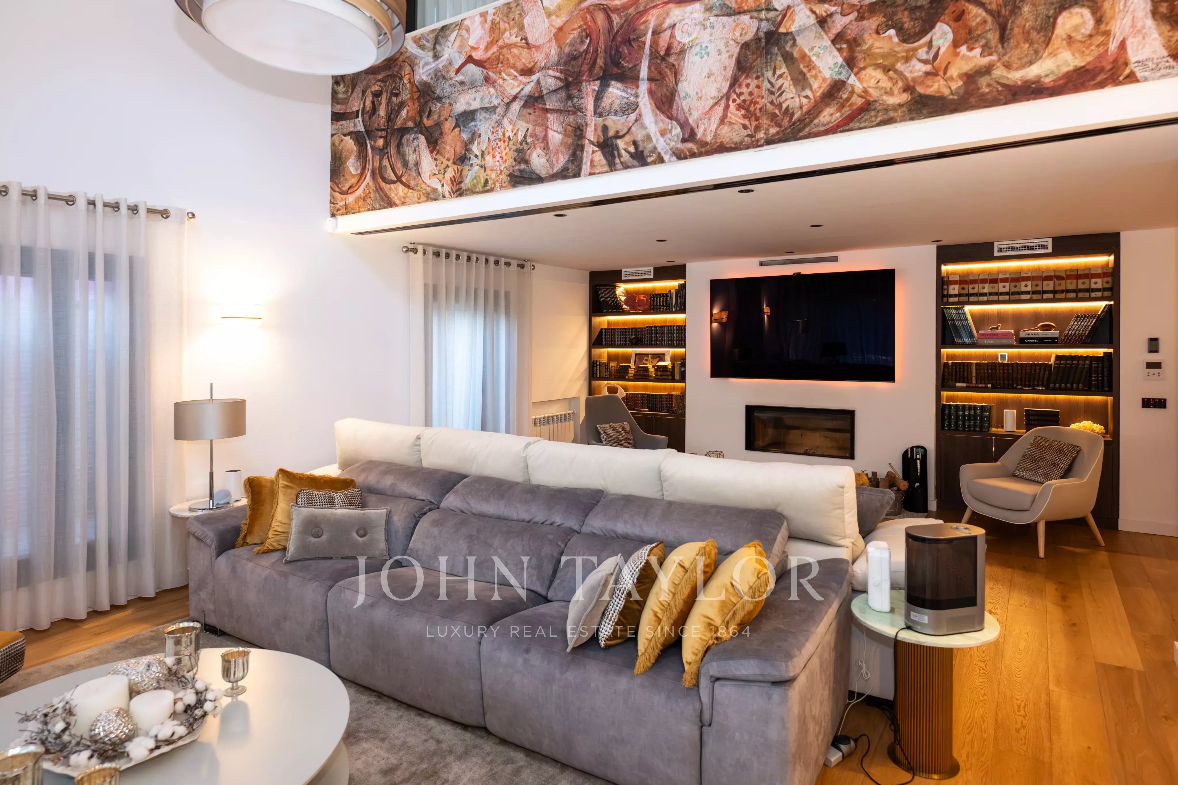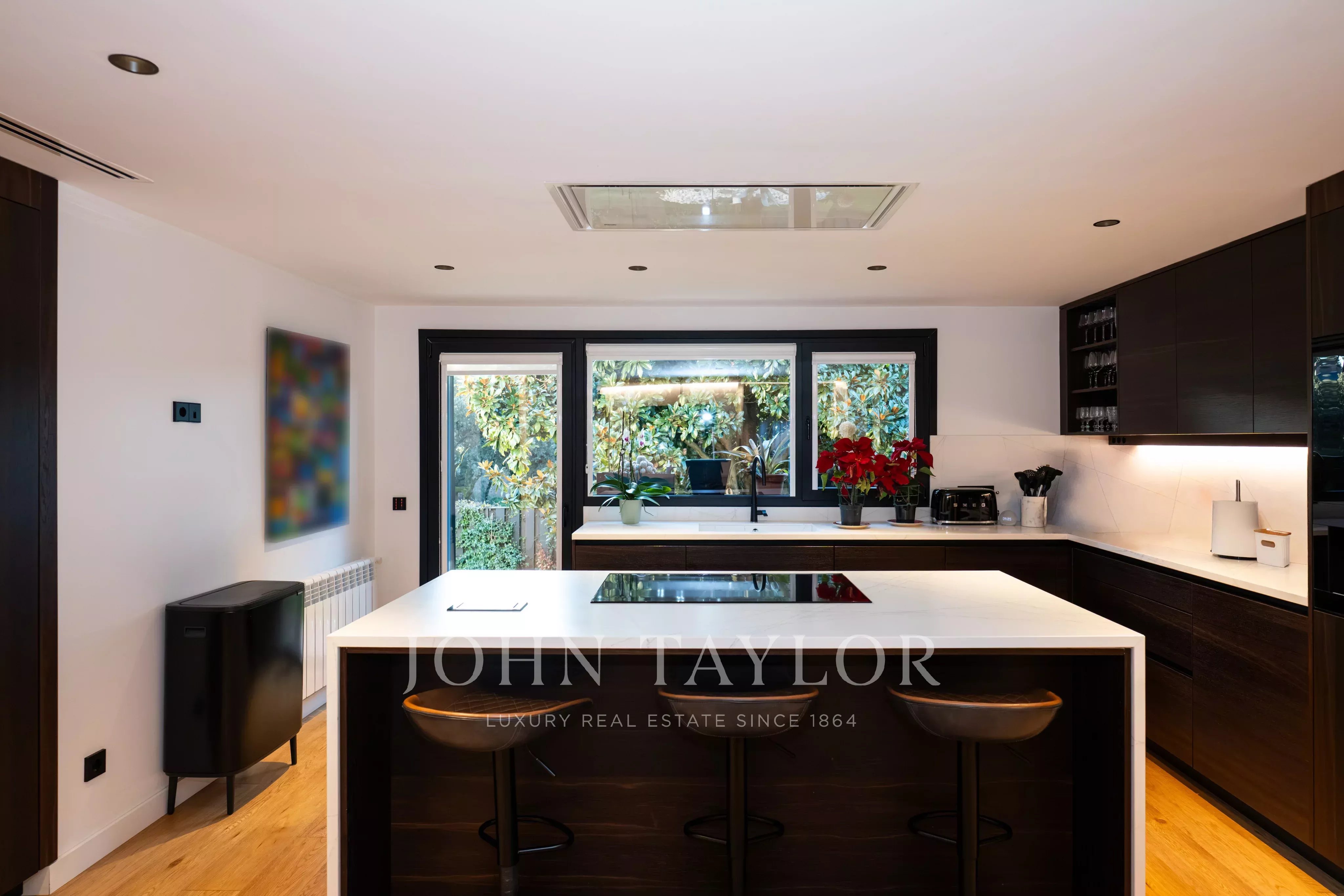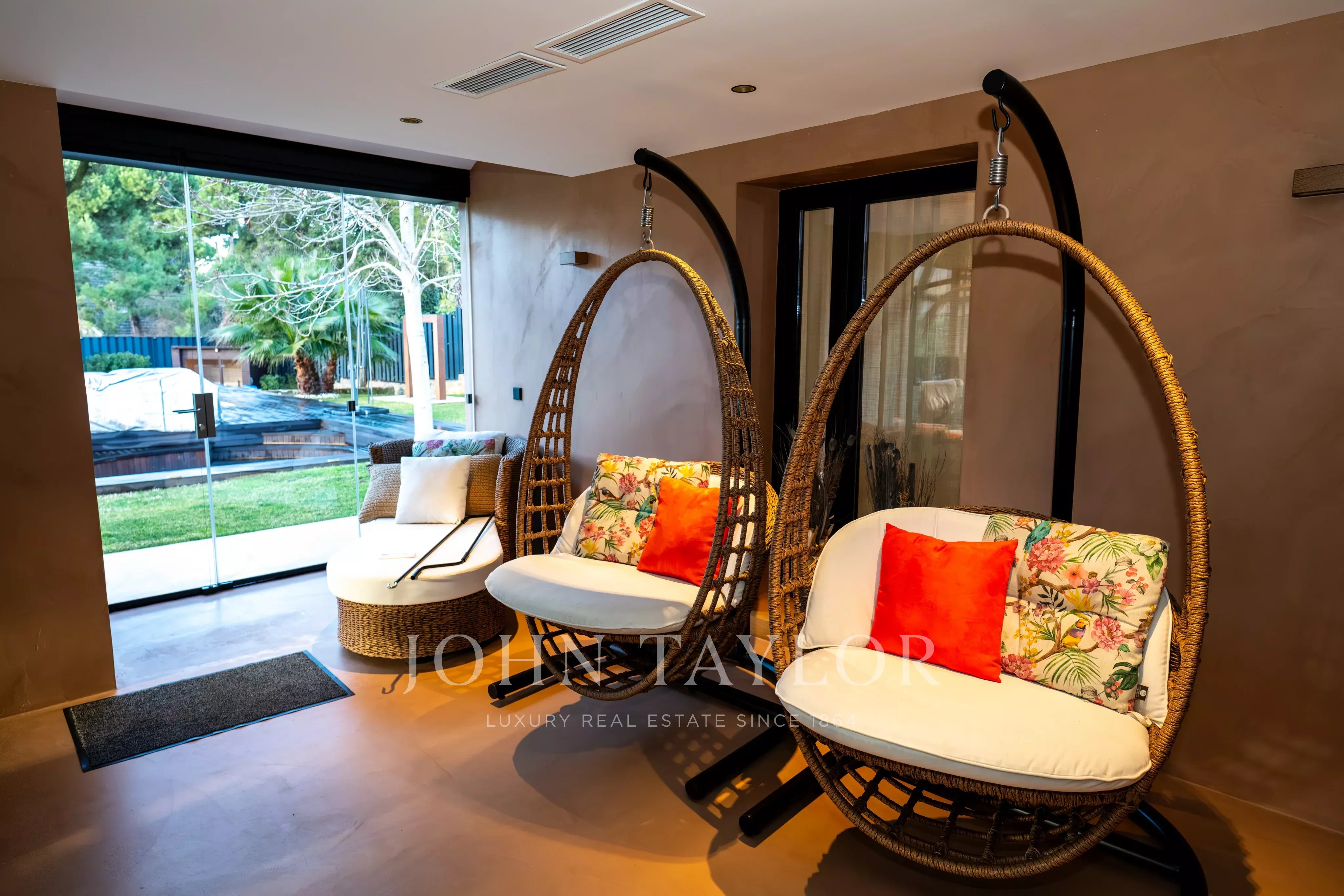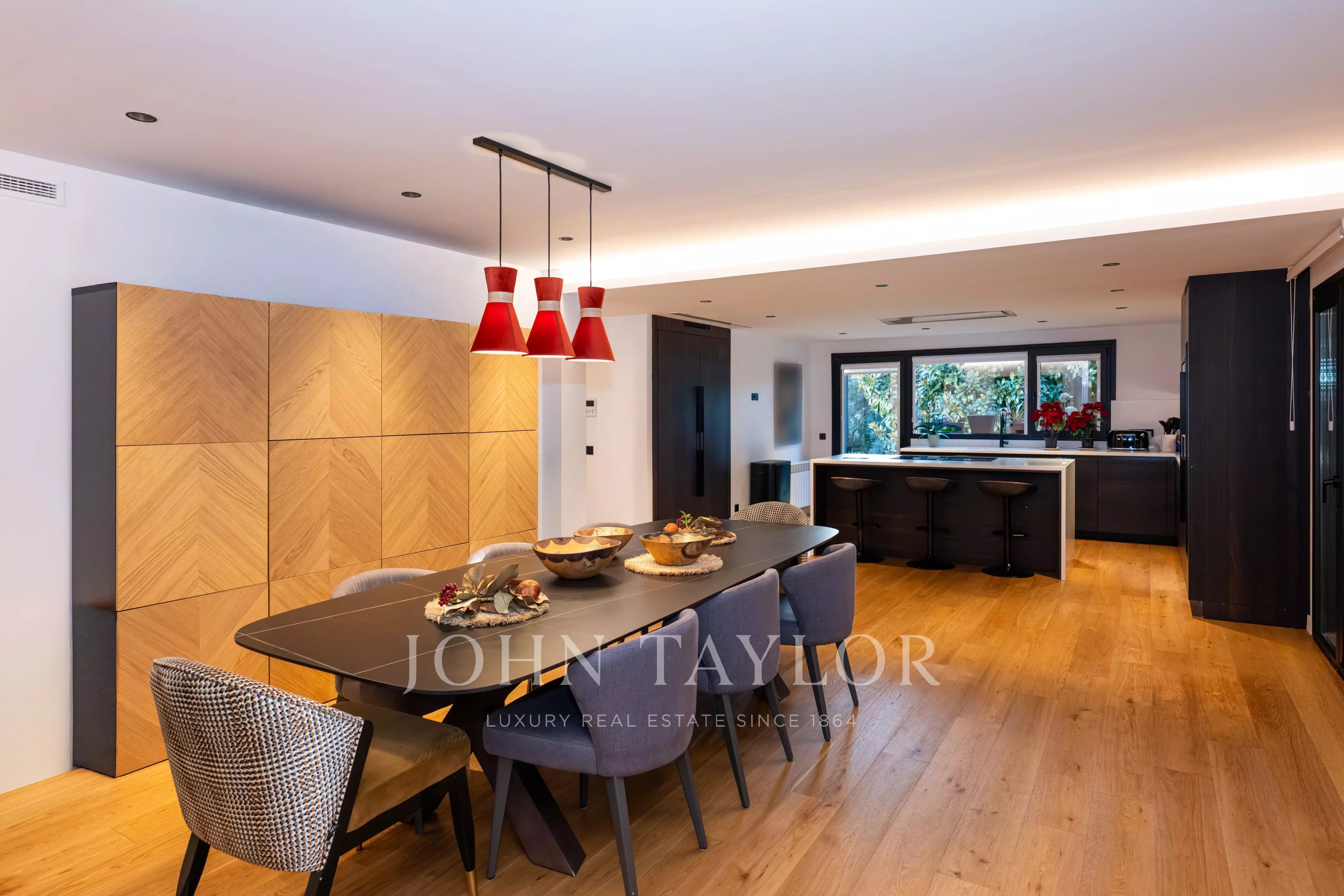 Вилла распределена на два этажа и отличается большими площадями, высокими потолками, обилием естественного света и функциональной планировкой. Основная жилая зона включает просторную гостиную с камином и прямым выходом в сад. Полностью оборудованная кухня имеет большие размеры и идеально подходит как для повседневного проживания, так и для приёма гостей, дополняется закрытой и кондиционируемой зоной, предназначенной для встреч и мероприятий в любое время года.