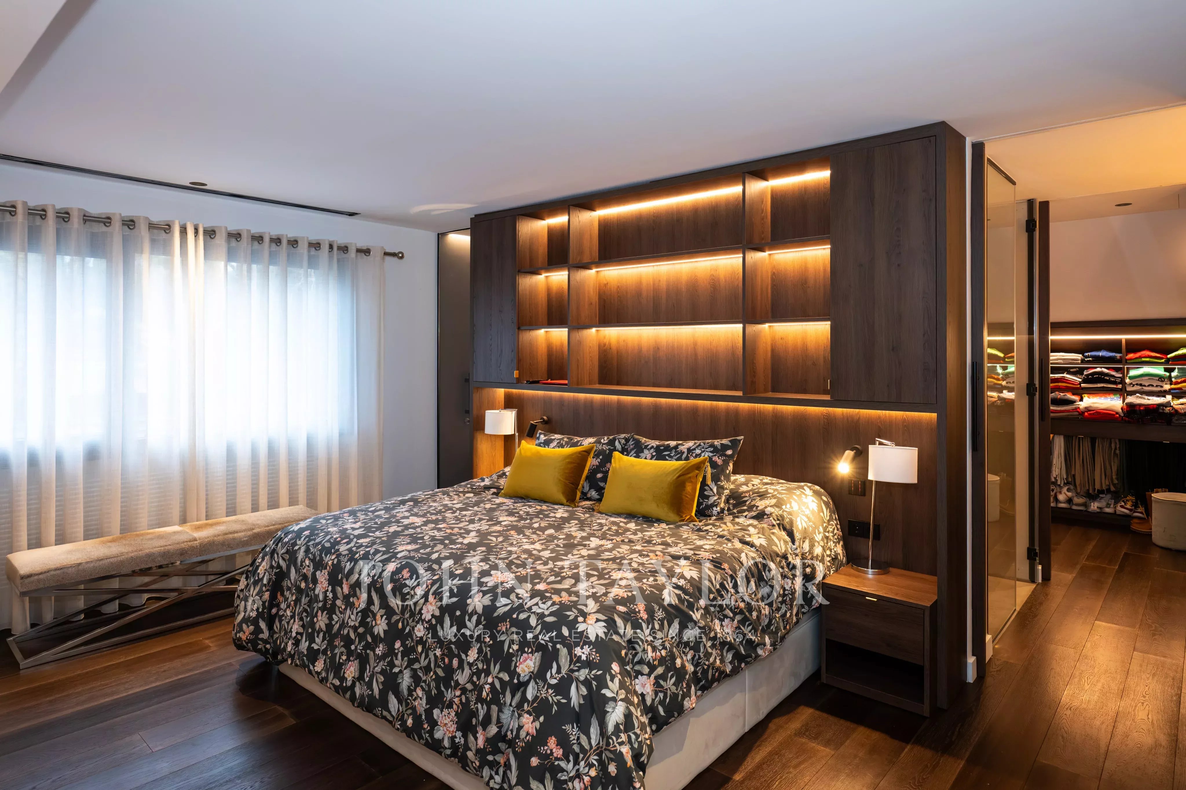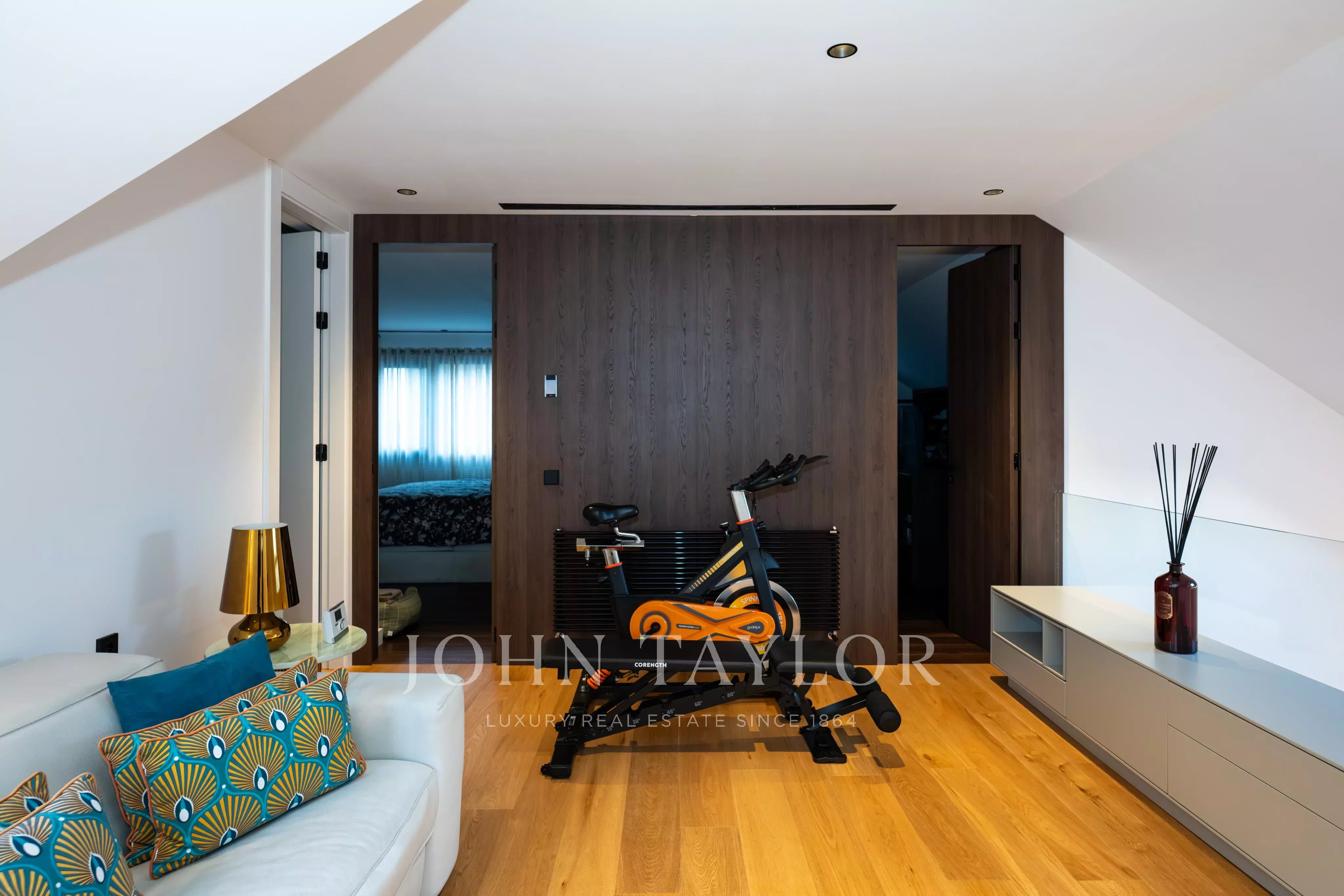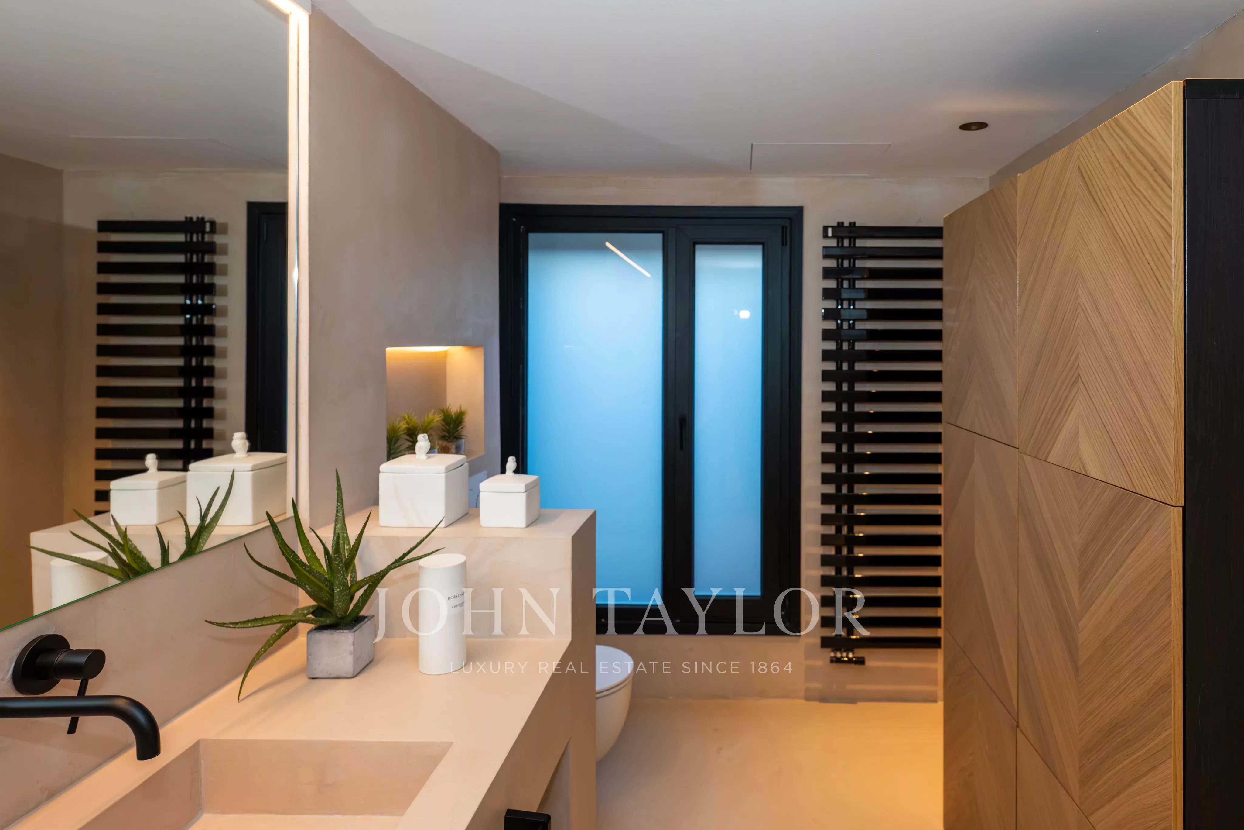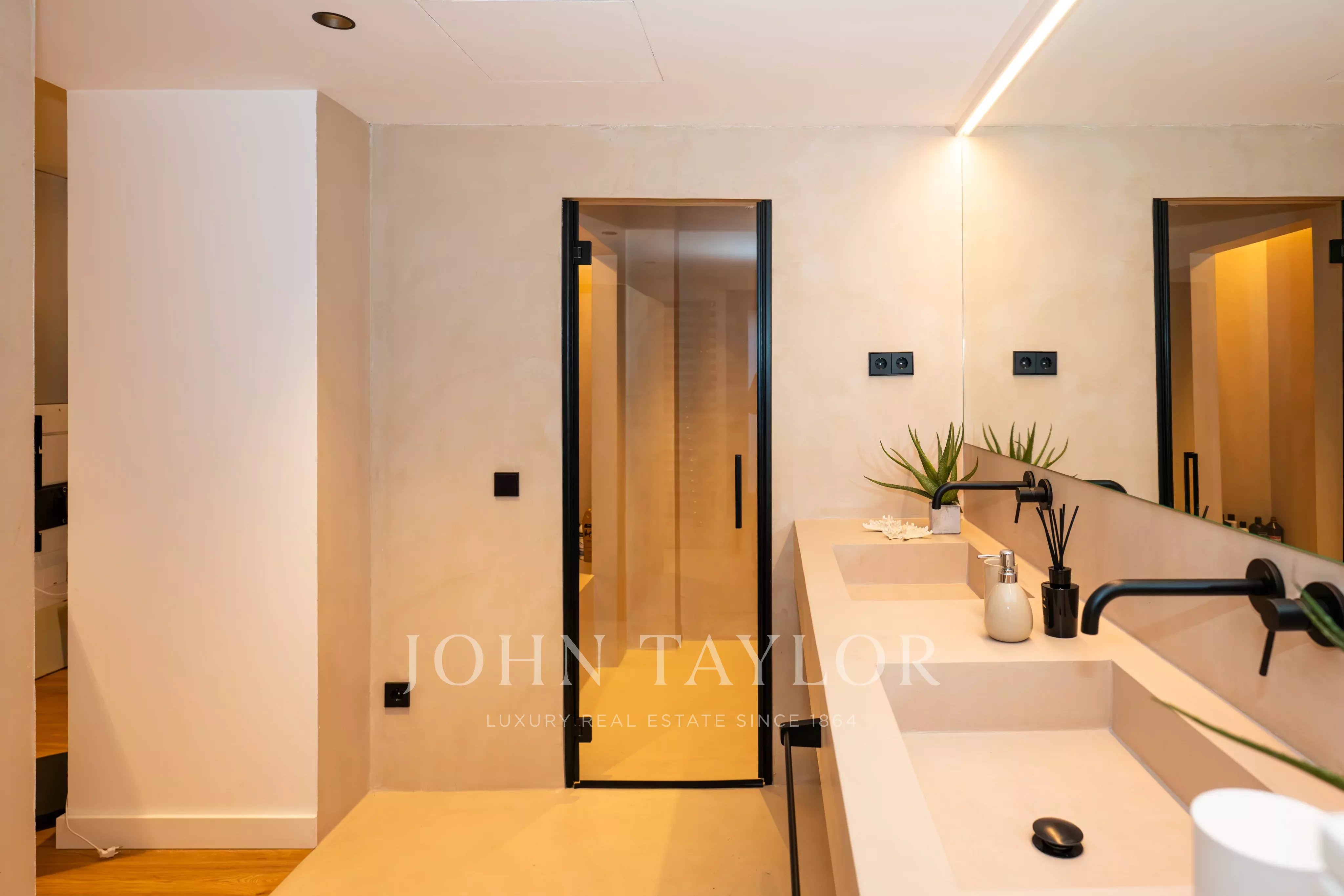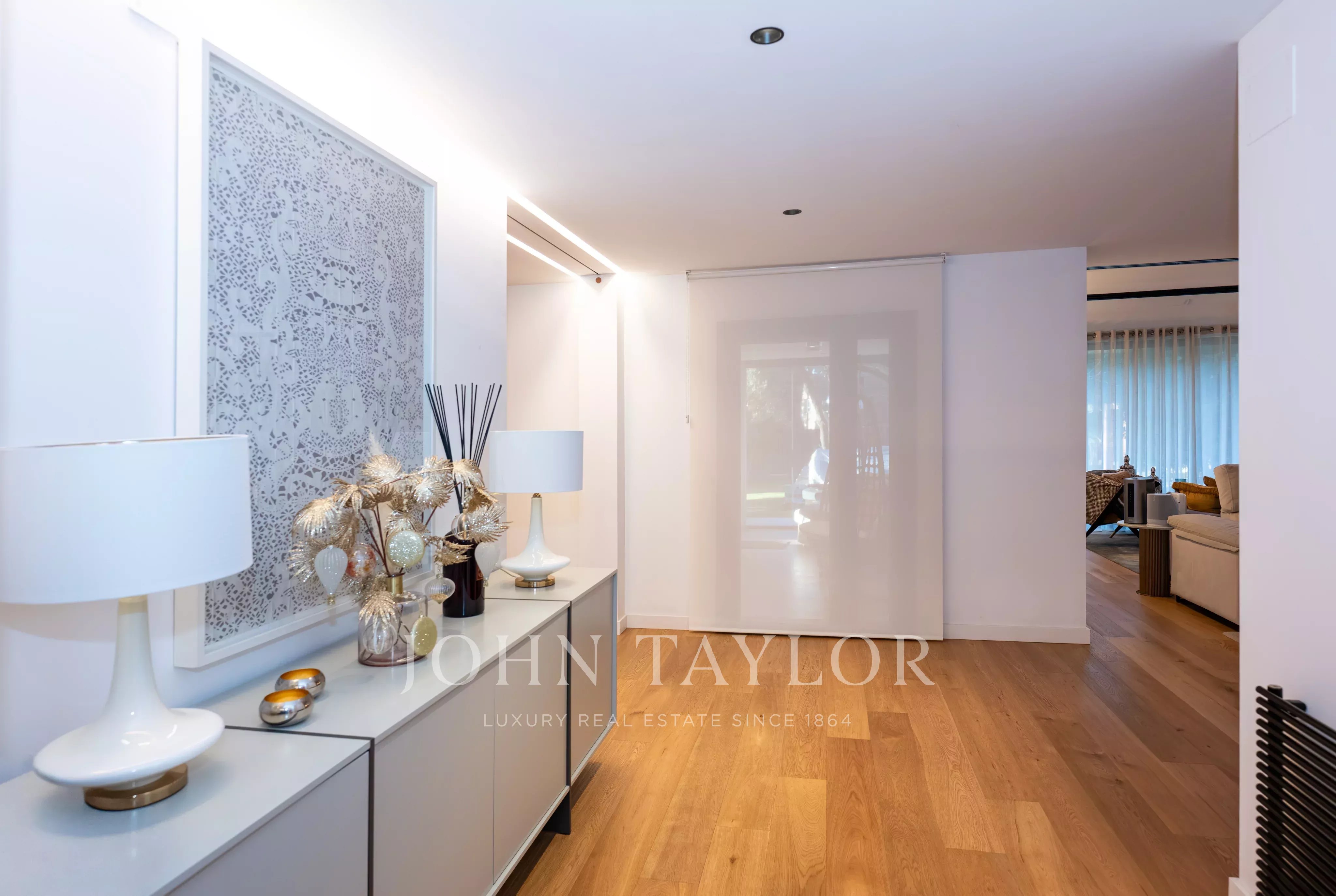 Вилла распределена на два этажа и отличается большими площадями, высокими потолками, обилием естественного света и функциональной планировкой. Основная жилая зона включает просторную гостиную с камином и прямым выходом в сад. Полностью оборудованная кухня имеет большие размеры и идеально подходит как для повседневного проживания, так и для приёма гостей, дополняется закрытой и кондиционируемой зоной, предназначенной для встреч и мероприятий в любое время года.