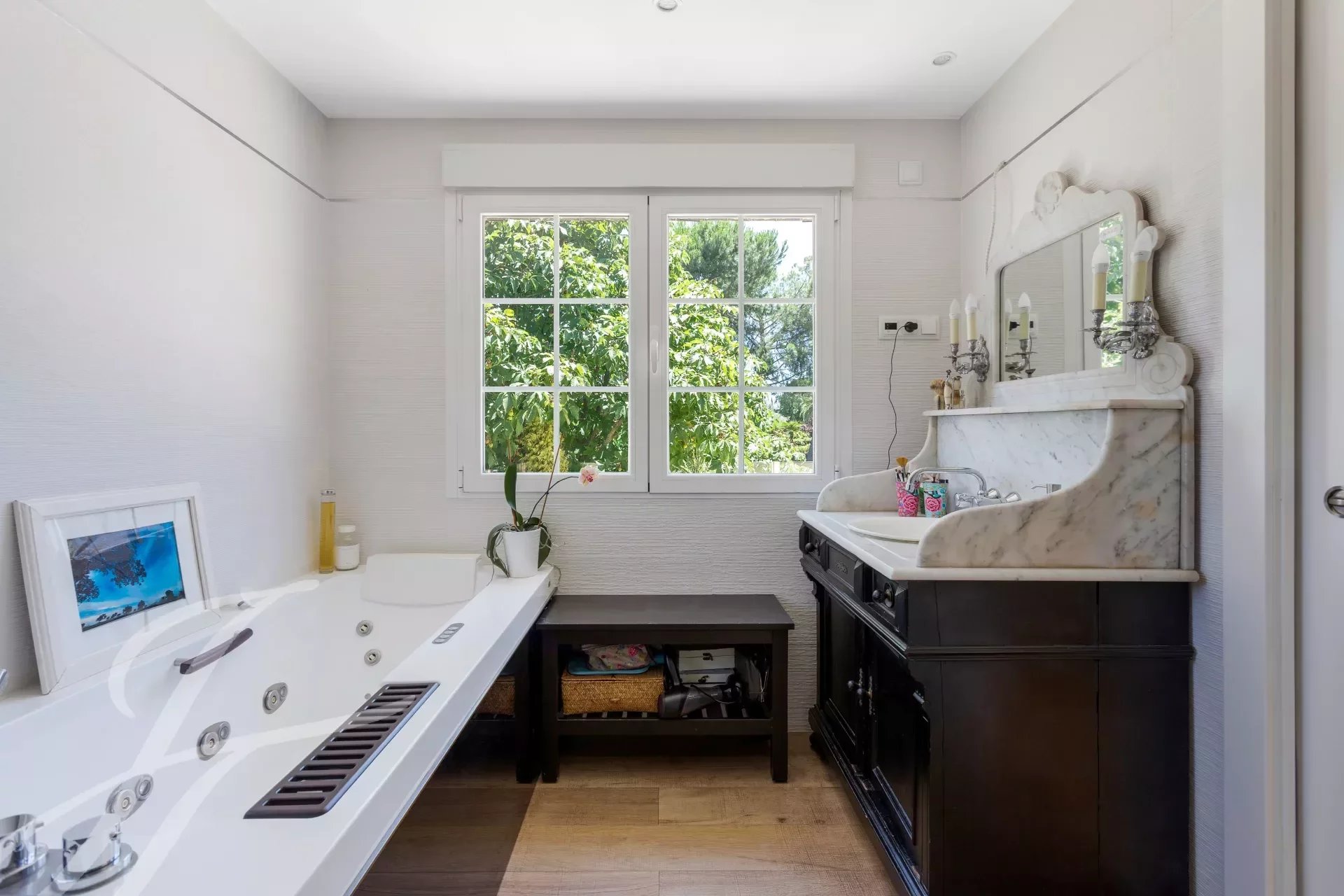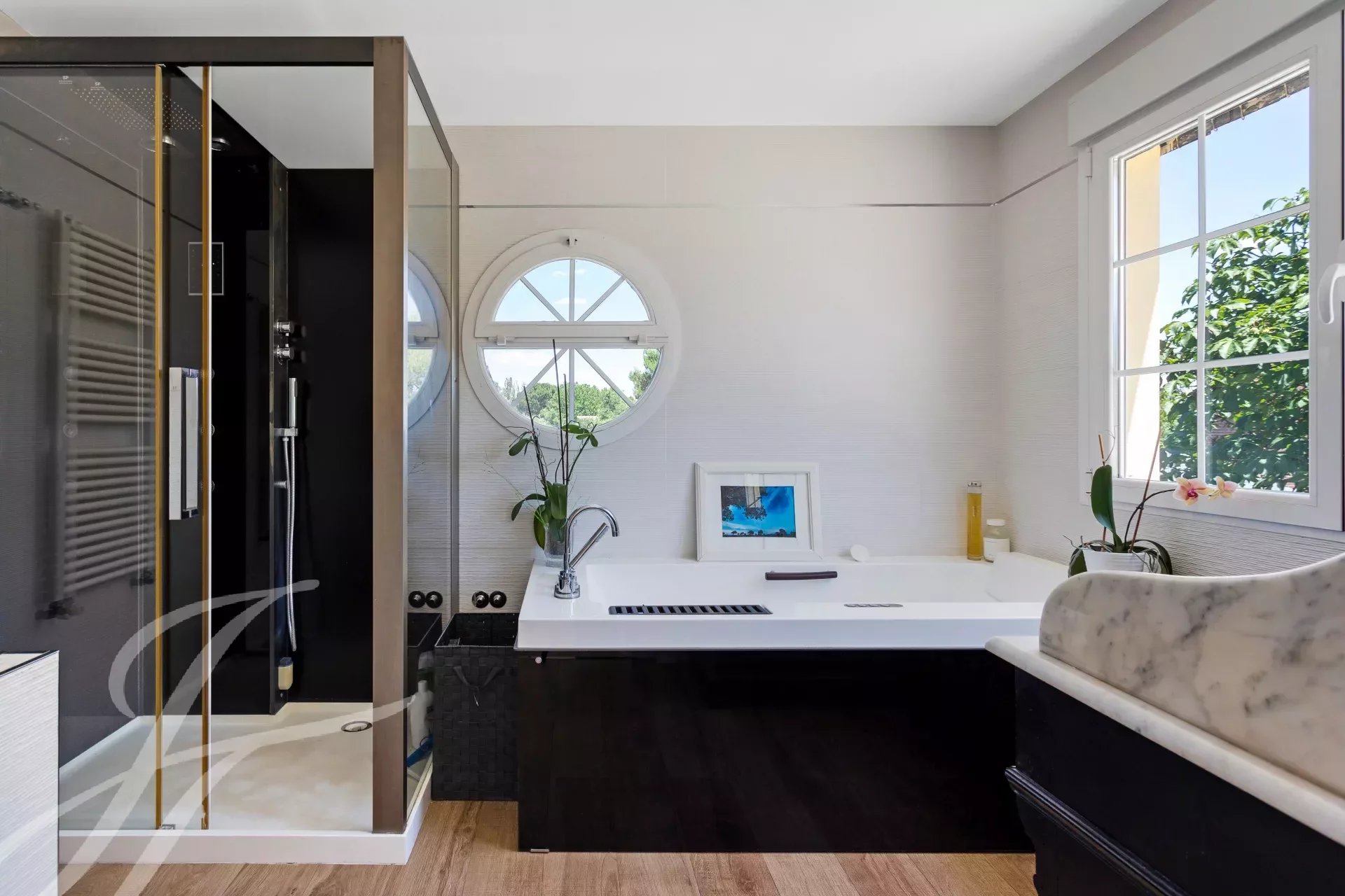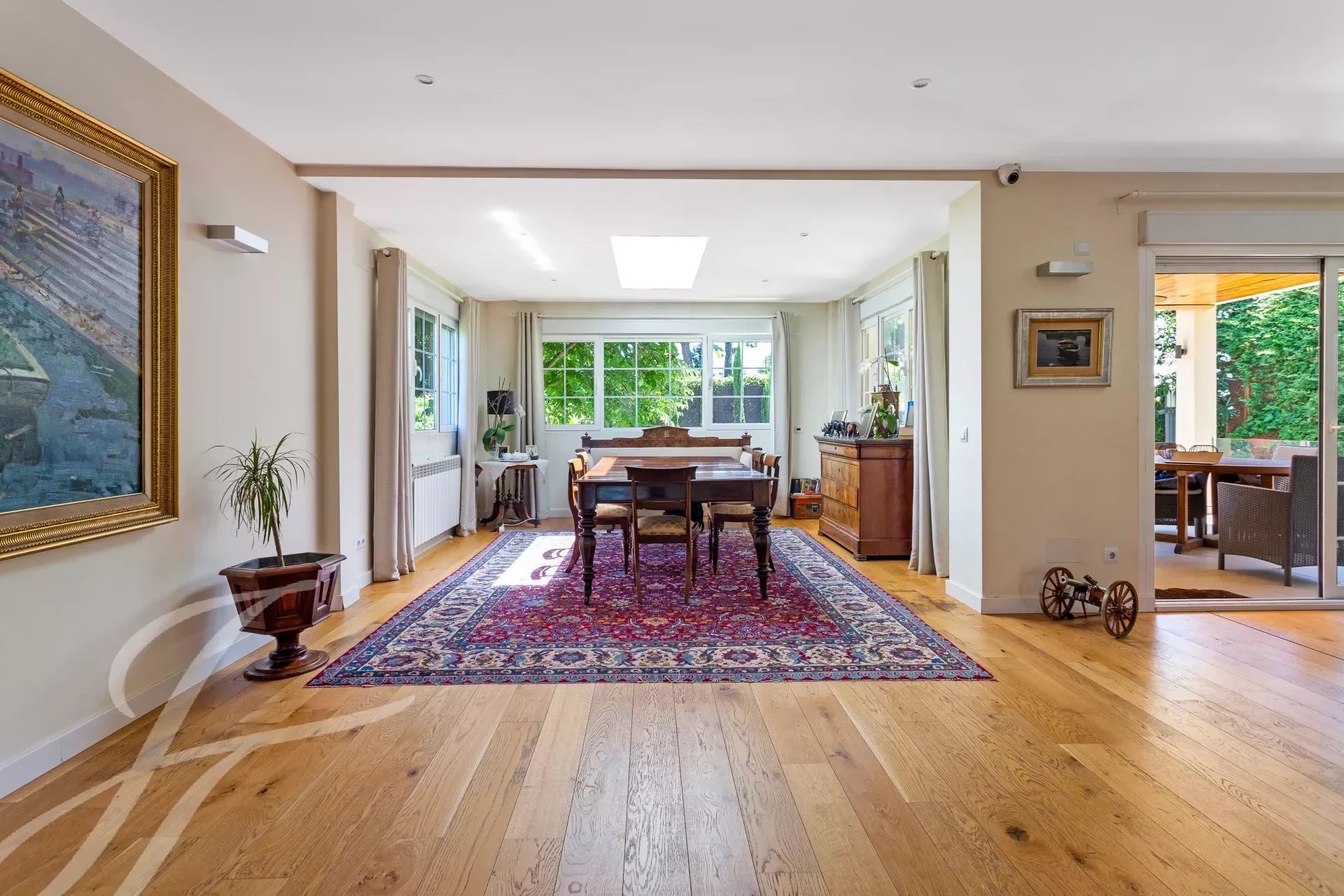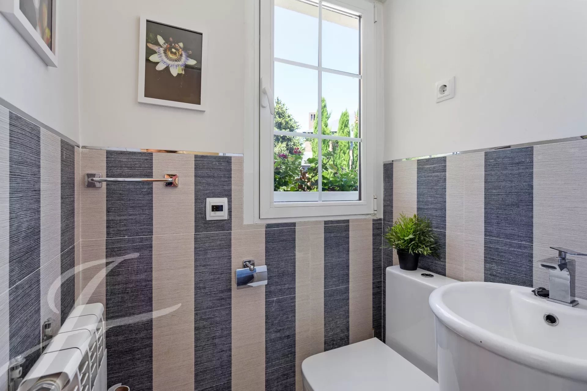 Полностью отремонтированная вилла площадью 456 м² с семью комнатами и спальнями. Участок площадью 634 м² с ухоженным садом с деревьями, бассейном, беседкой, барбекю, открытой печью, садовым навесом, подсобным помещением и сараем.