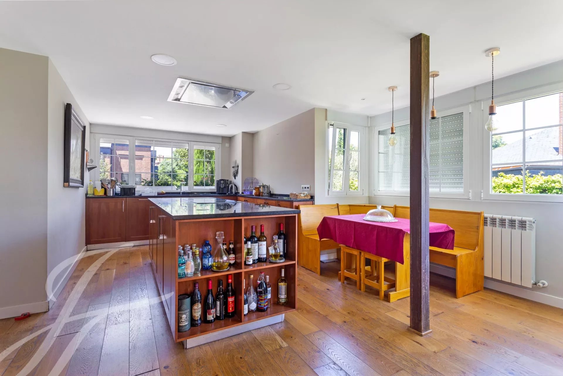 На главном этаже находится большая прихожая, выходящая в гостиную и столовую с выходом в красивый и просторный сад через крыльцо. Здесь также есть кабинет, кухня с офисной зоной и гостевой туалет. Гостиная с камином и столовая соединены с современной и отремонтированной кухней.