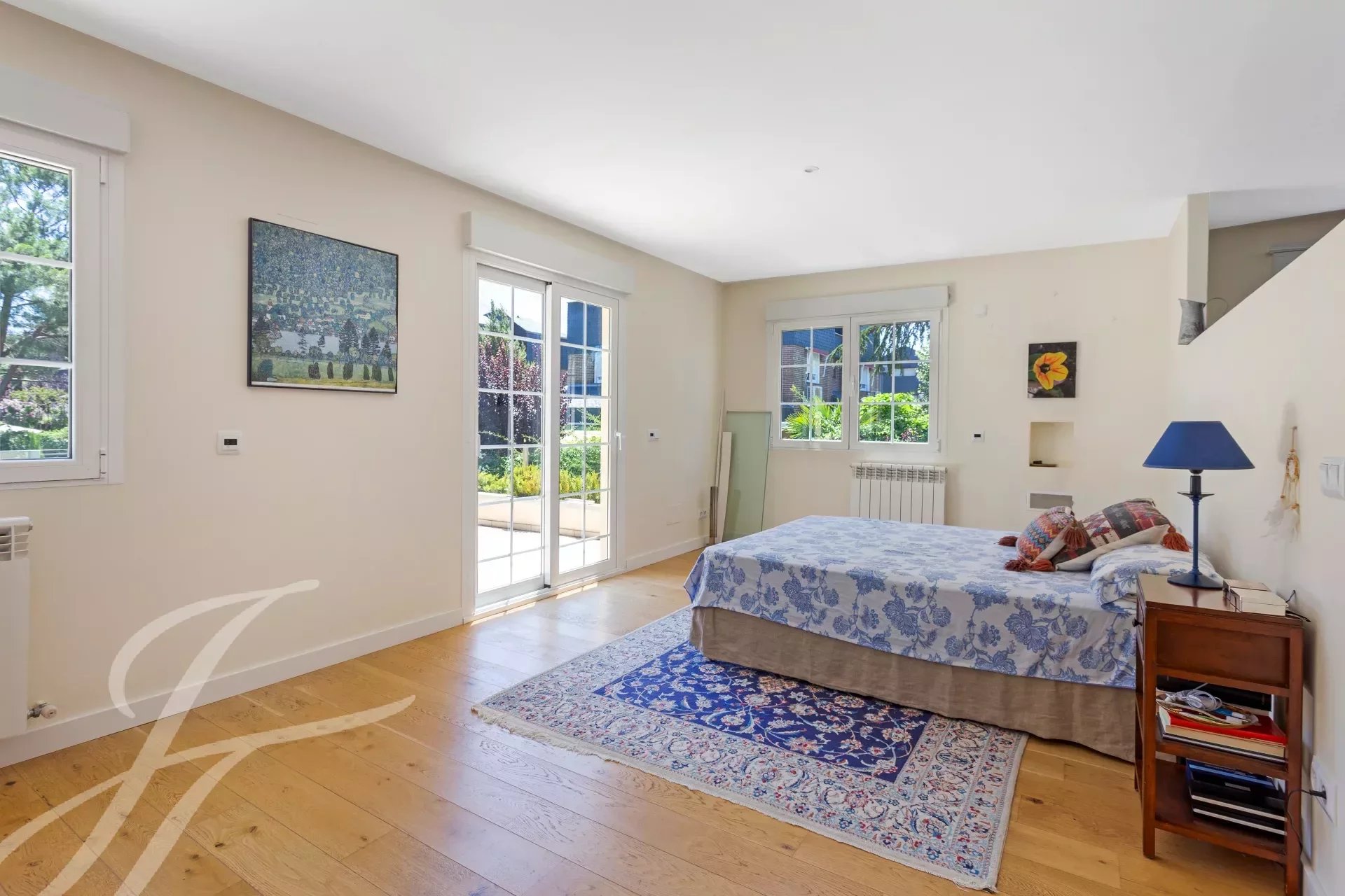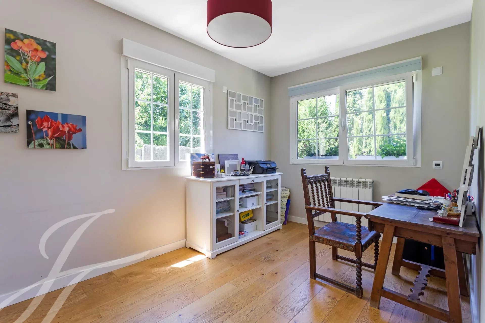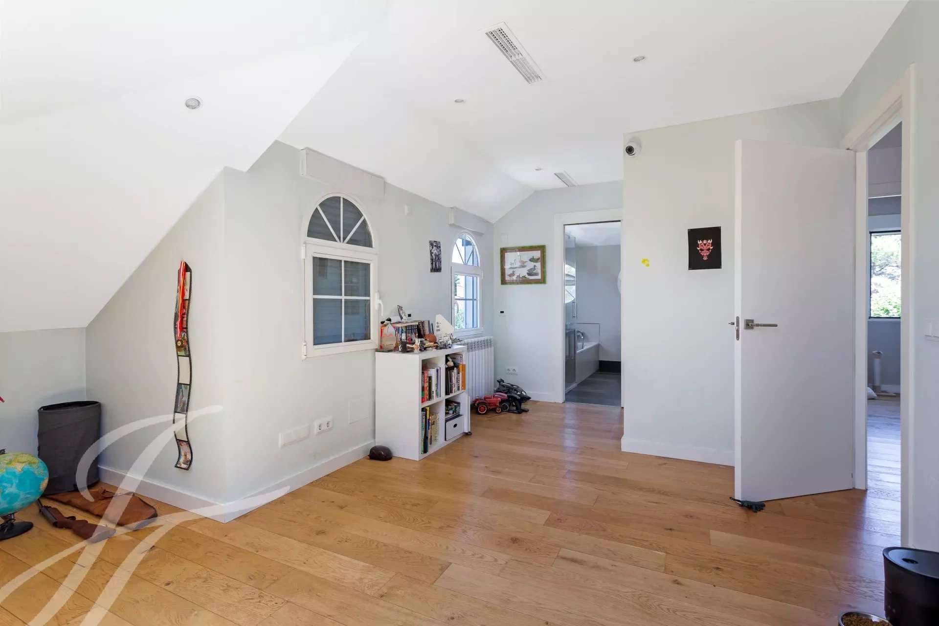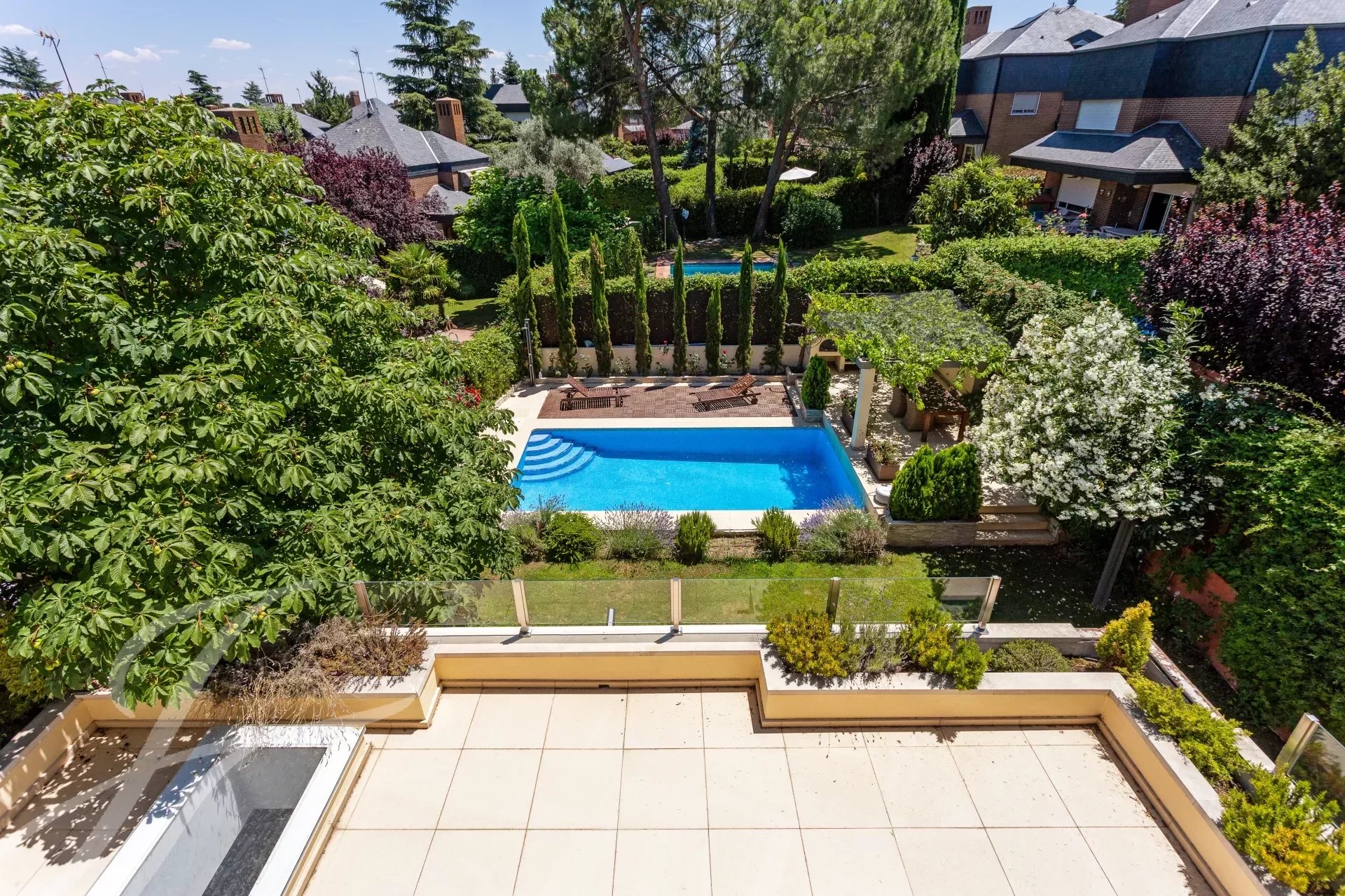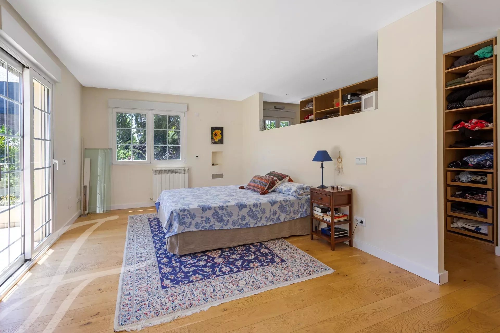 На втором этаже находится огромная спальня с ванной комнатой, террасой с видом на сад и бассейн, а также большим окном, выходящим на линию горизонта Мадрида.