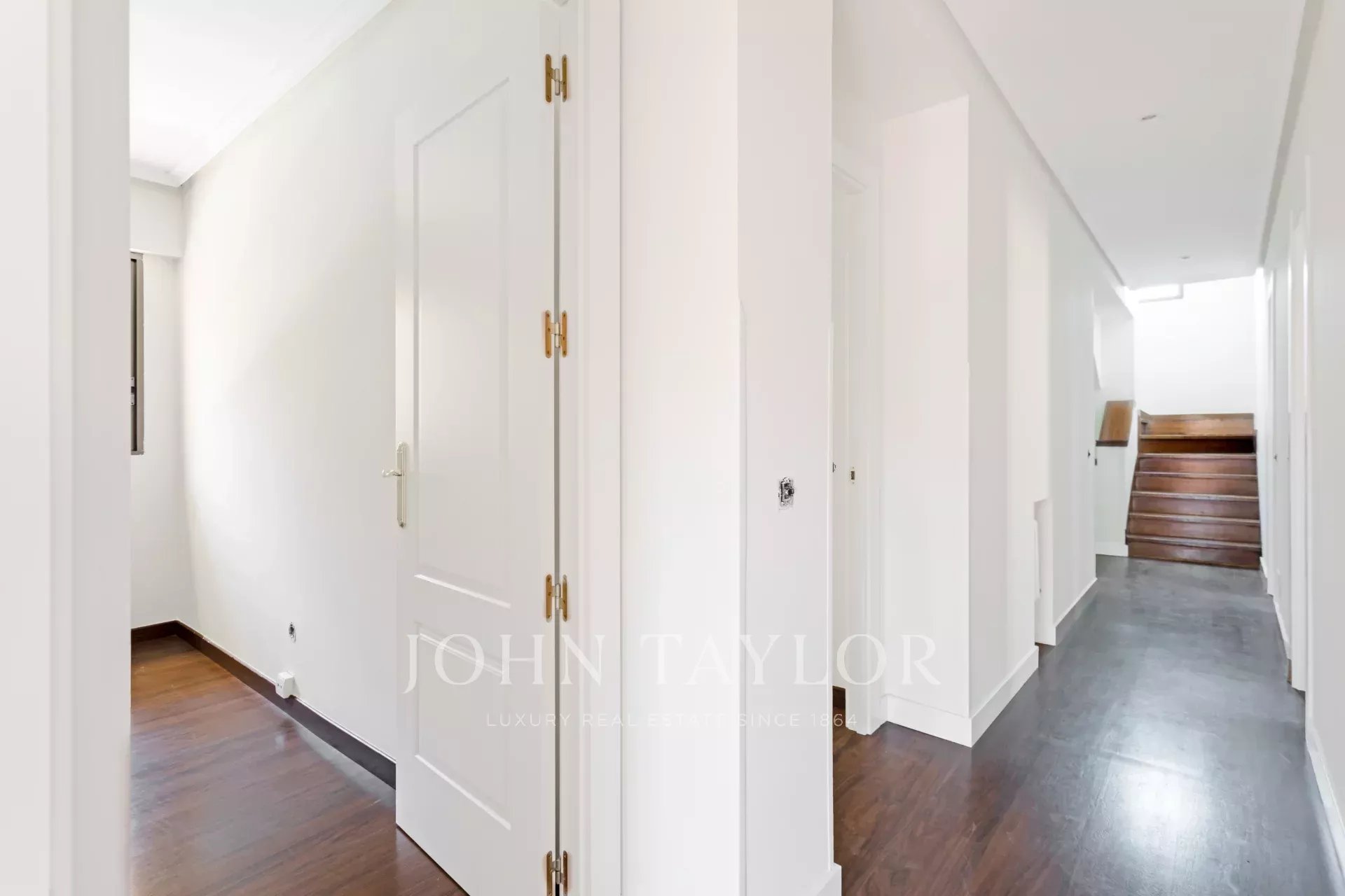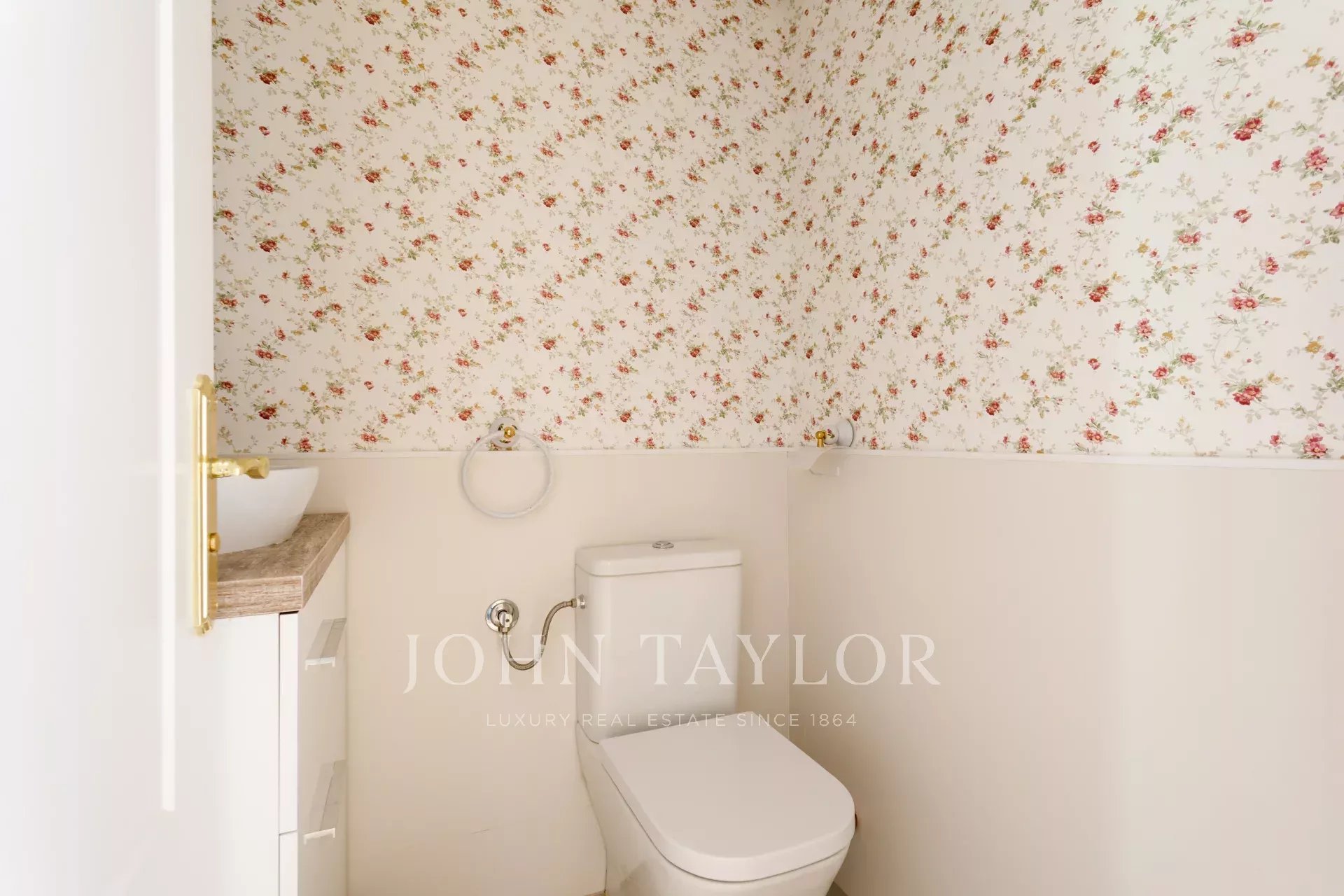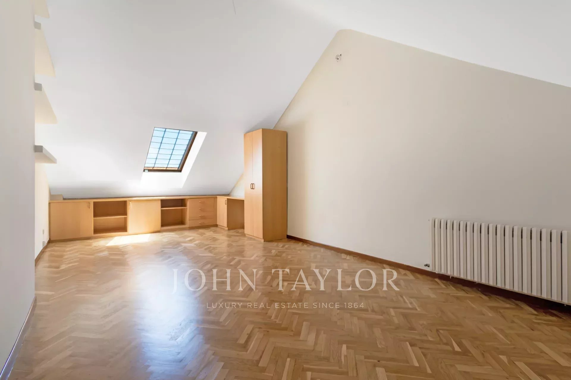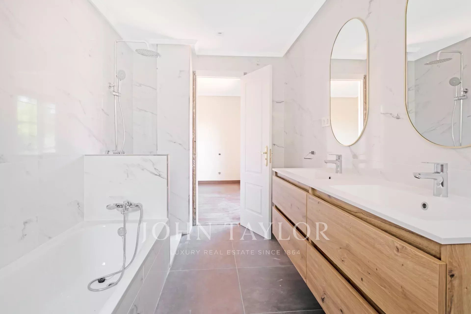 На втором этаже большая главная спальня с гардеробной и ванной комнатой, три спальни и две ванные комнаты. В главной спальне есть терраса с прекрасным видом на сад. На втором этаже - два огромных помещения, которые можно использовать как спальни или гостиные. Наконец, на полуподвальном этаже - гостиная или спальня, прачечная, подсобное помещение и парковка на две машины.