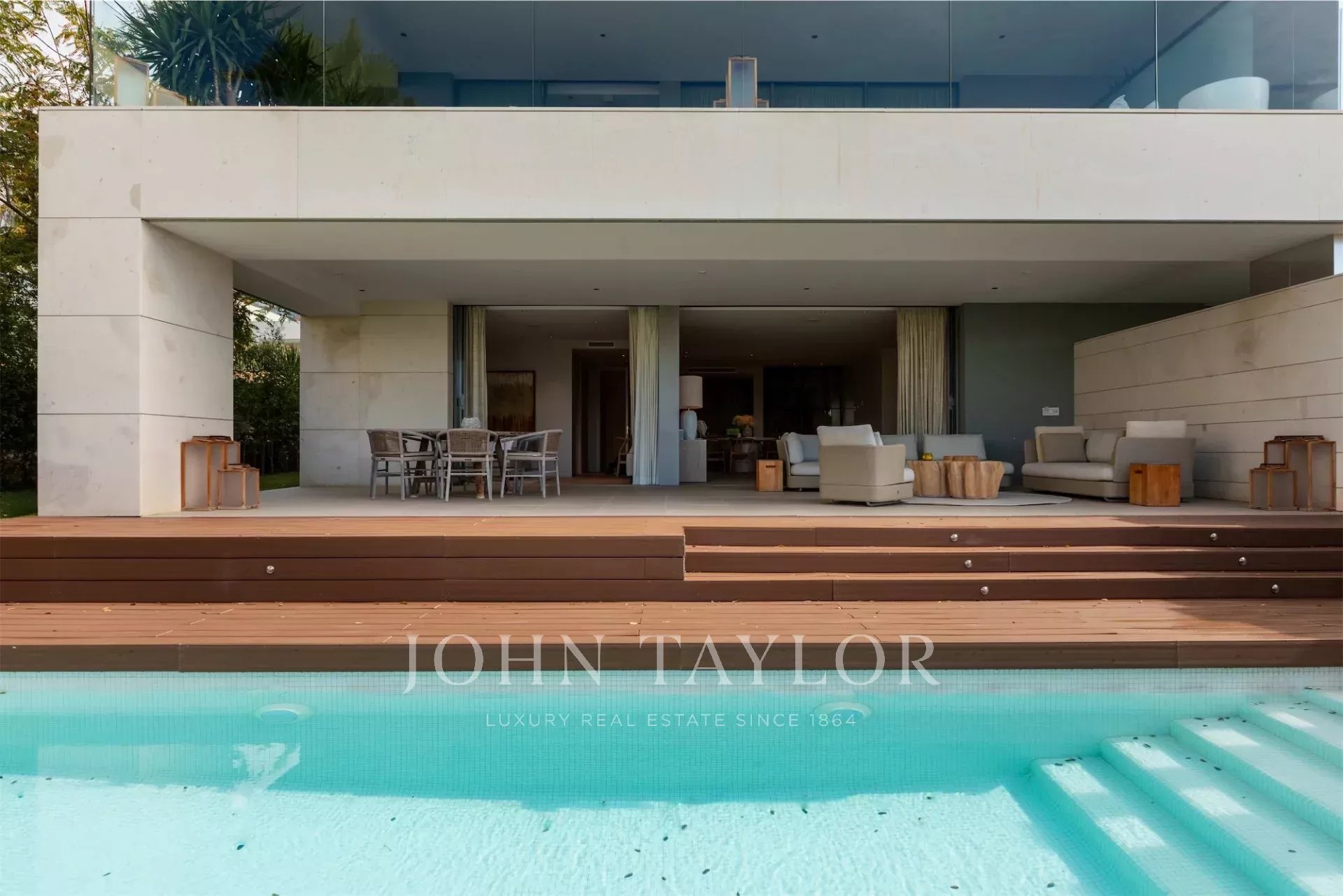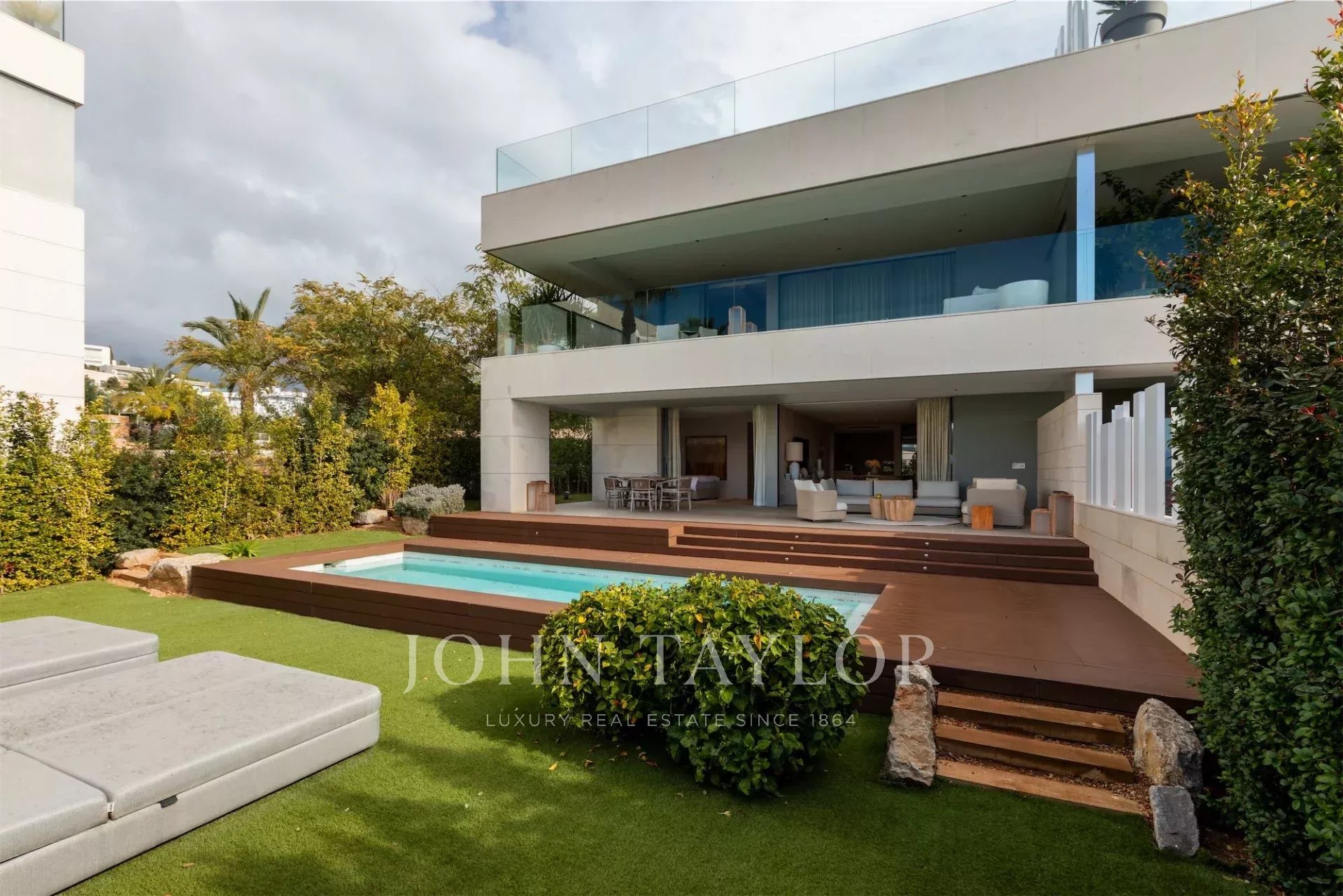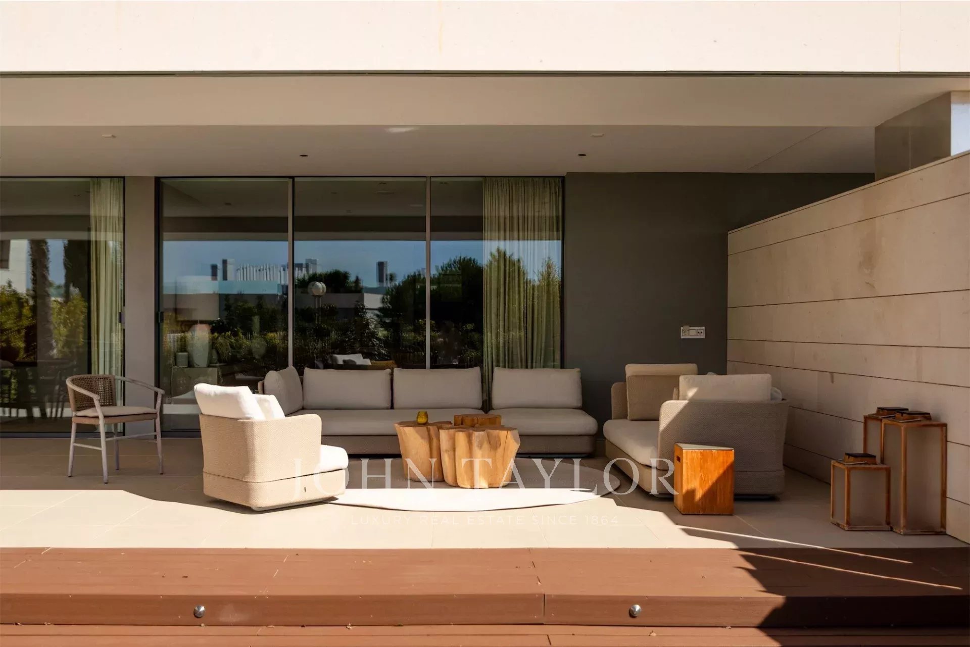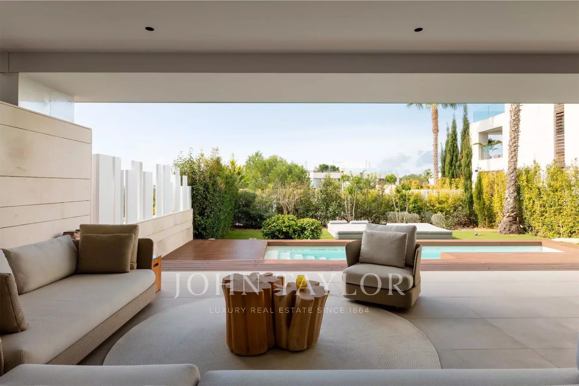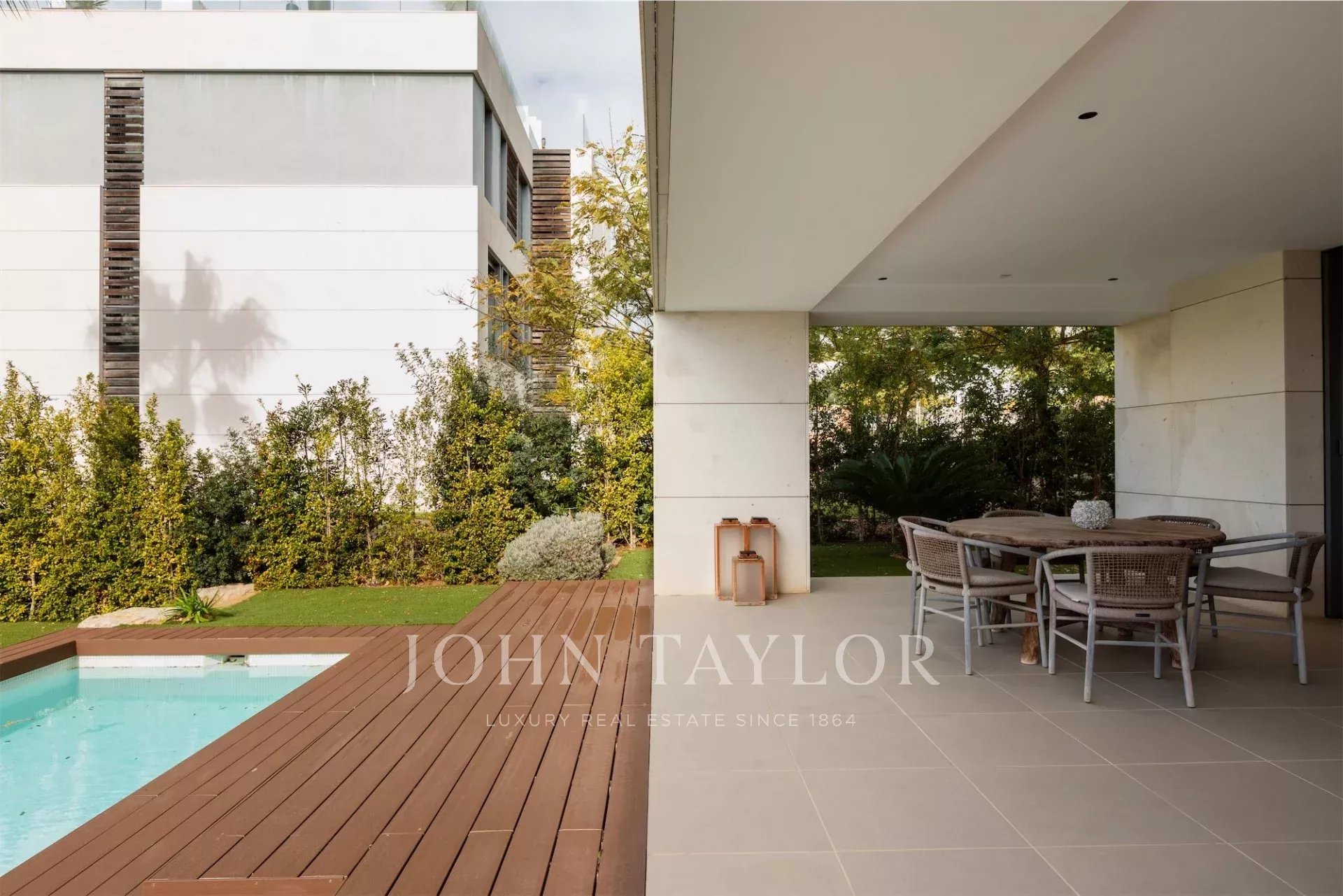 Дом занимает два уровня и просторную частную террасу на крыше. Два отдельных входа позволяют использовать нижний этаж как полноценную гостевую зону с тремя спальнями с ванными комнатами, просторной гостиной с открытой кухней, гостевым санузлом и выходом в сад с крытой террасой и бассейном.