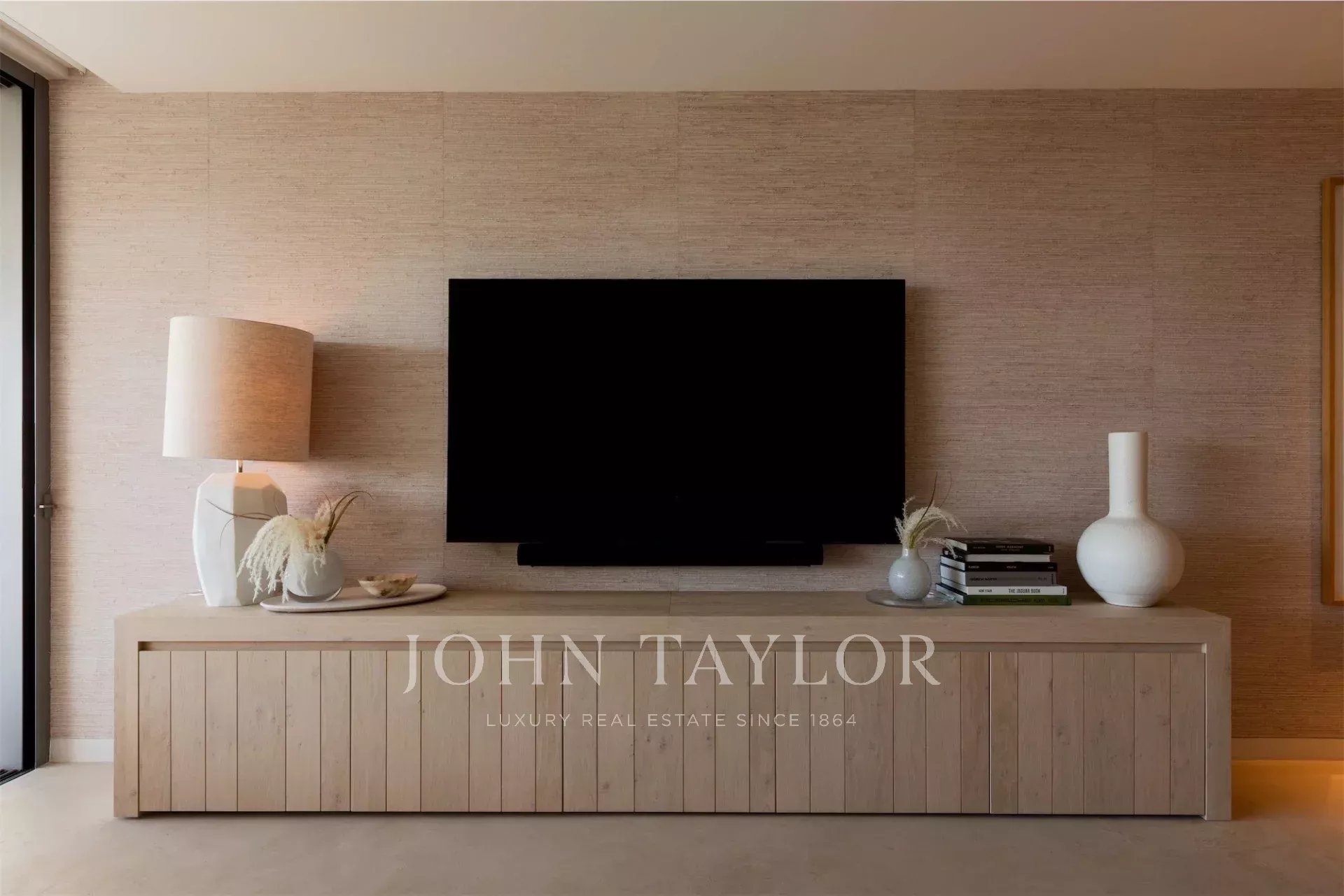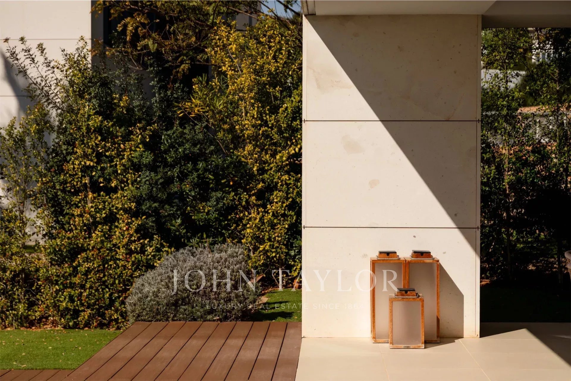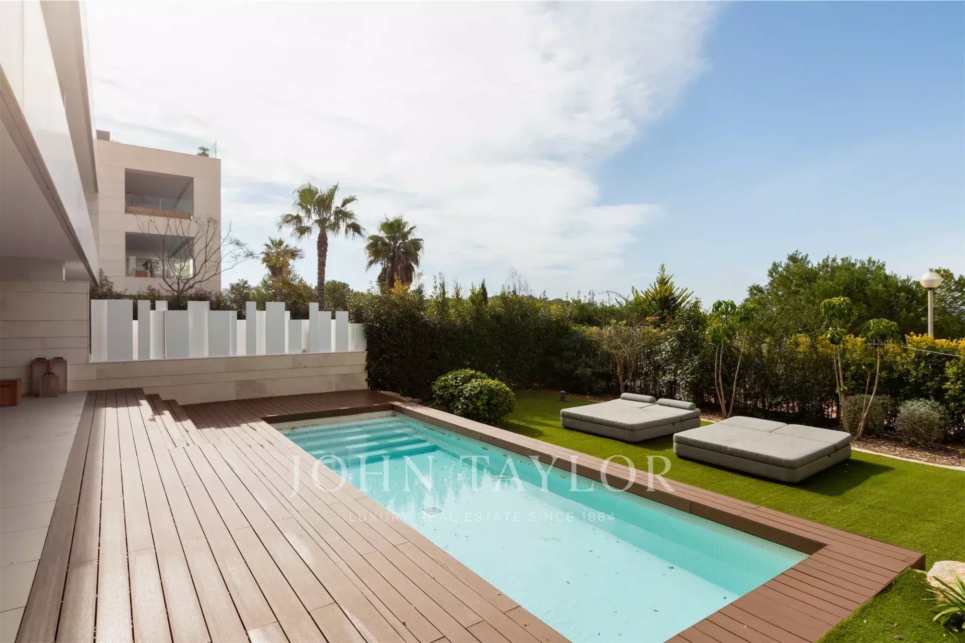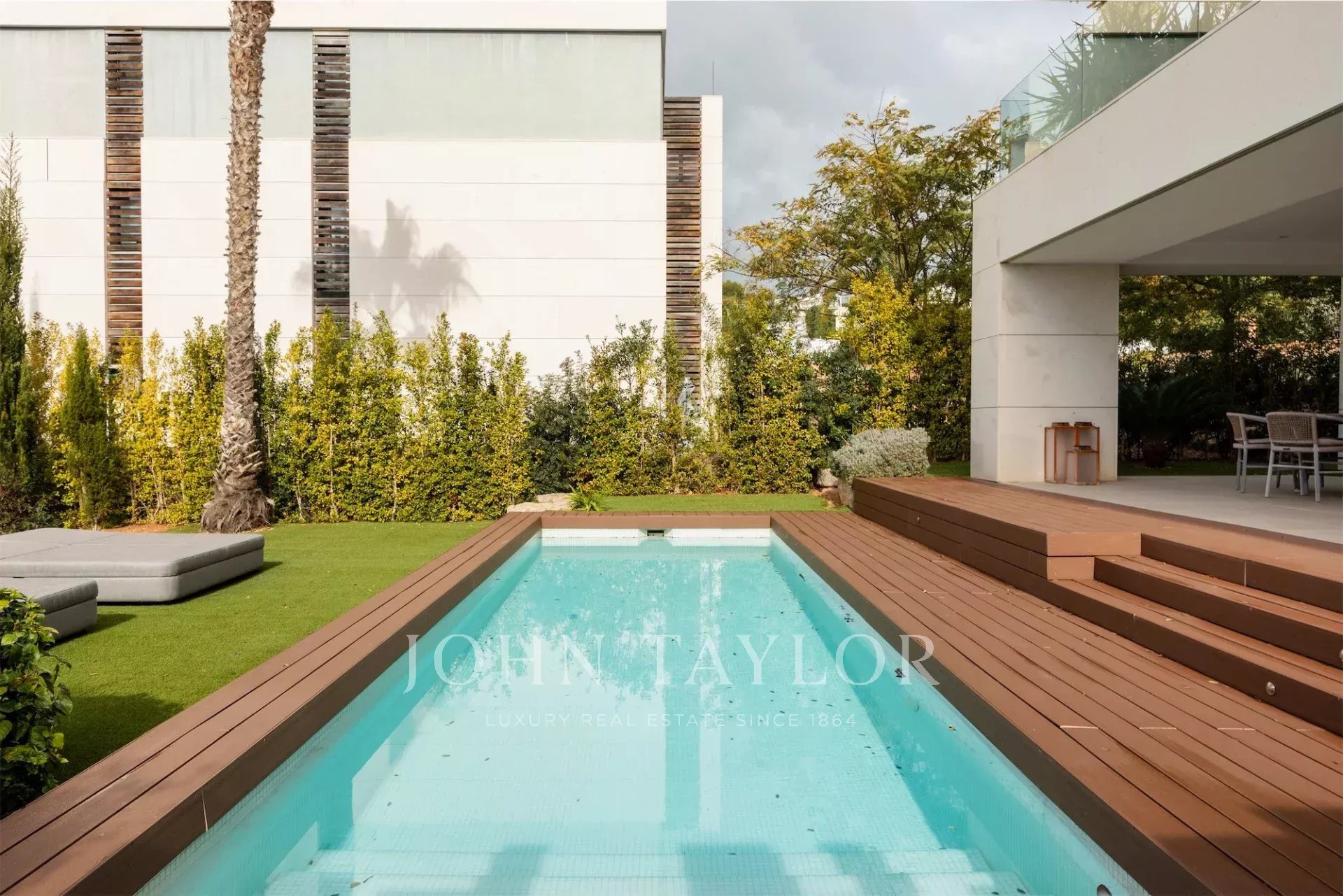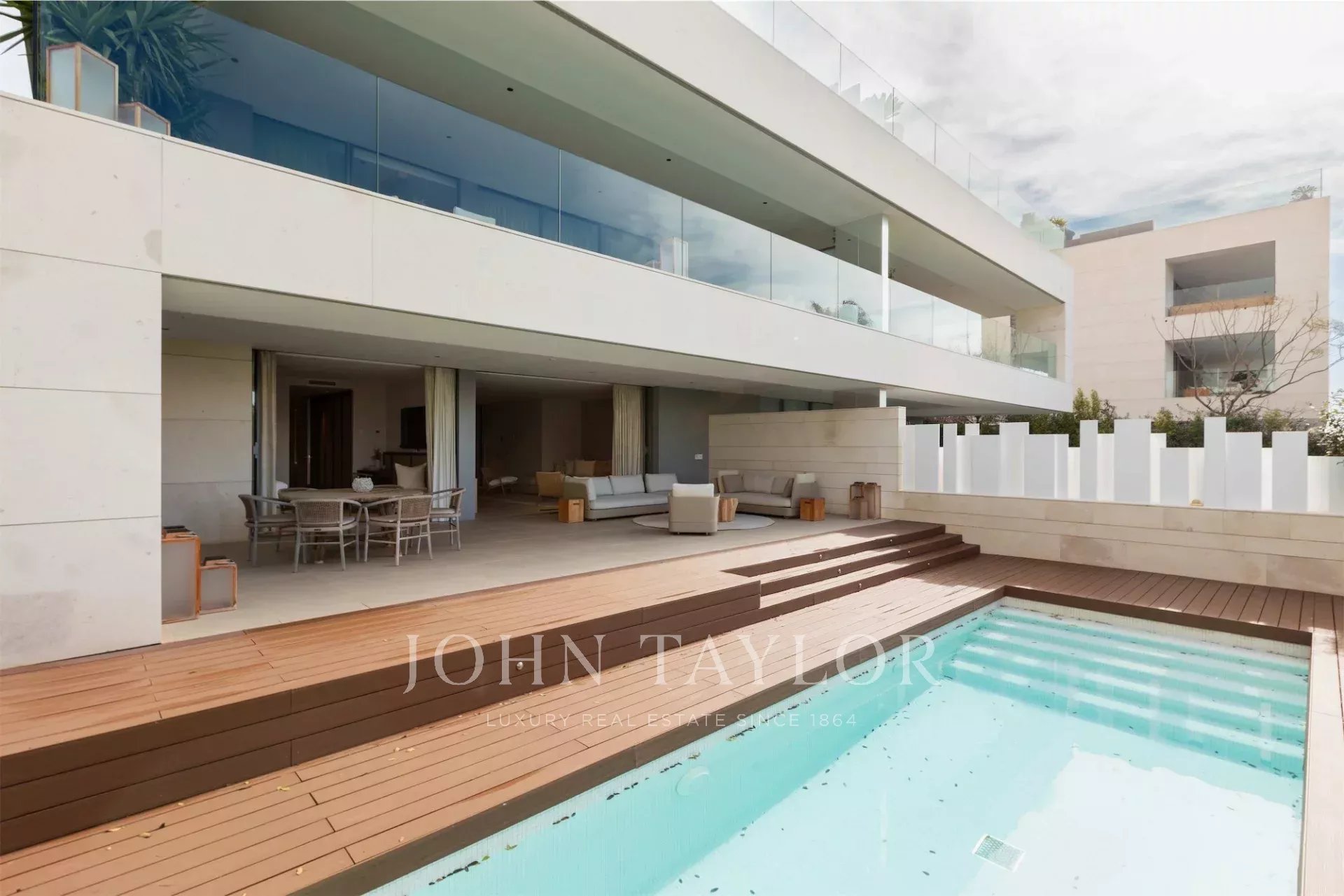 Дом занимает два уровня и просторную частную террасу на крыше. Два отдельных входа позволяют использовать нижний этаж как полноценную гостевую зону с тремя спальнями с ванными комнатами, просторной гостиной с открытой кухней, гостевым санузлом и выходом в сад с крытой террасой и бассейном.