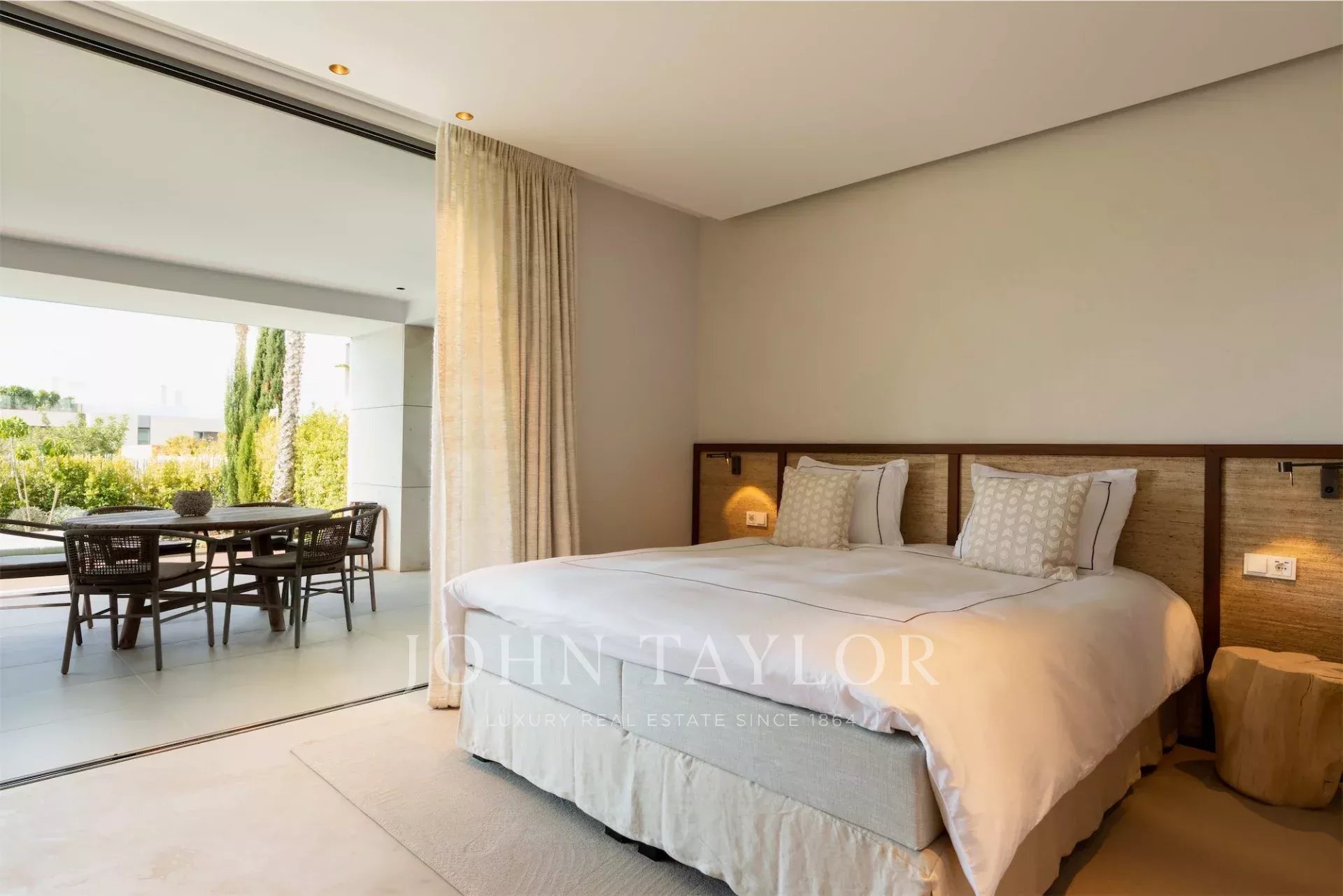 На основном этаже — светлая гостиная с выходом на террасу с видом на море и Старый город, а также мастер-спальня с гардеробной, просторной ванной, сауной и дополнительным санузлом. Интерьеры оформлены известным европейским дизайнером с использованием качественных материалов и в современном стиле с оттенками атмосферы Ибицы.