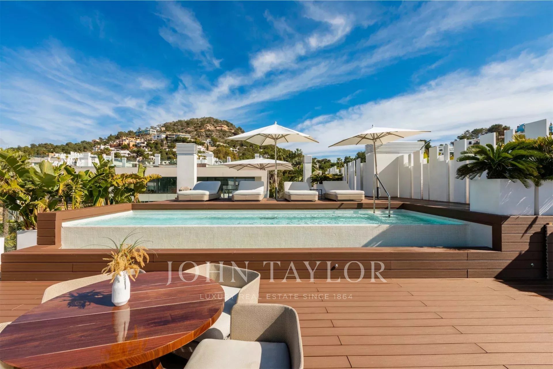 Терраса на крыше — это настоящая зона отдыха с вторым частным бассейном, шезлонгами и панорамным видом. Юго-западная ориентация обеспечивает солнце на протяжении всего дня.