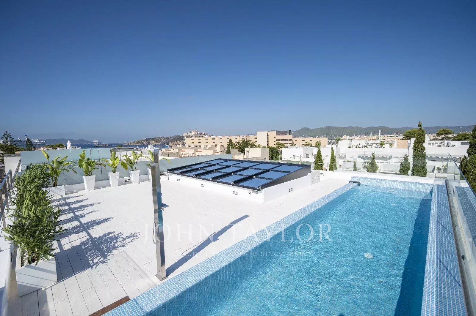 Наслаждайтесь отдыхом и развлечением в большом бассейне площадью 21 м², окружённом террасой 110 м². Также недвижимость включает частный лифт с доступом к парковке, просторное парковочное место и дополнительное небольшое пространство.