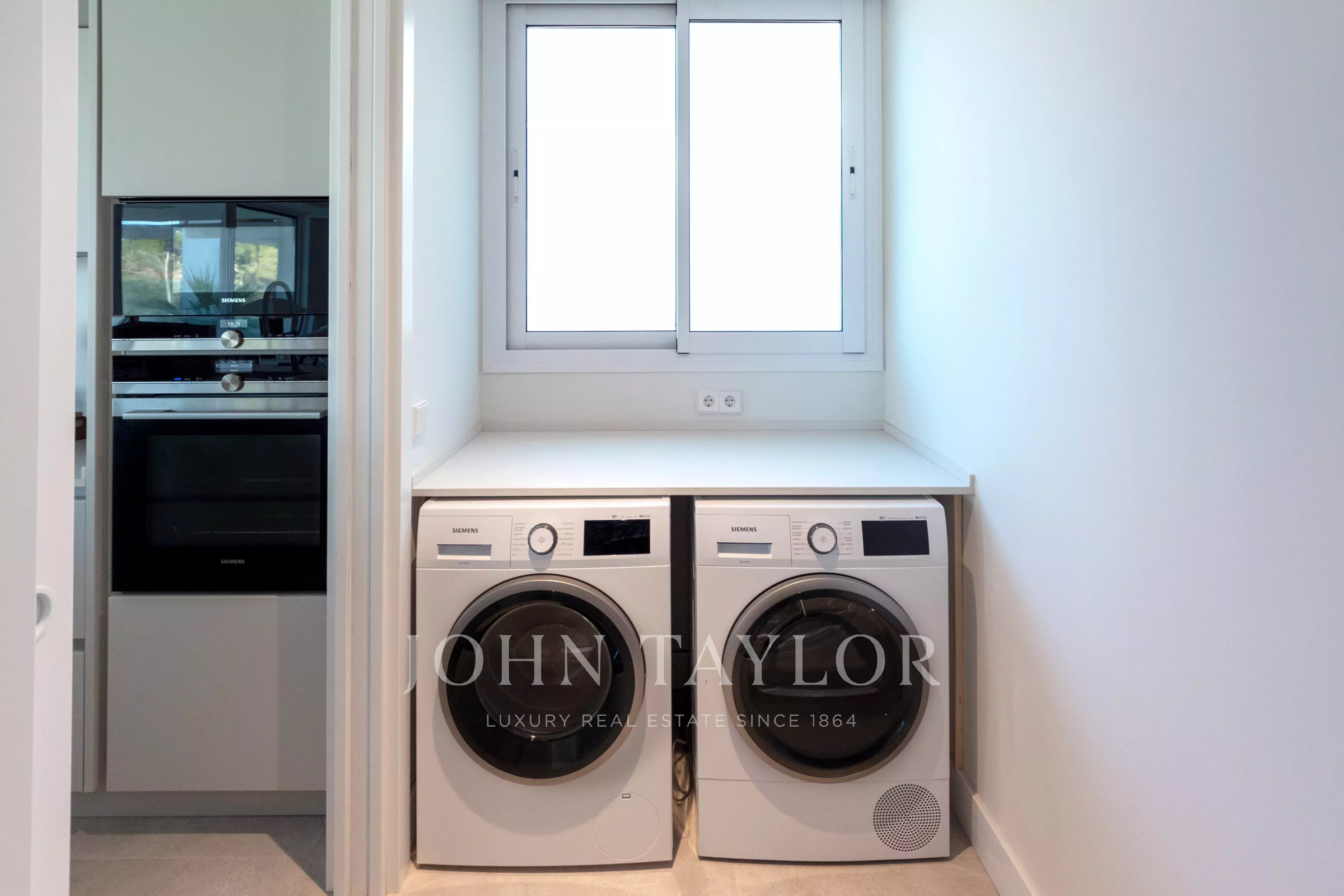Пентхаус оснащен просторной и светлой гостиной-столовой, идеально подходящей для приема друзей и семьи. Современная кухня открытого типа оборудована высококлассной техникой, а небольшая прачечная рядом с кухней добавляет удобства в повседневной жизни.