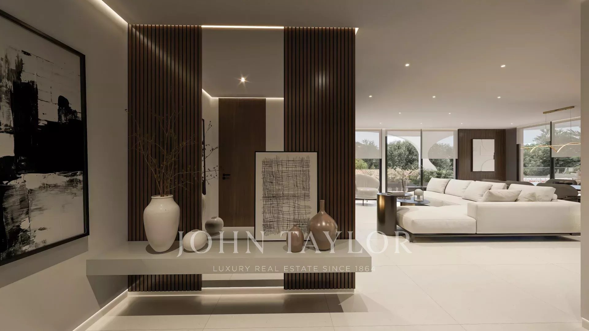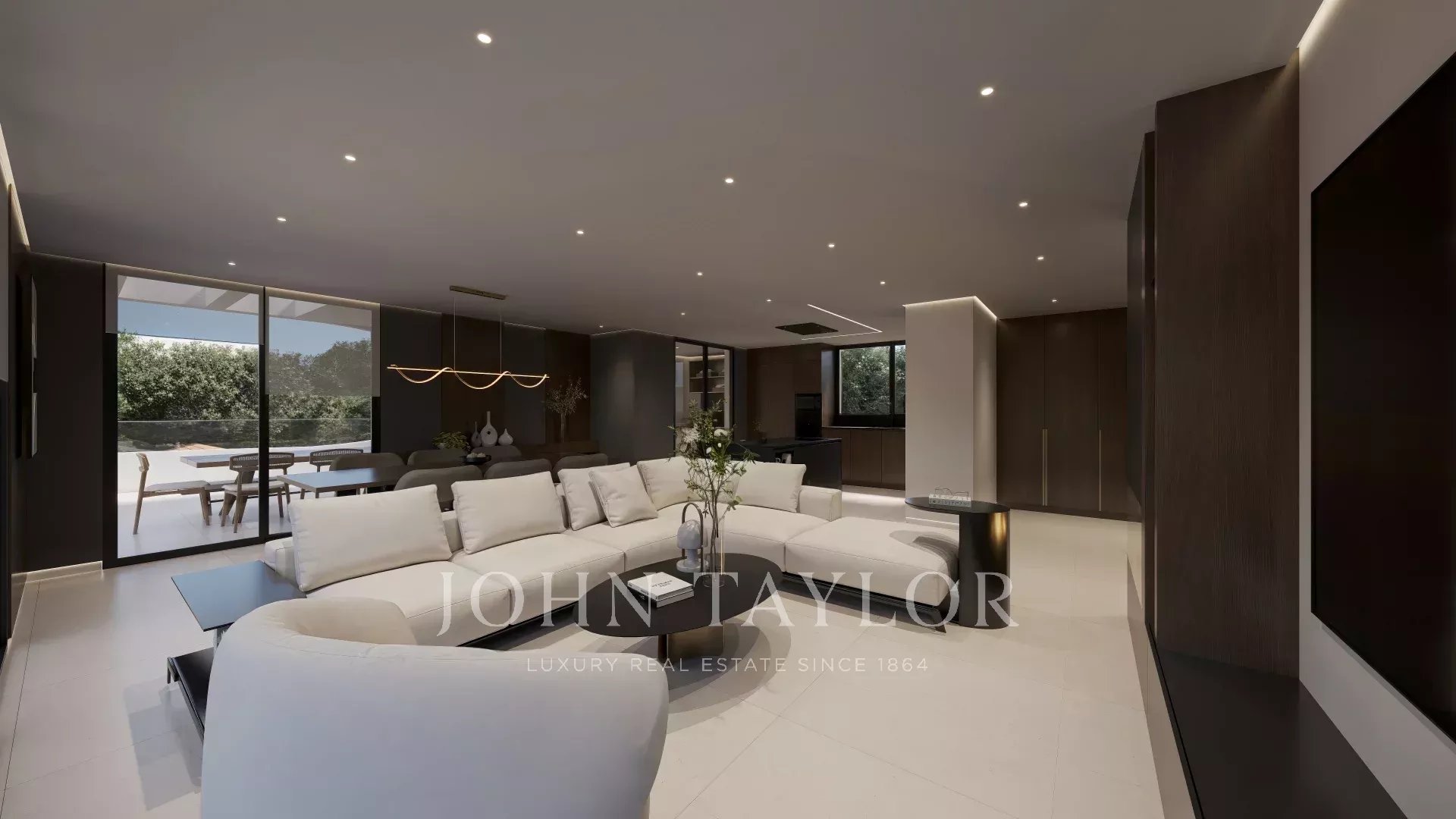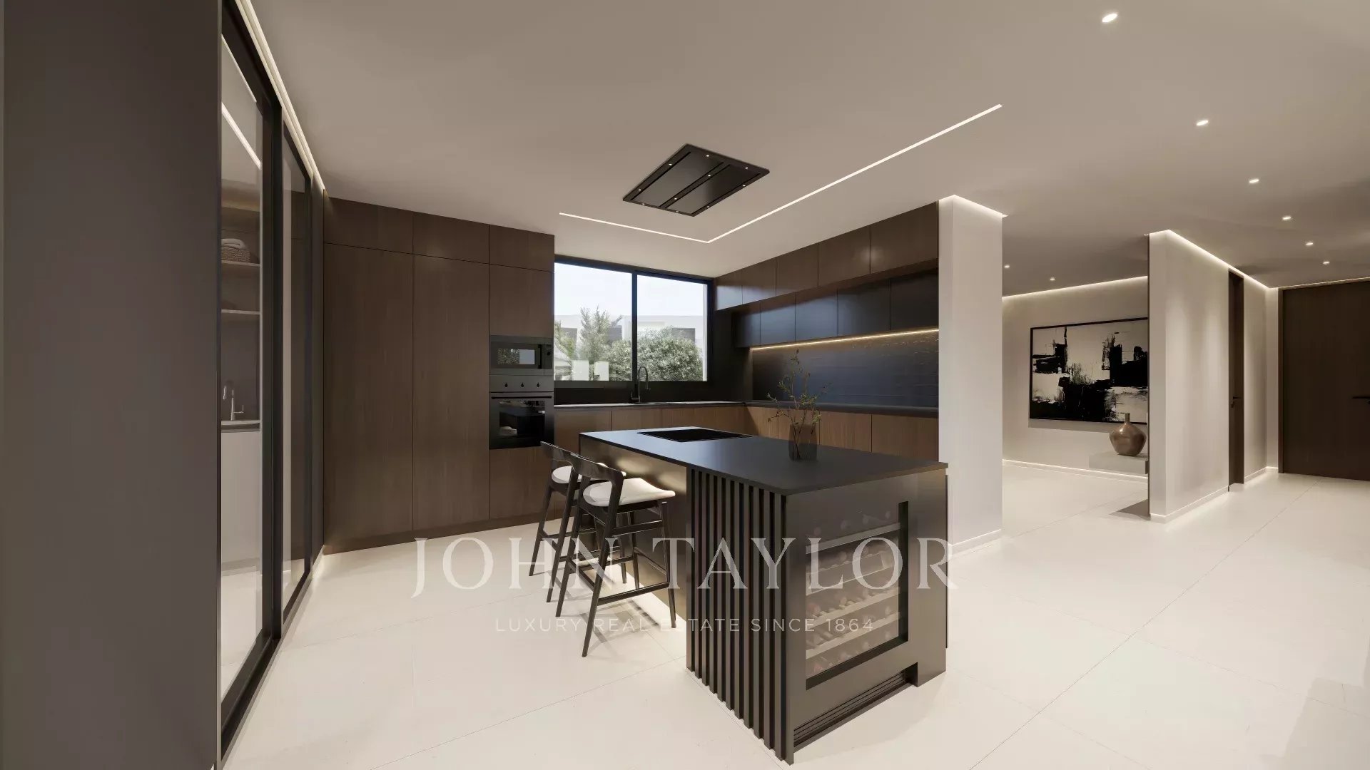 Интерьер отличается современной элегантностью: открытая планировка с кухней-островом плавно соединяет жилую зону с террасой. Благородные материалы, крупноформатное напольное покрытие и нейтральная цветовая гамма создают атмосферу покоя и современного роскошного стиля.