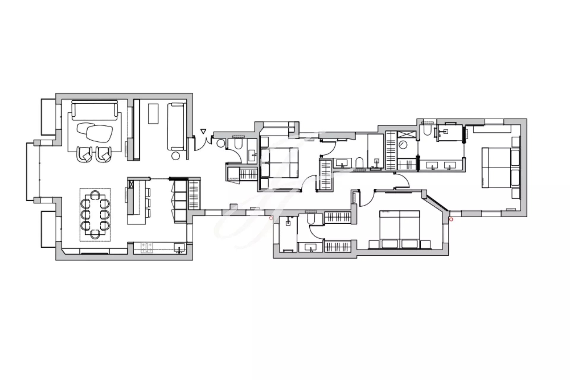 Расположенная на внешнем третьем этаже, квартира предлагает 164 м² просторных и светлых помещений, которые дополнены 3-метровыми потолками и тремя балконами, заливающими квартиру естественным светом благодаря западной ориентации. Планировка была тщательно продумана, чтобы сочетать элегантность и функциональность: три спальни с ванными комнатами и гостевой туалет создают дом, предназначенный для максимального комфорта и уединения.