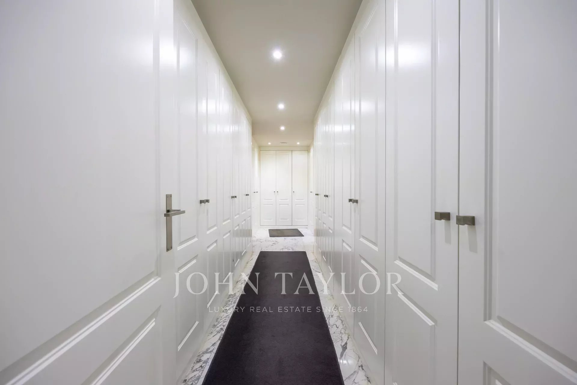 В квартире есть прихожая с гардеробом, которая ведет в гостиную / столовую с выходом на балкон. Есть три большие спальни с ванными комнатами, одна из них с выходом на террасу с западной стороны и видом на большой внутренний двор. В главной спальне есть собственный балкон и большая гардеробная с более чем 15 дверями и балконом на передней панели.