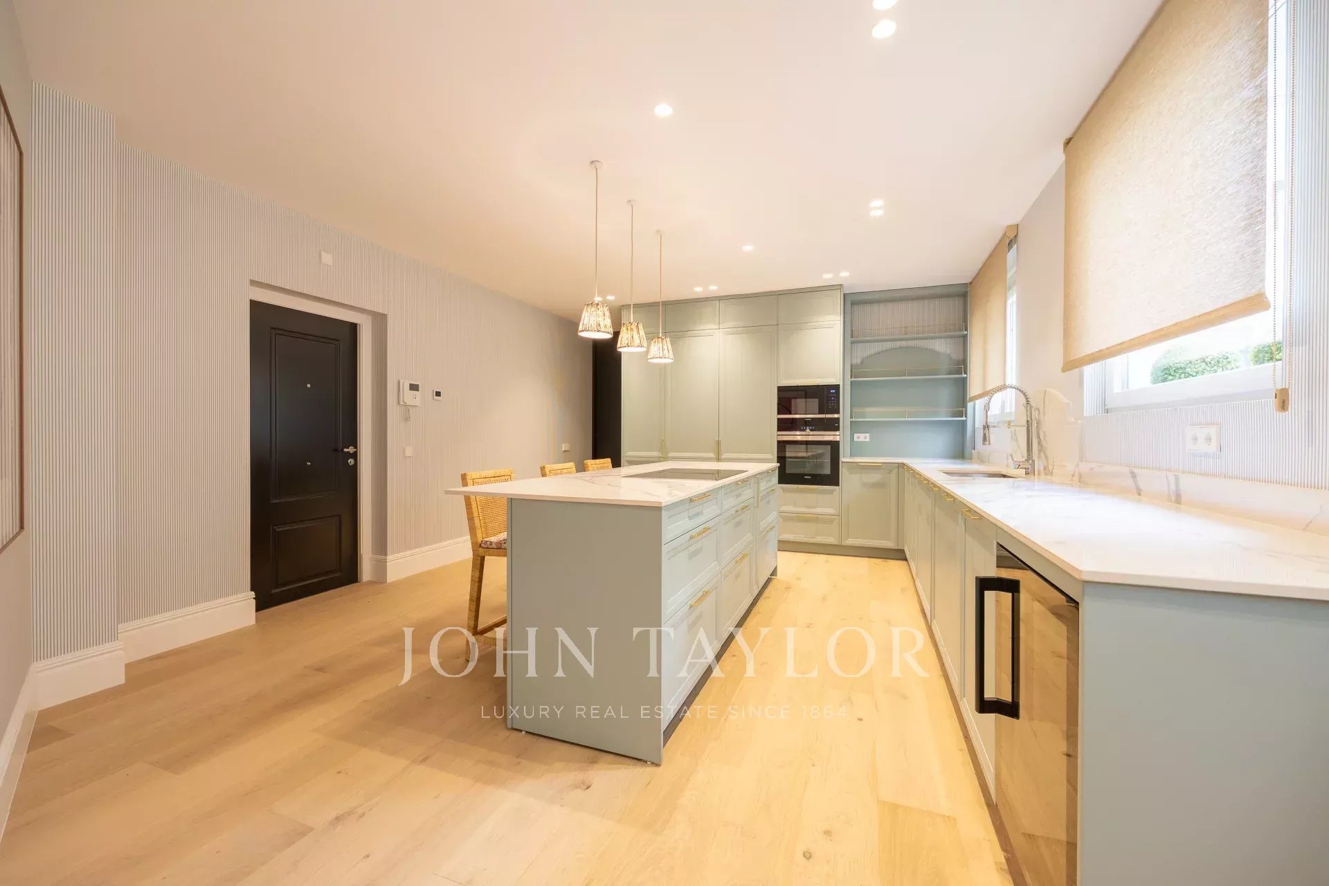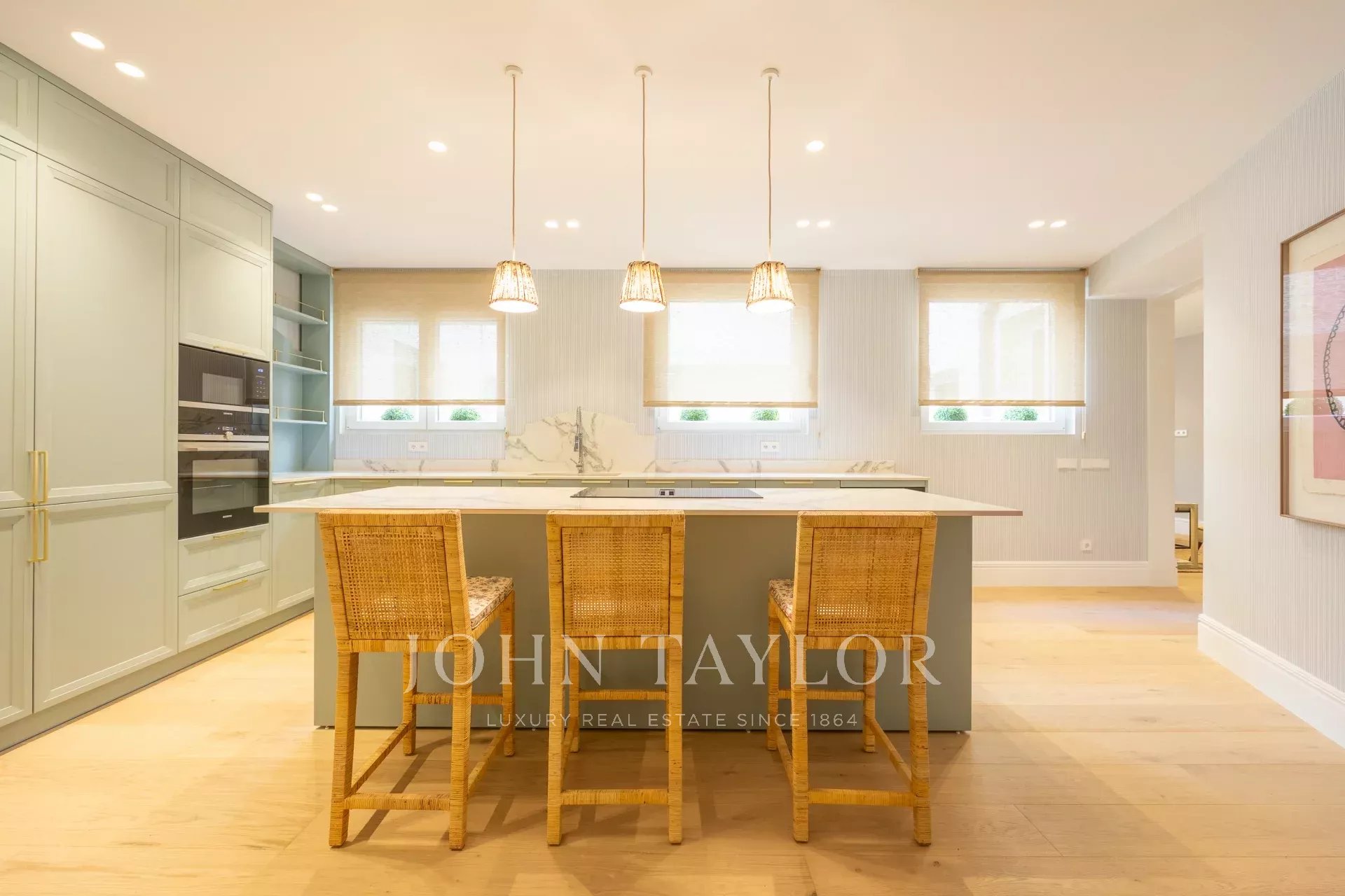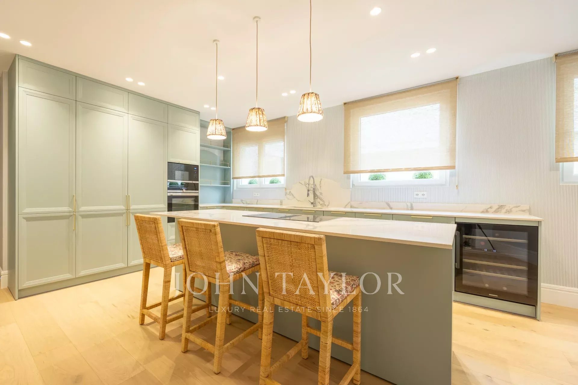 В доме также есть отдельная столовая и полностью оборудованная кухня, оснащенная современной немецкой техникой высокого класса, включая винный погреб, два холодильника и две морозильные камеры.