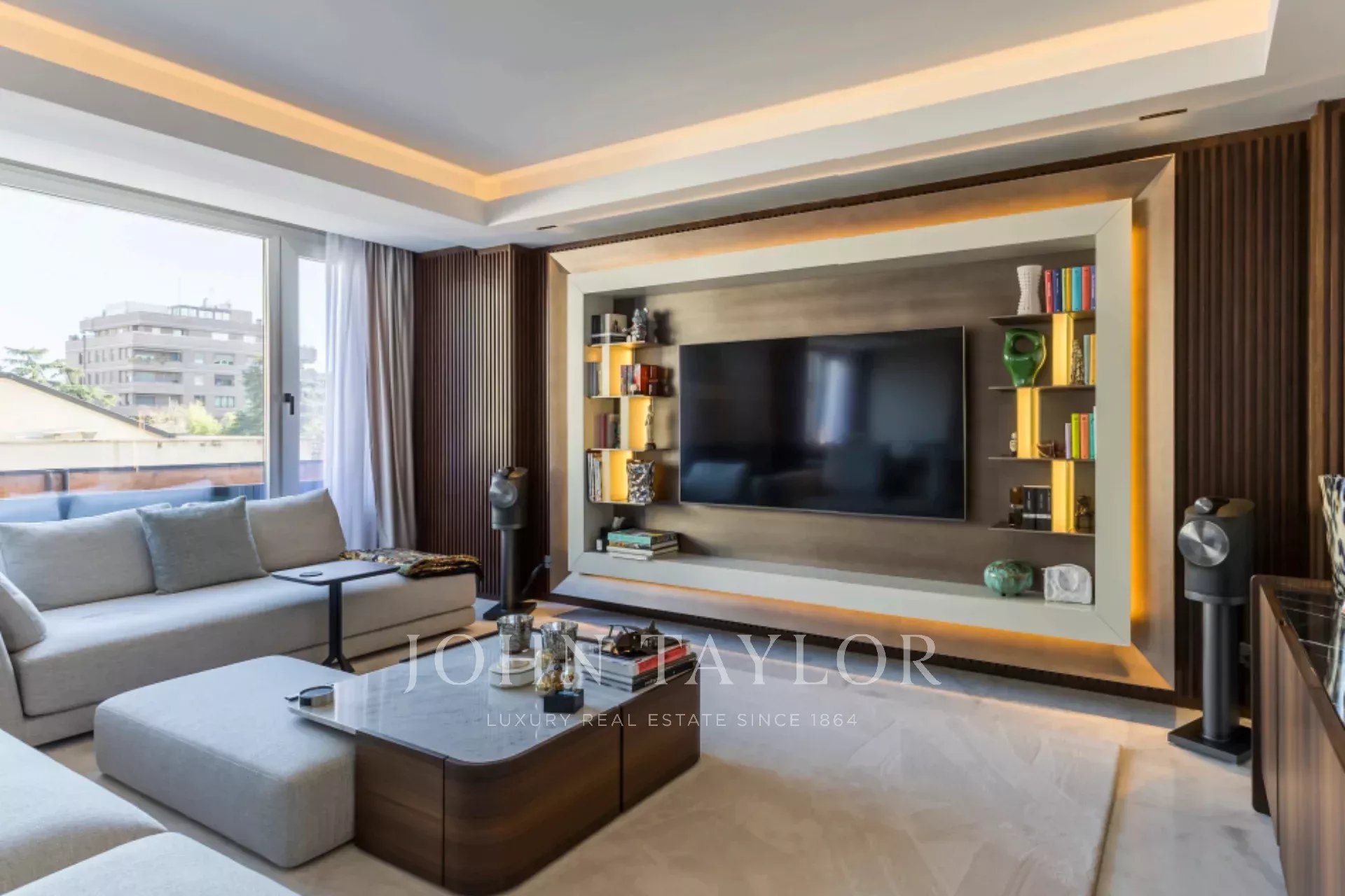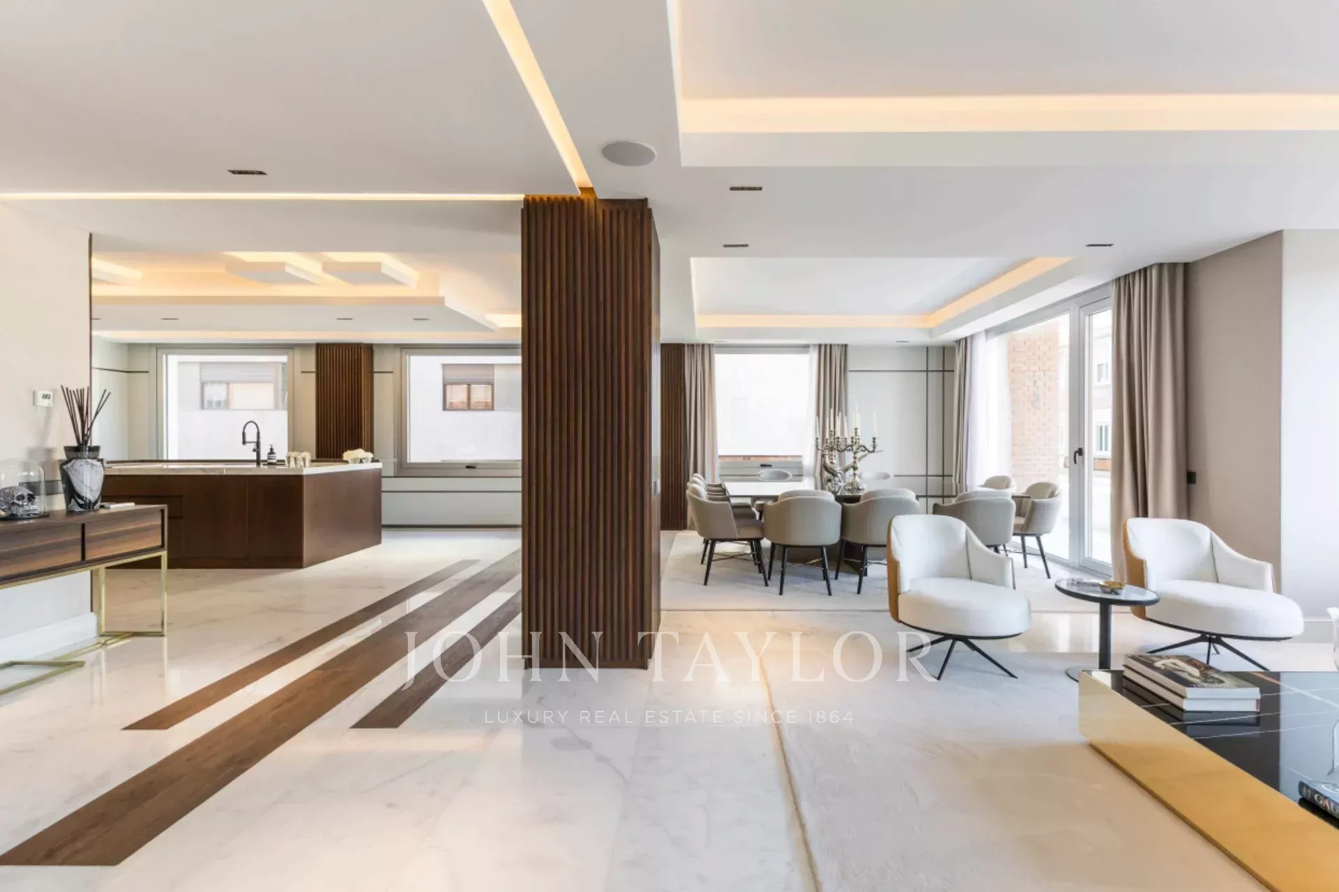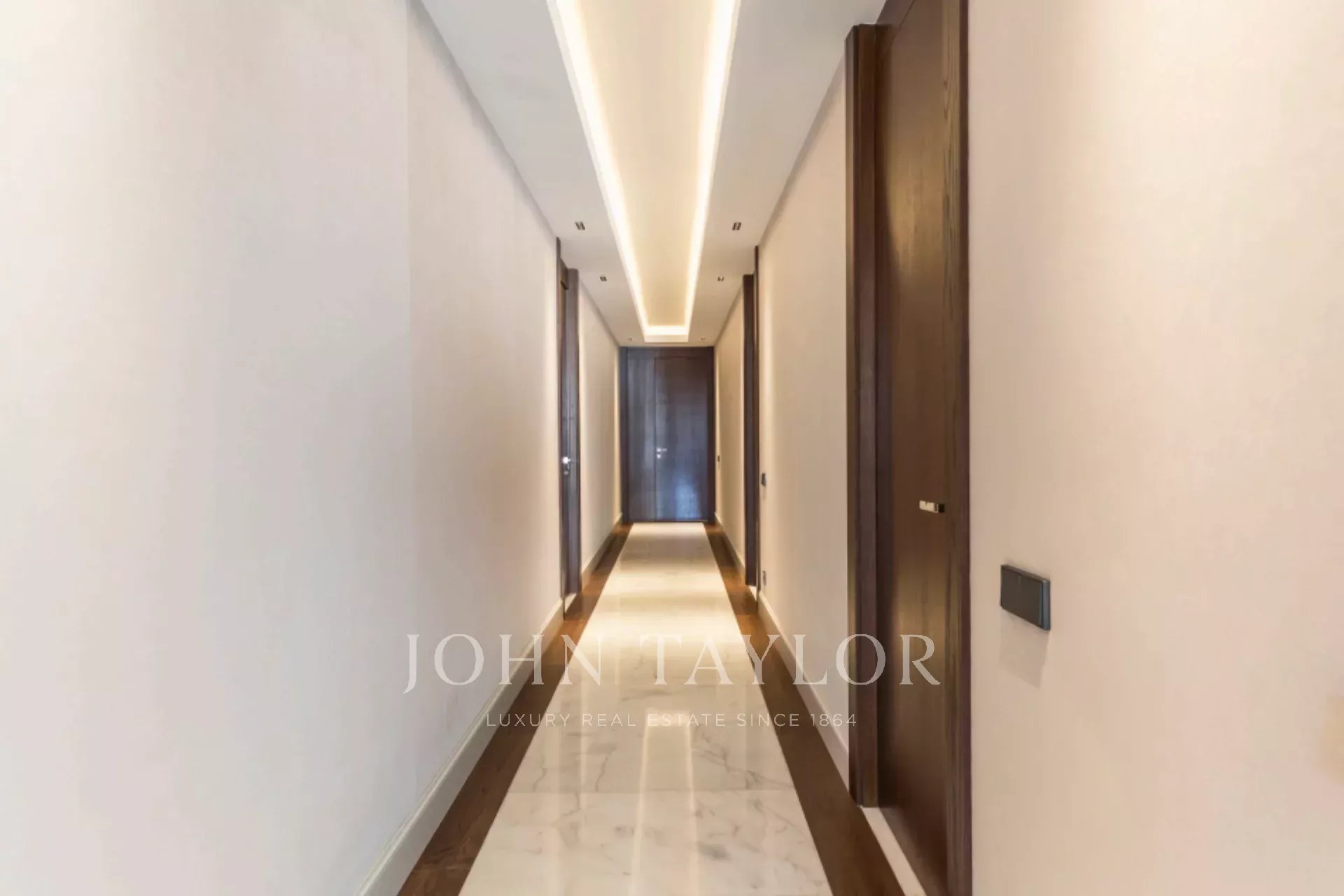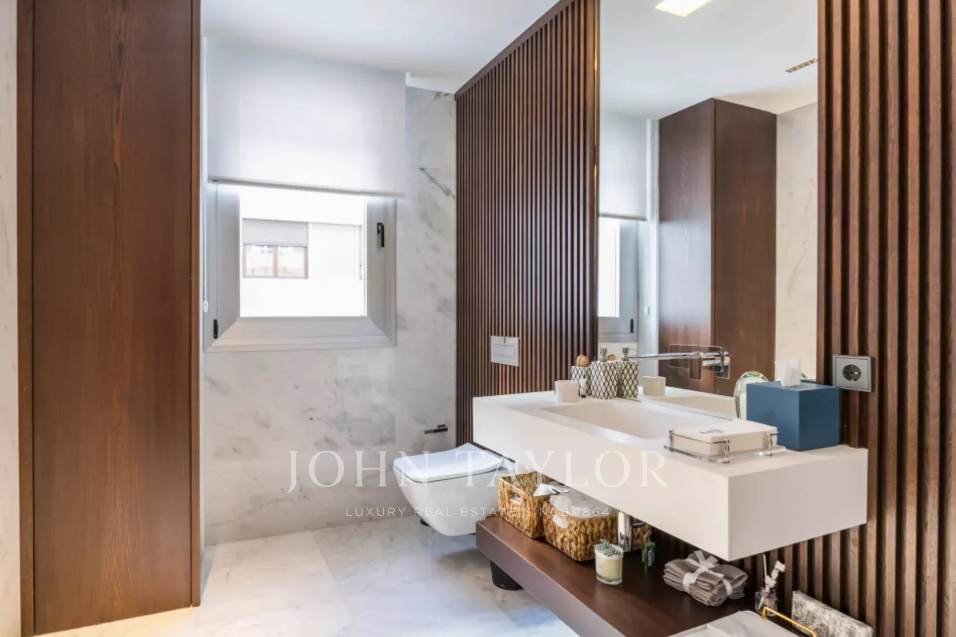 Расположенный в одном из лучших районов Мадрида, этот исключительный дом сочетает в себе международный современный дизайн и высококачественную отделку. Созданный известной студией дизайна интерьеров, он включает в себя такие благородные материалы, как доломитовый мрамор и натуральная древесина дуба, придающие дому уникальный характер.