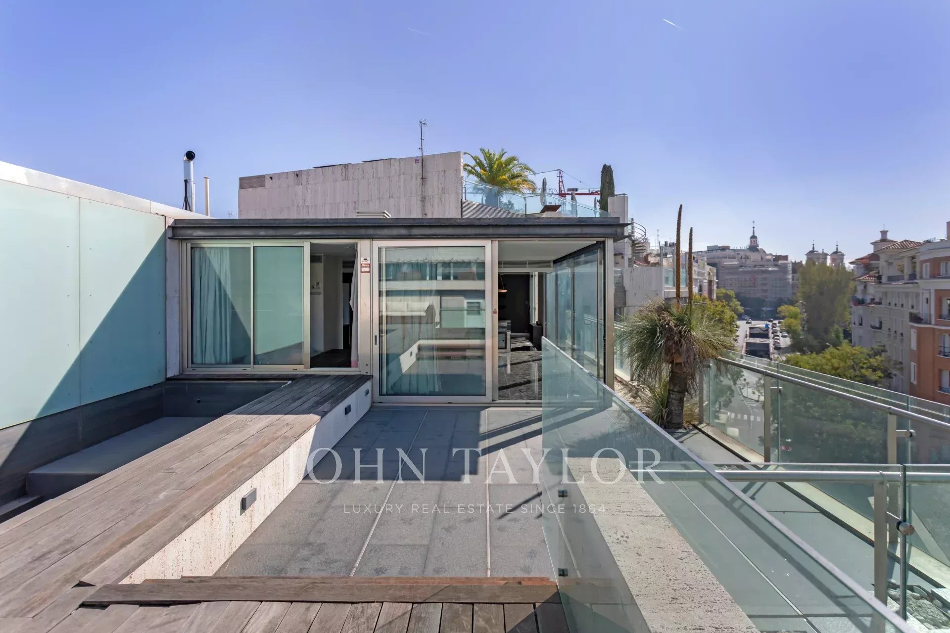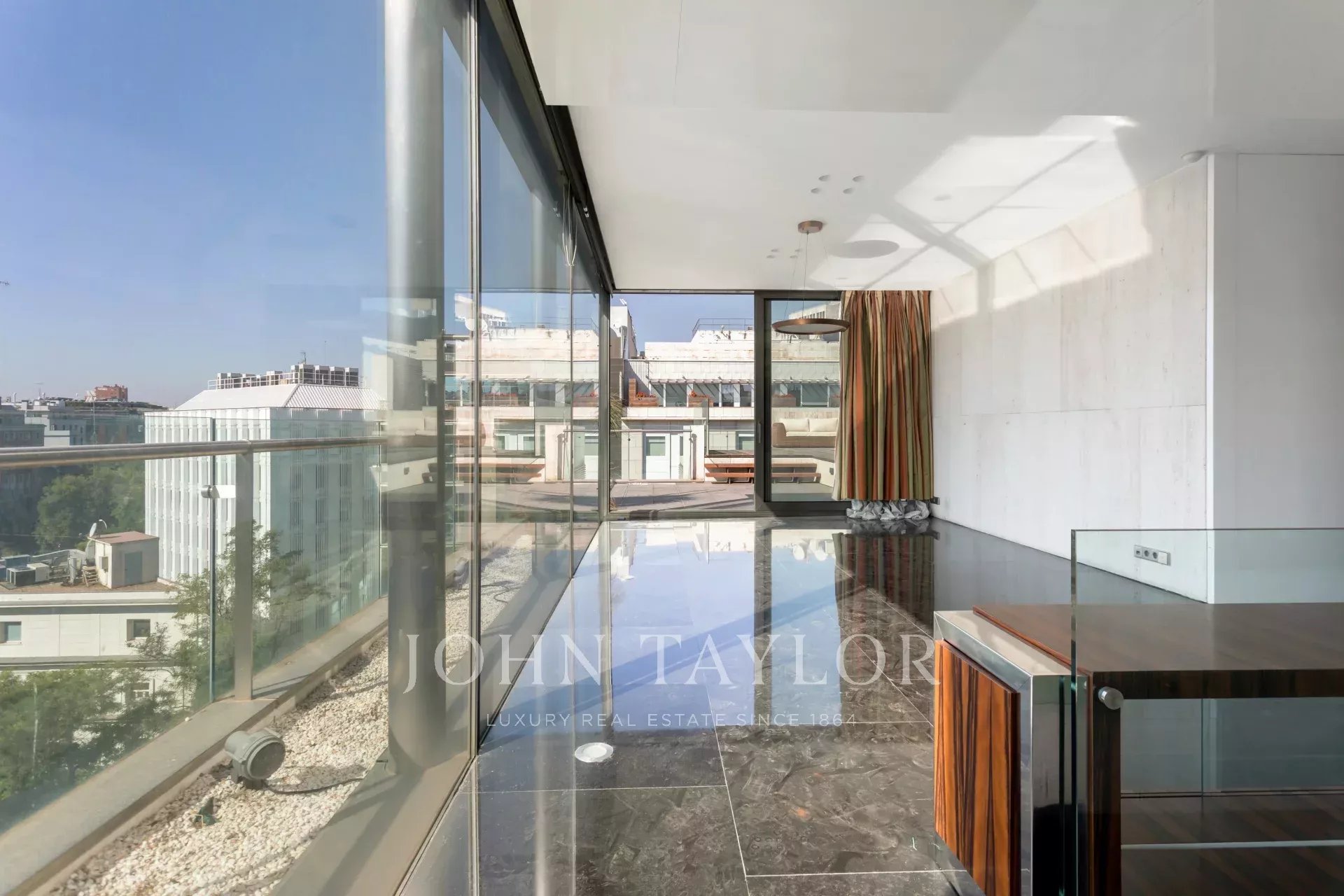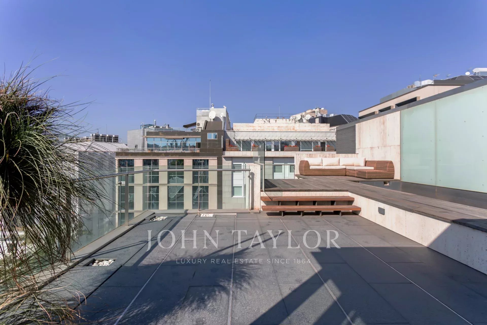 Он занимает весь верхний этаж, на двух уровнях, с общей жилой площадью 250 м² и более чем 100 м² террас.