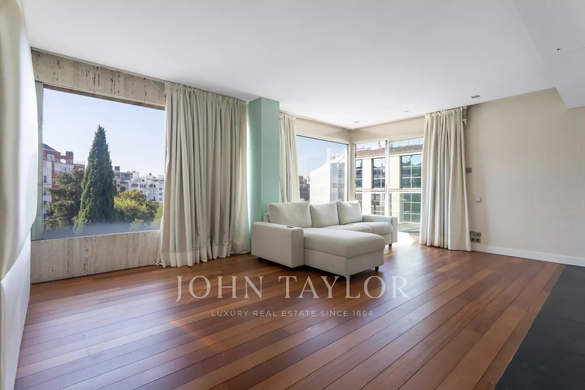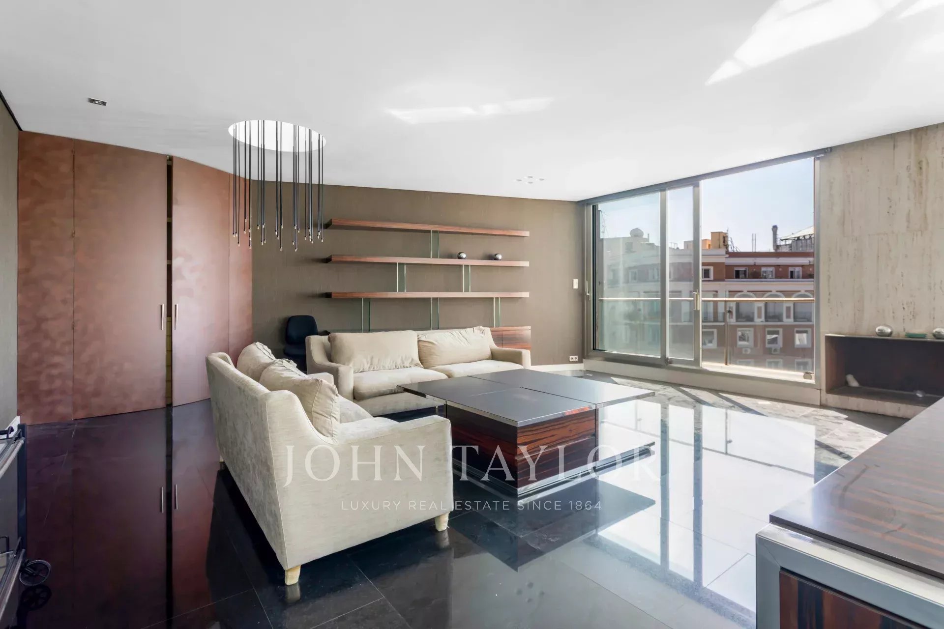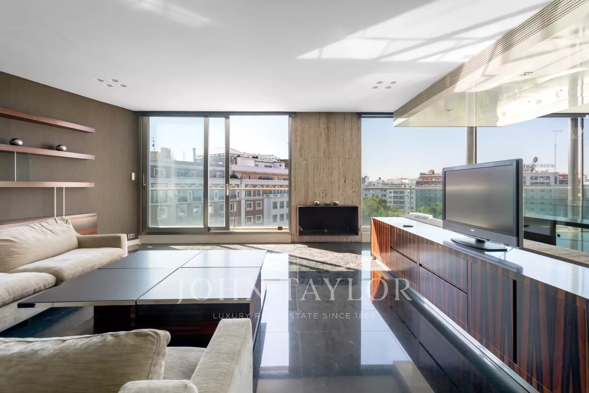 Он занимает весь верхний этаж, на двух уровнях, с общей жилой площадью 250 м² и более чем 100 м² террас.