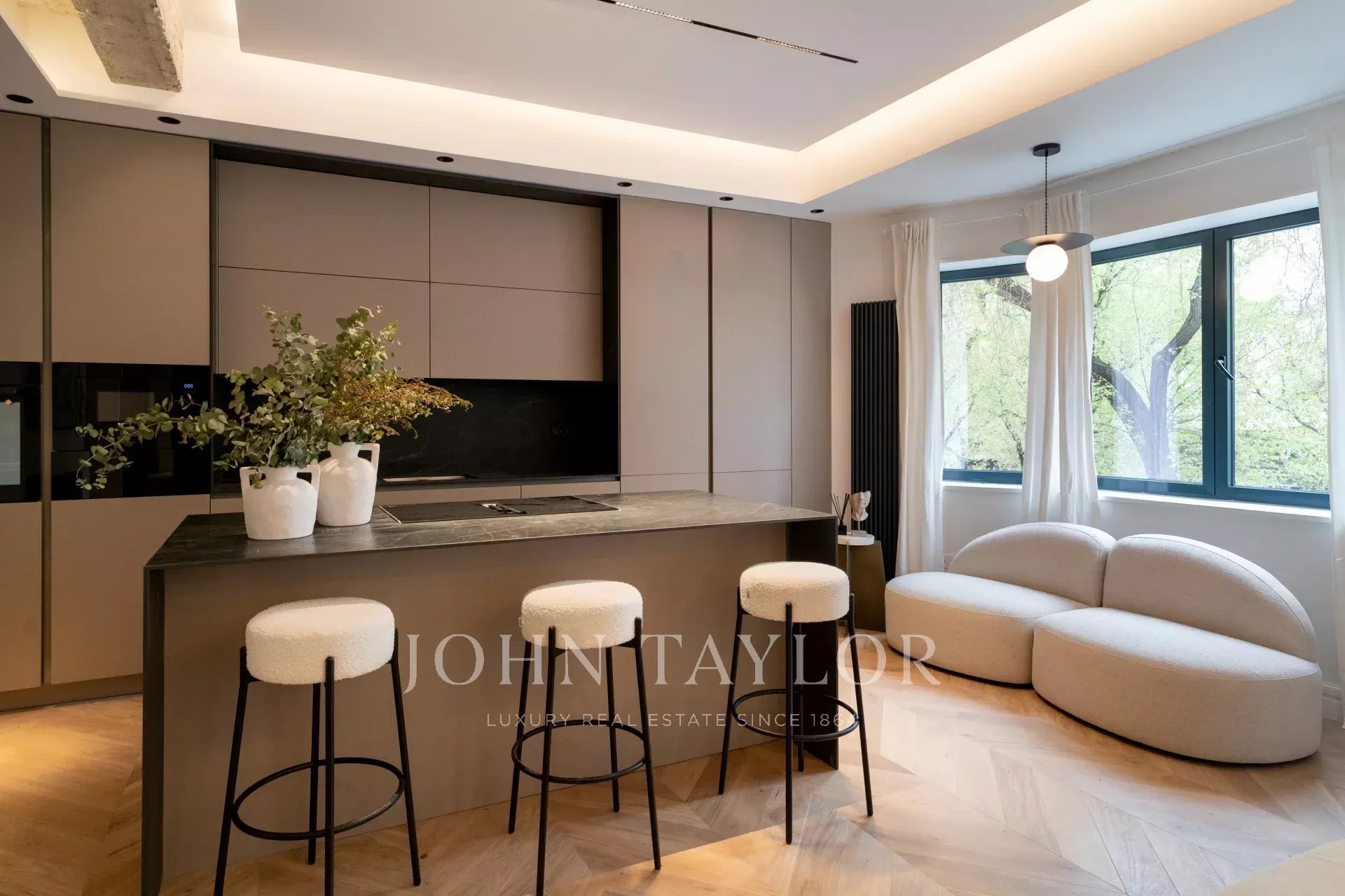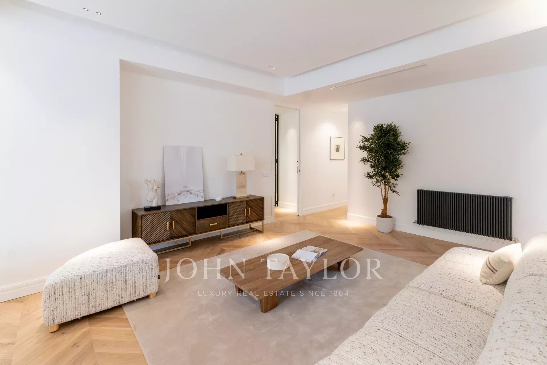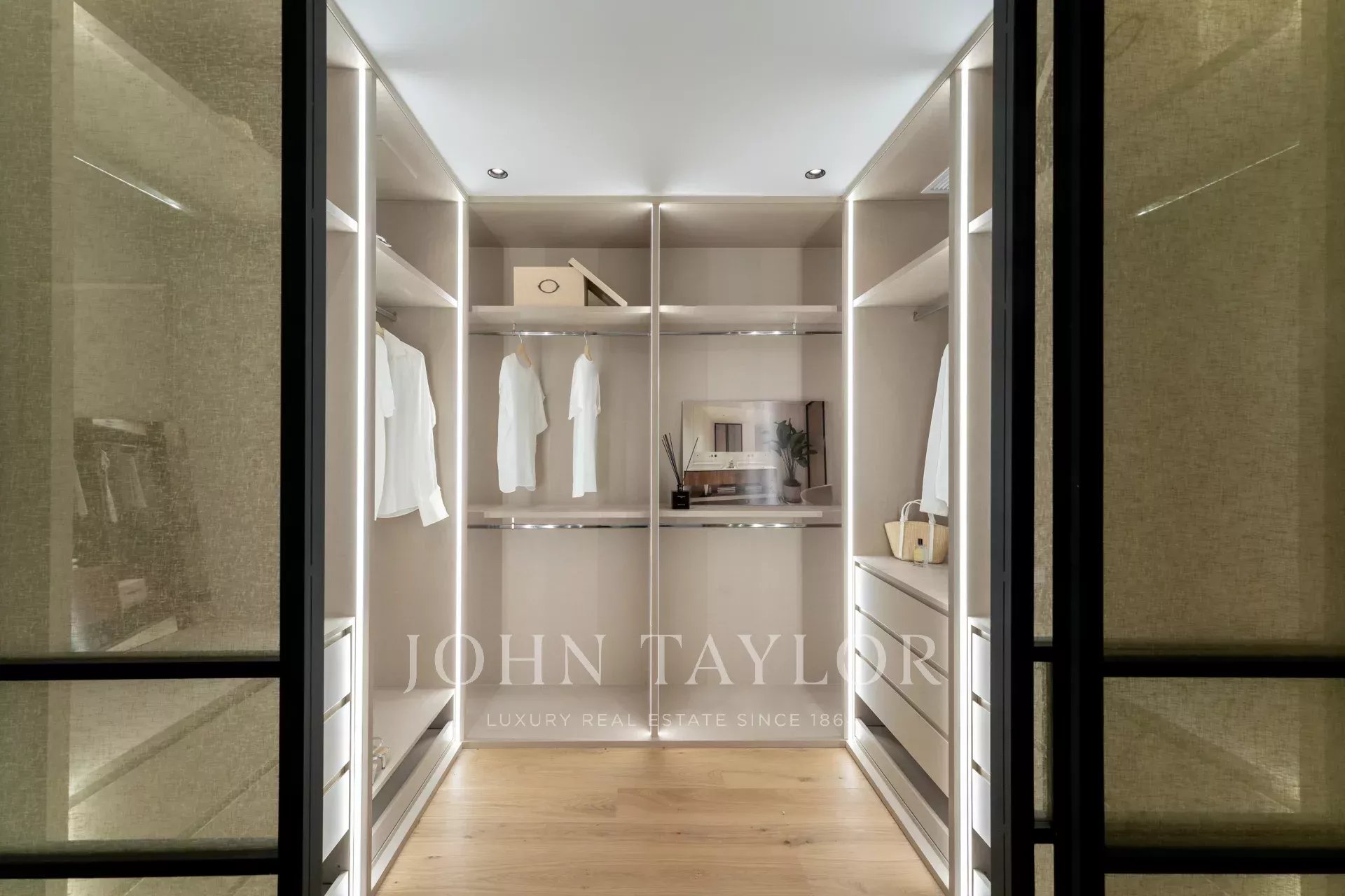 Эта квартира с открытой и светлой планировкой и 3-метровыми потолками была полностью отремонтирована в соответствии с современным дизайном. В квартире 3 спальни с двуспальными кроватями, ванными комнатами, просторными гардеробными и естественным освещением, а также спальня для персонала с отдельной ванной комнатой.