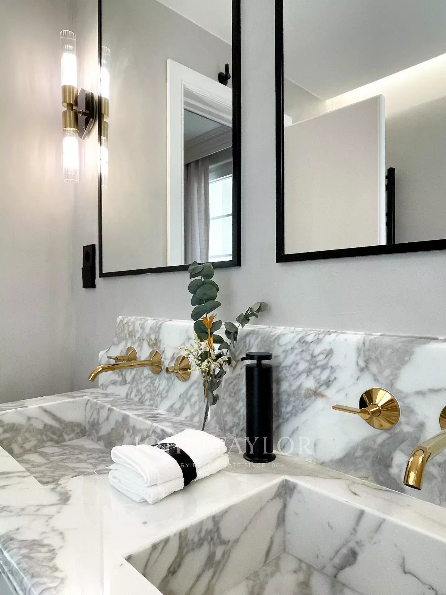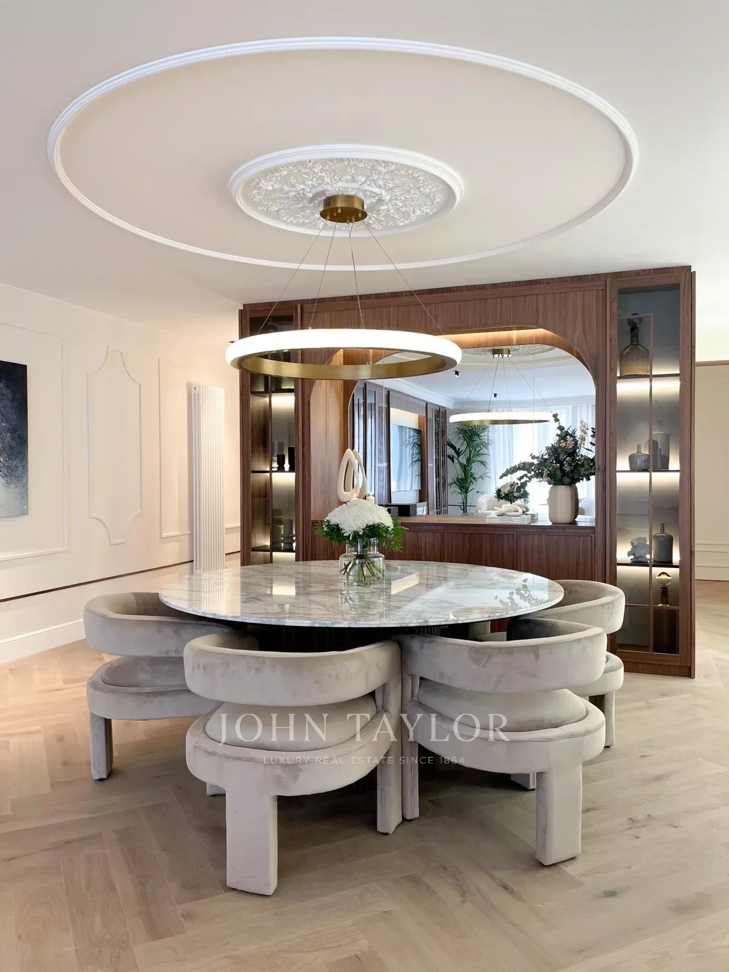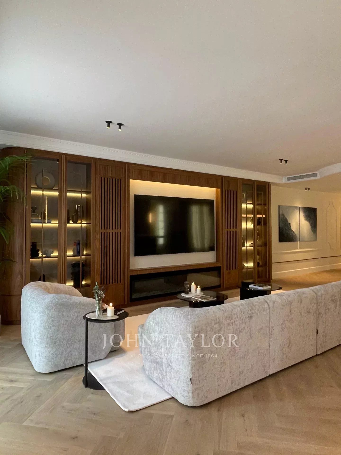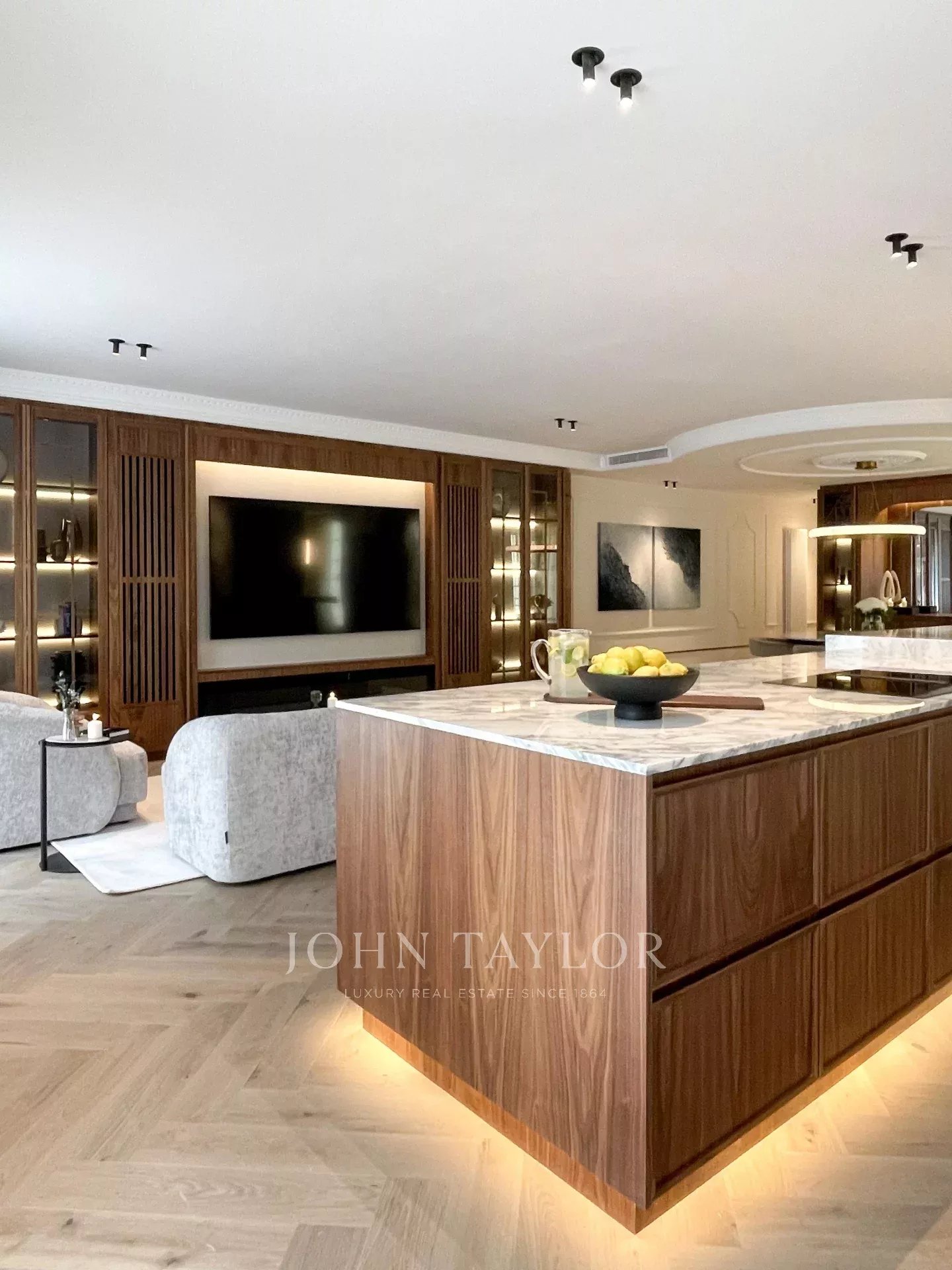 Мы входим в квартиру через большую приемную. С левой стороны находится социальная зона с большой гостиной, столовой и кухней открытой планировки, полностью оборудованной, с большим центральным островом и отдельной прачечной. В этой зоне также есть гостевой туалет.