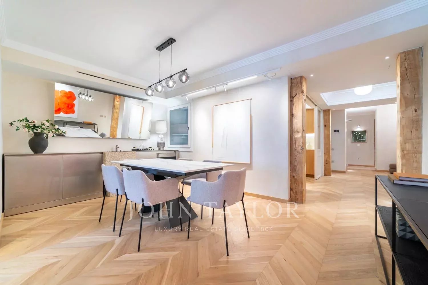 Квартира площадью 175 м² была полностью отремонтирована, сочетая в себе очарование классической архитектуры с современным и изысканным дизайном интерьера. Квартира имеет прекрасную западную ориентацию, благодаря чему в основные помещения проникает большое количество естественного света.