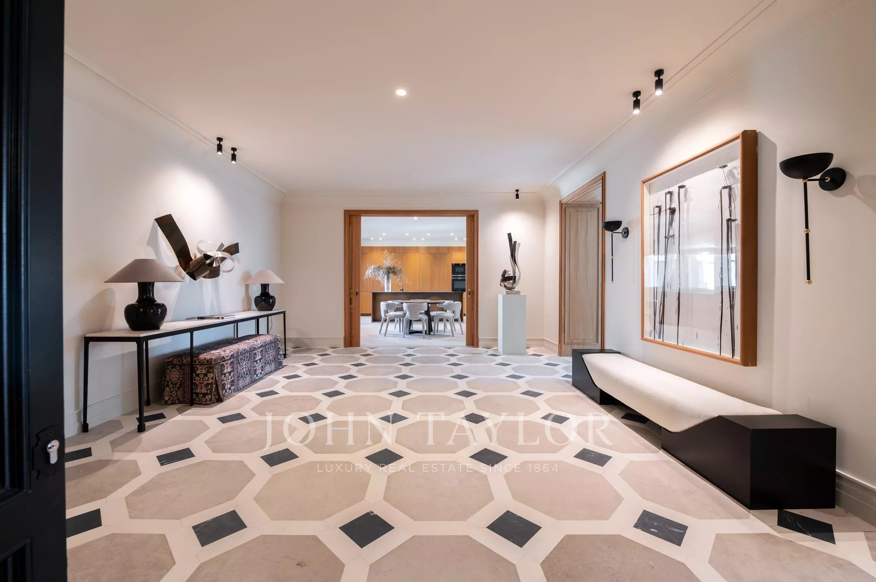 Нас встречает внушительный холл с настоящей роскошной отделкой. Благодаря великолепной планировке, с одной стороны вы можете попасть в зону гостиной-столовой-кухни, а с другой - в коридор, ведущий к зонам отдыха.