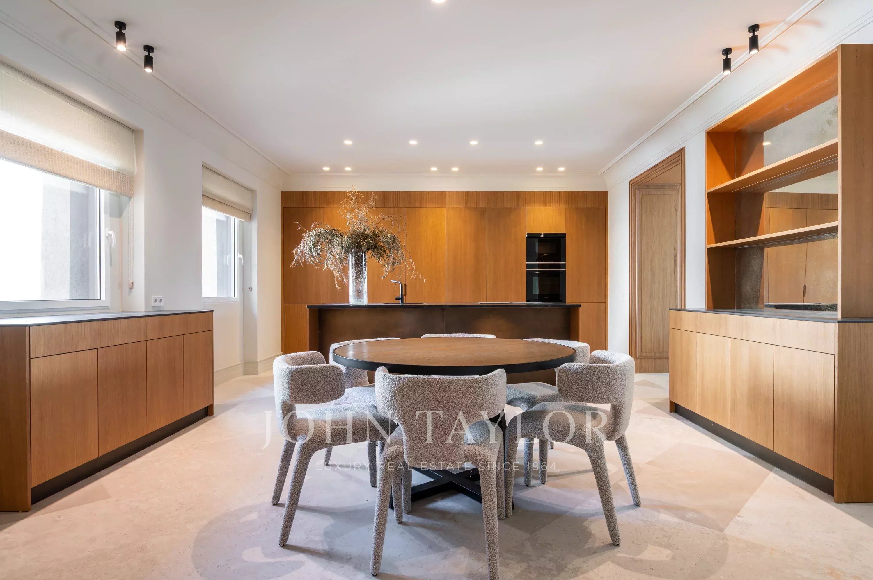 Дизайнерская кухня имеет большой центральный остров и большое окно. Мы попадаем на эту замечательную кухню из гостиной-столовой через раздвижные двери, которые можно скрыть, чтобы создать единое большое пространство. Лакированная мебель, кварцевые столешницы, продуманное освещение и много пространства определяют кухню, соответствующую категории этого дома.