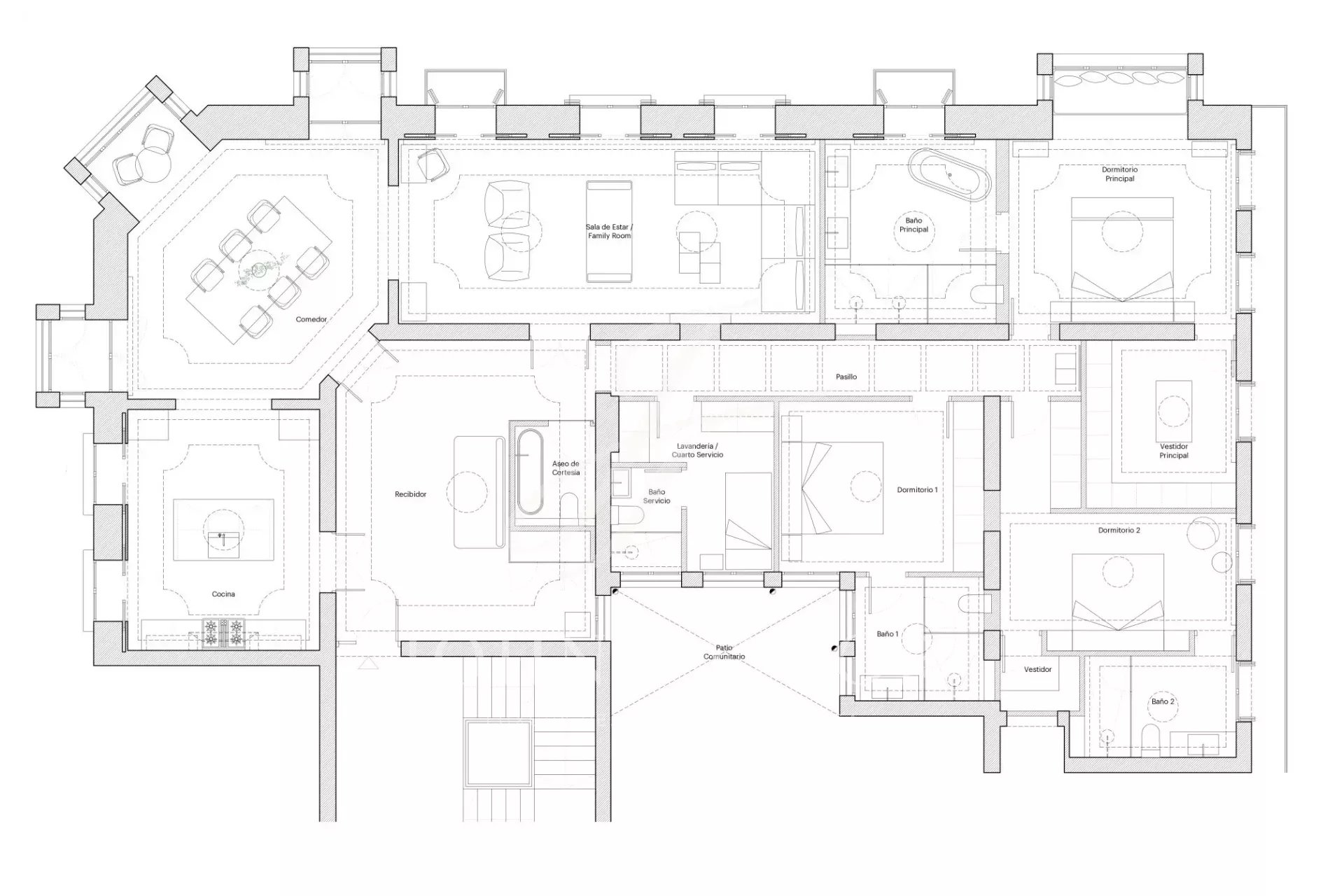 Один из возможных вариантов планировки - сделать 3 большие спальни с ванными комнатами и 1 служебную спальню. При такой конфигурации в углу будет большая столовая, внешняя кухня площадью 20 кв. м и большая гостиная, также внешняя.