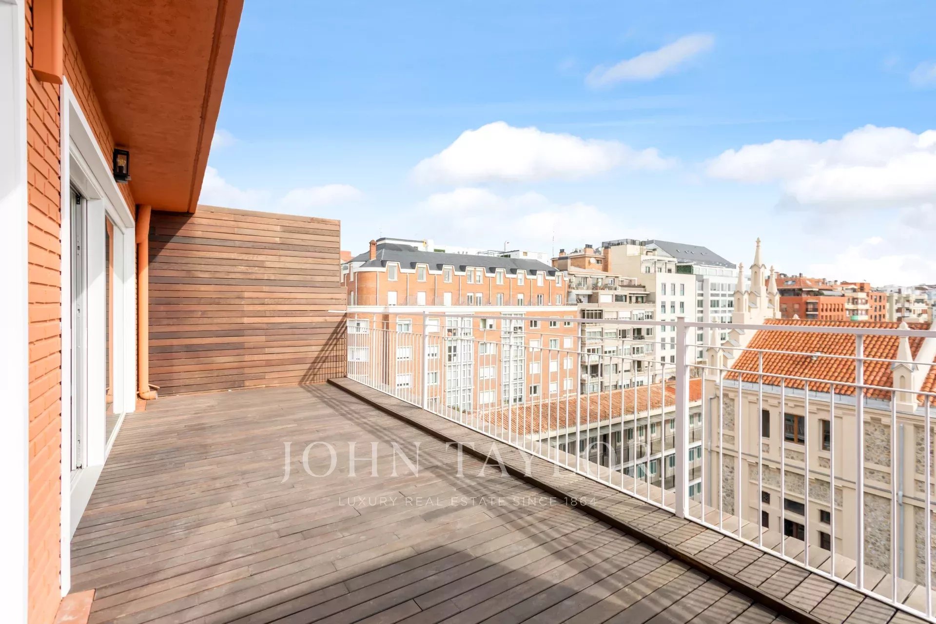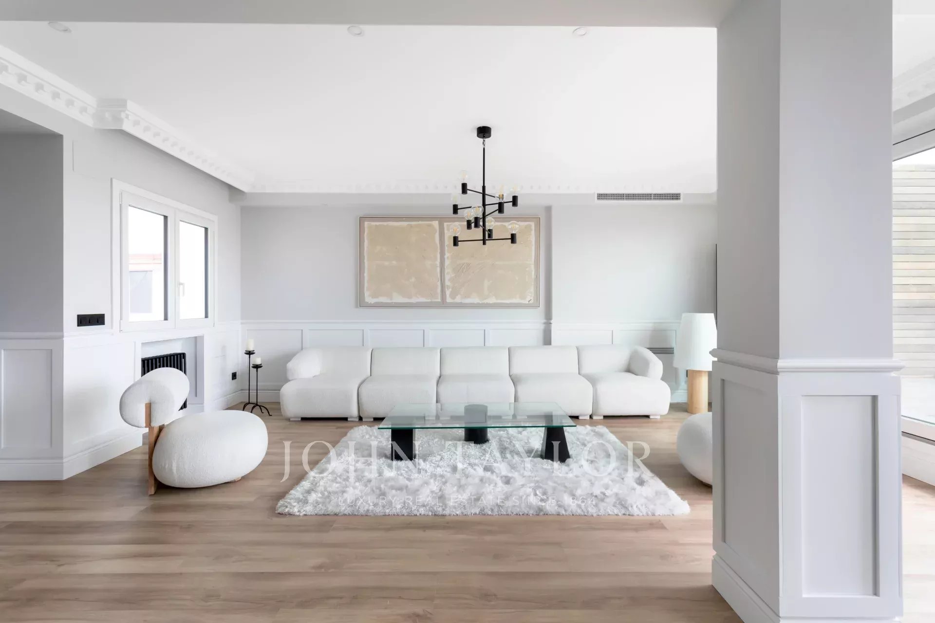 Внешнюю зону занимает большая гостиная/столовая с открытой кухней, оборудованной высококлассной техникой. Через большое раздвижное окно можно выйти на большую террасу с восточной ориентацией и непревзойденным панорамным видом на Колегио де Нуэстра Сеньора дель Пилар.