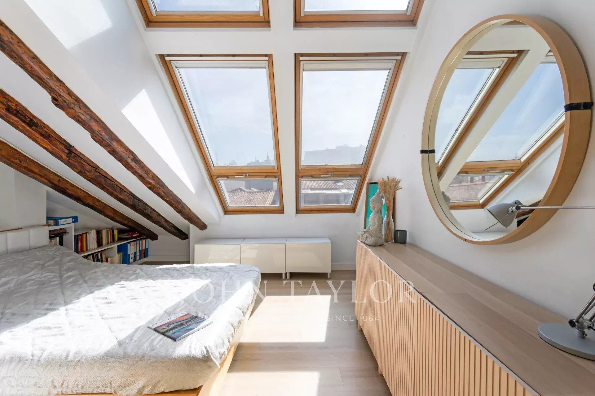 Окна гостиной и спальни выходят на улицу Алькала, откуда можно любоваться красивыми классическими зданиями и частью парка Ретиро. Это пентхаус для любителей солнца и естественного света.