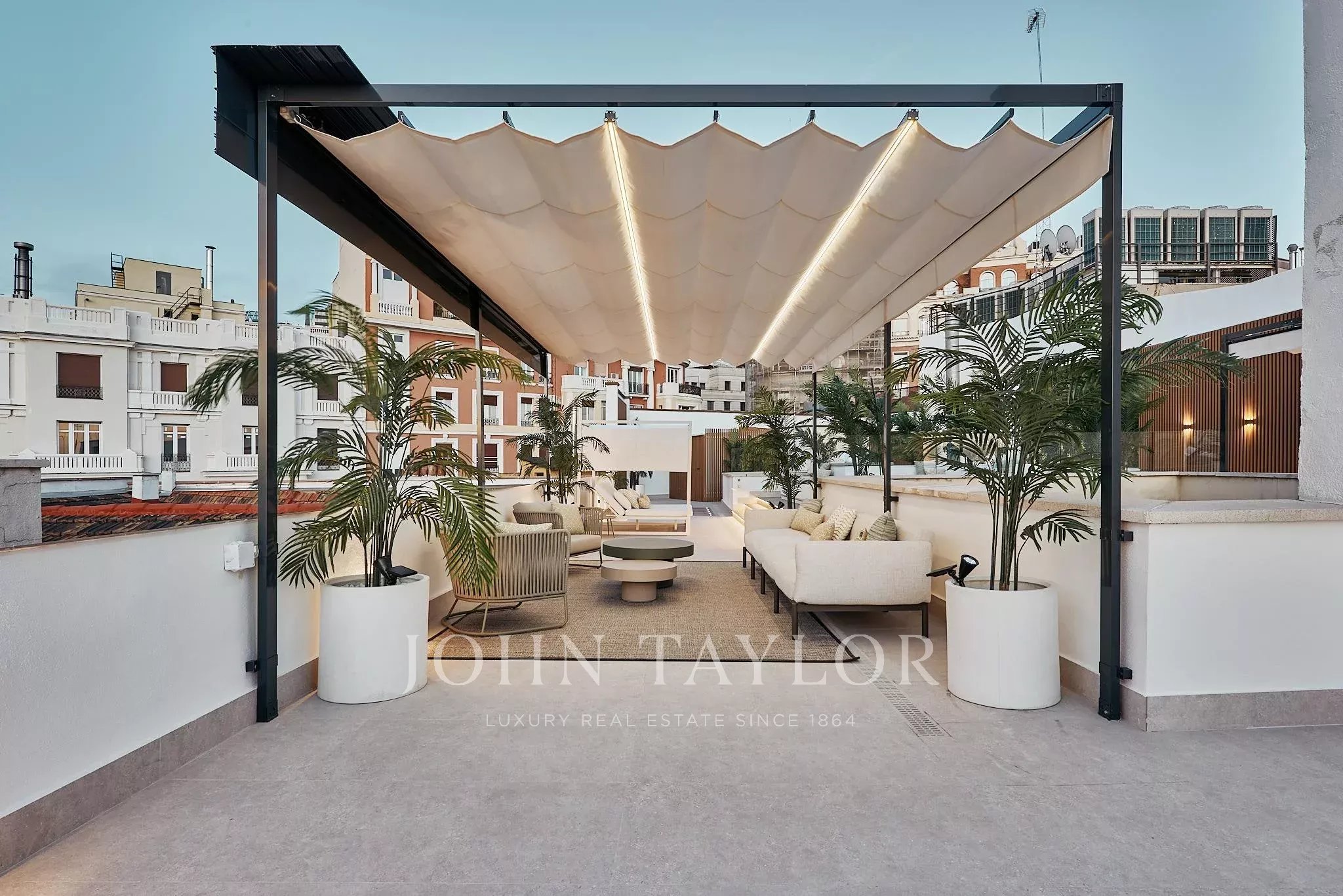 В элегантном классическом здании 1942 года, расположенном в знаковом районе Паласио, находится этот исключительный внешний пентхаус площадью 174 м², а также терраса площадью 301 м², что является собственностью, сочетающей характер традиционной архитектуры с современным дизайном интерьера.