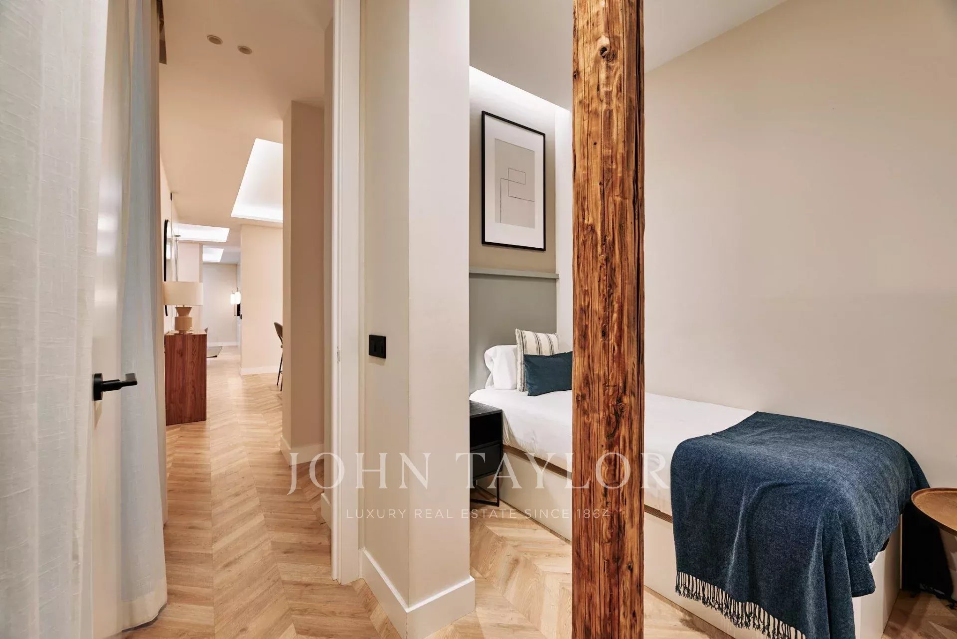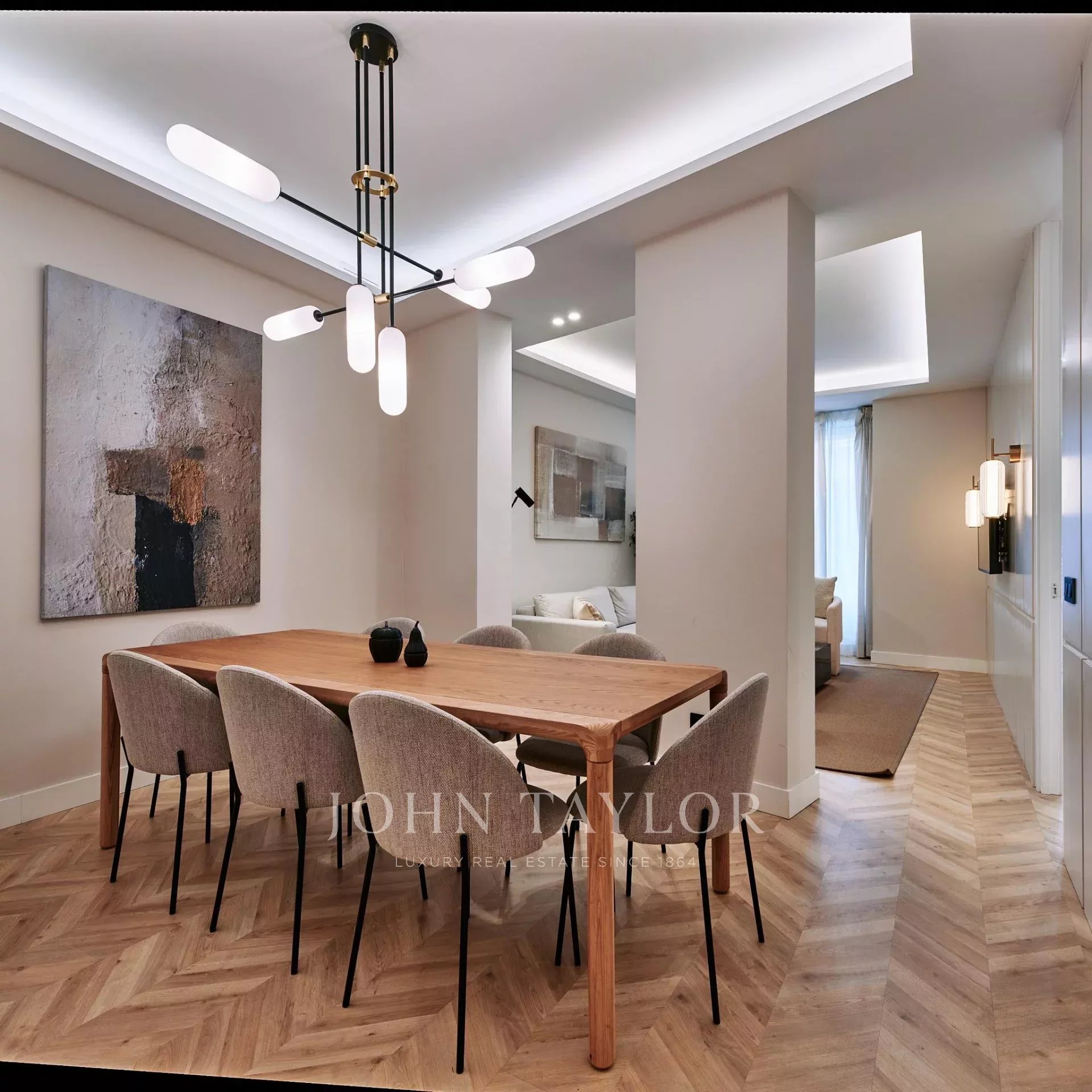 В квартире три просторные спальни и три полноценные ванные комнаты, две из которых с ванными комнатами, что обеспечивает приватность и комфорт в каждой комнате. Планировка была продумана таким образом, чтобы оптимизировать поступление естественного света, дополненного тщательно подобранным светодиодным освещением, которое подчеркивает деревянную отделку и сделанную на заказ дизайнерскую мебель.