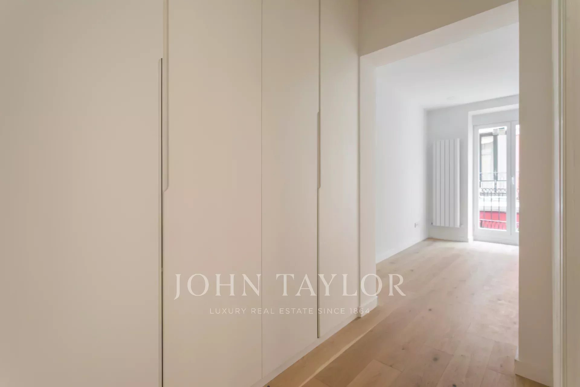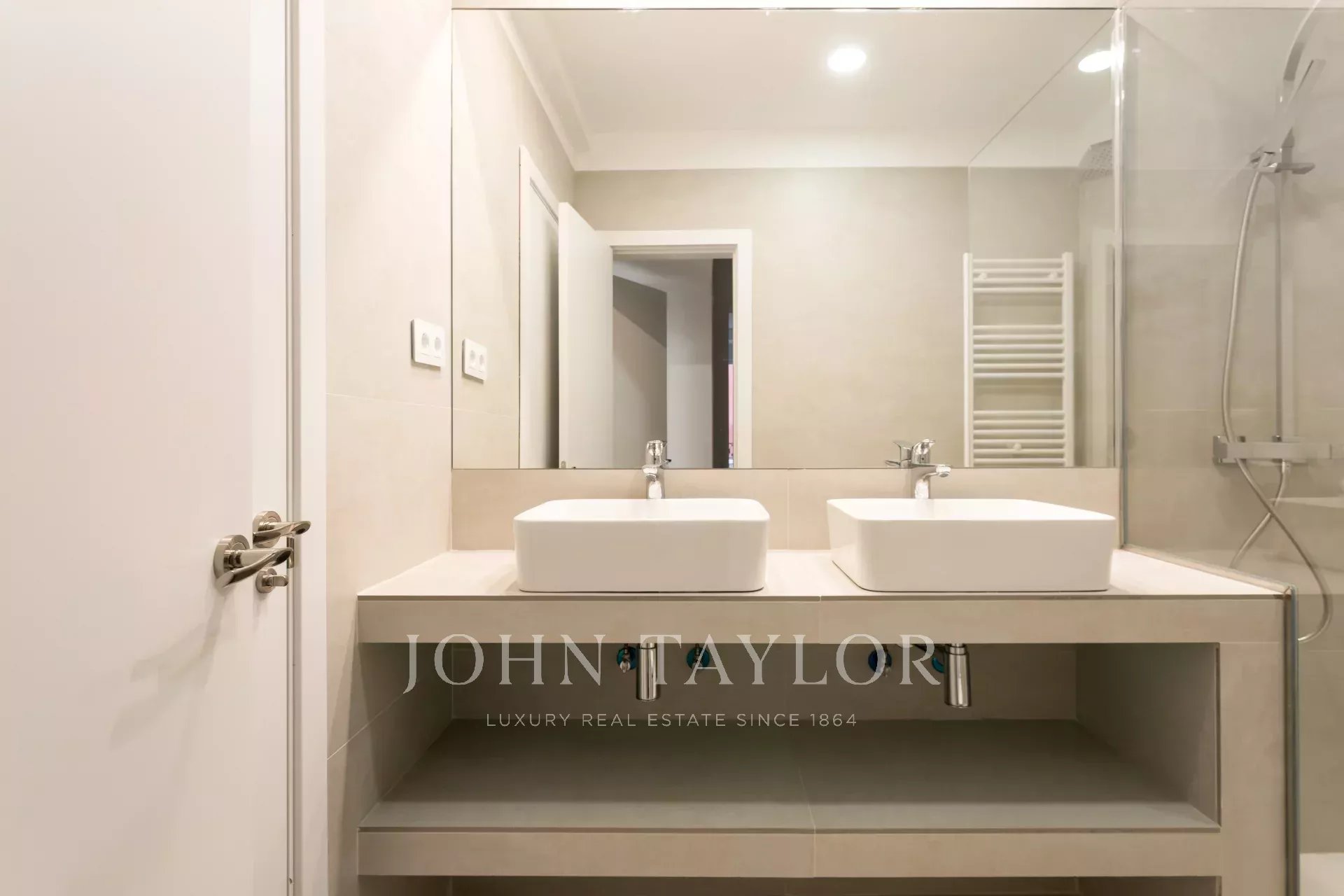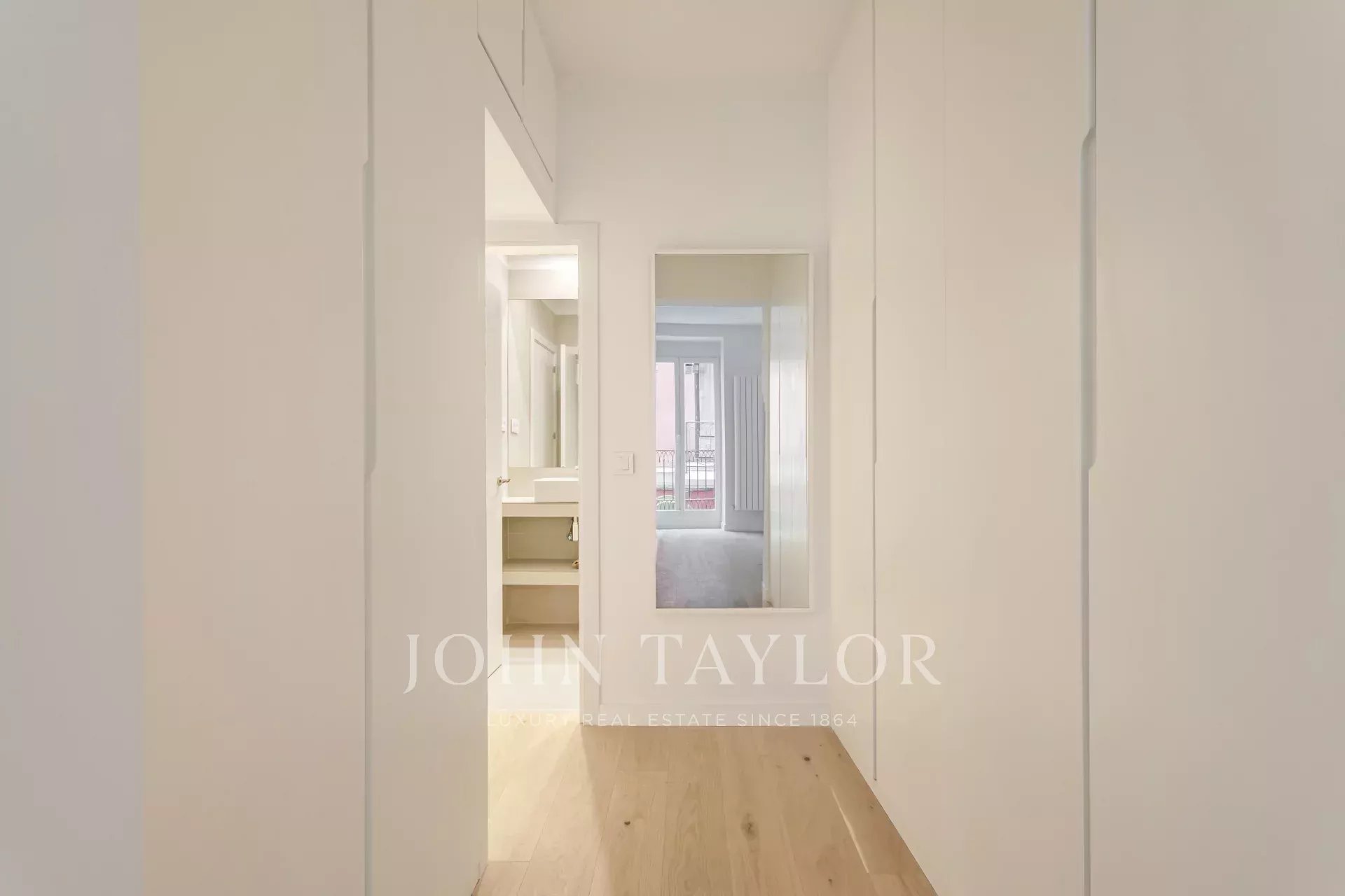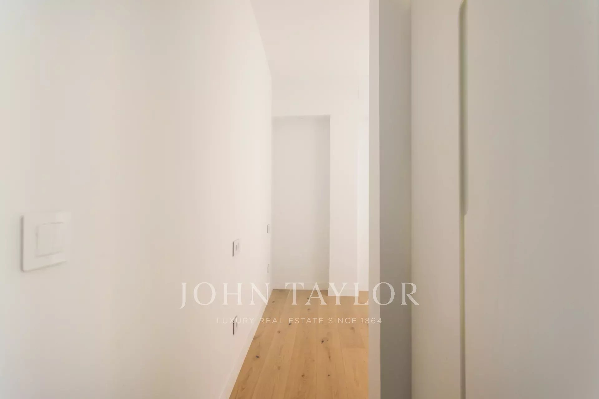 Площадь квартиры составляет 89 м², а ее идеальное распределение было продумано таким образом, чтобы максимально использовать свет и пространство. Благодаря южной ориентации и трем балконам, выходящим на усаженную деревьями улицу, каждая комната наполнена безмятежным светом, который подчеркивает благородство материалов и чистоту дизайна.