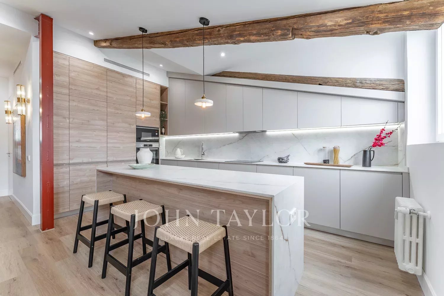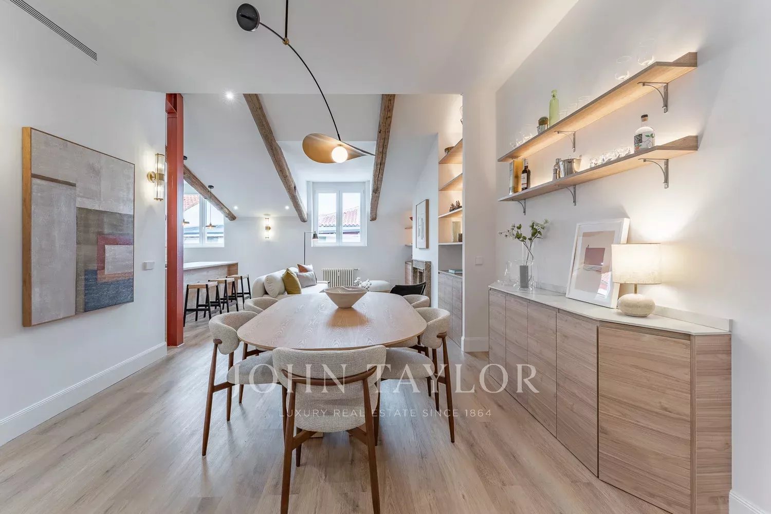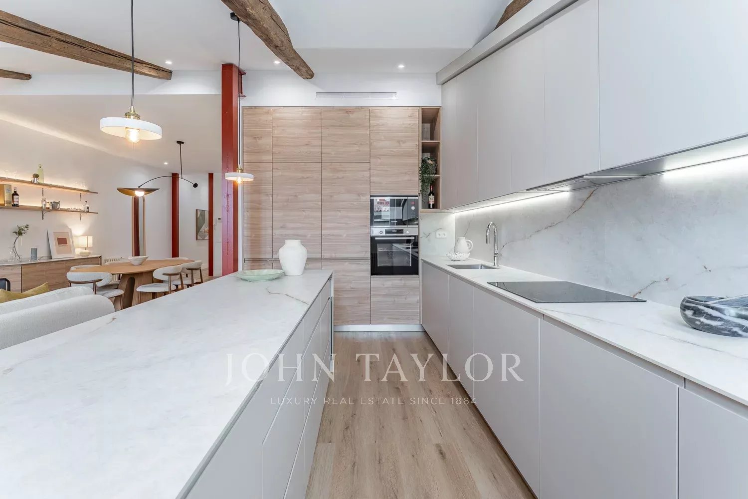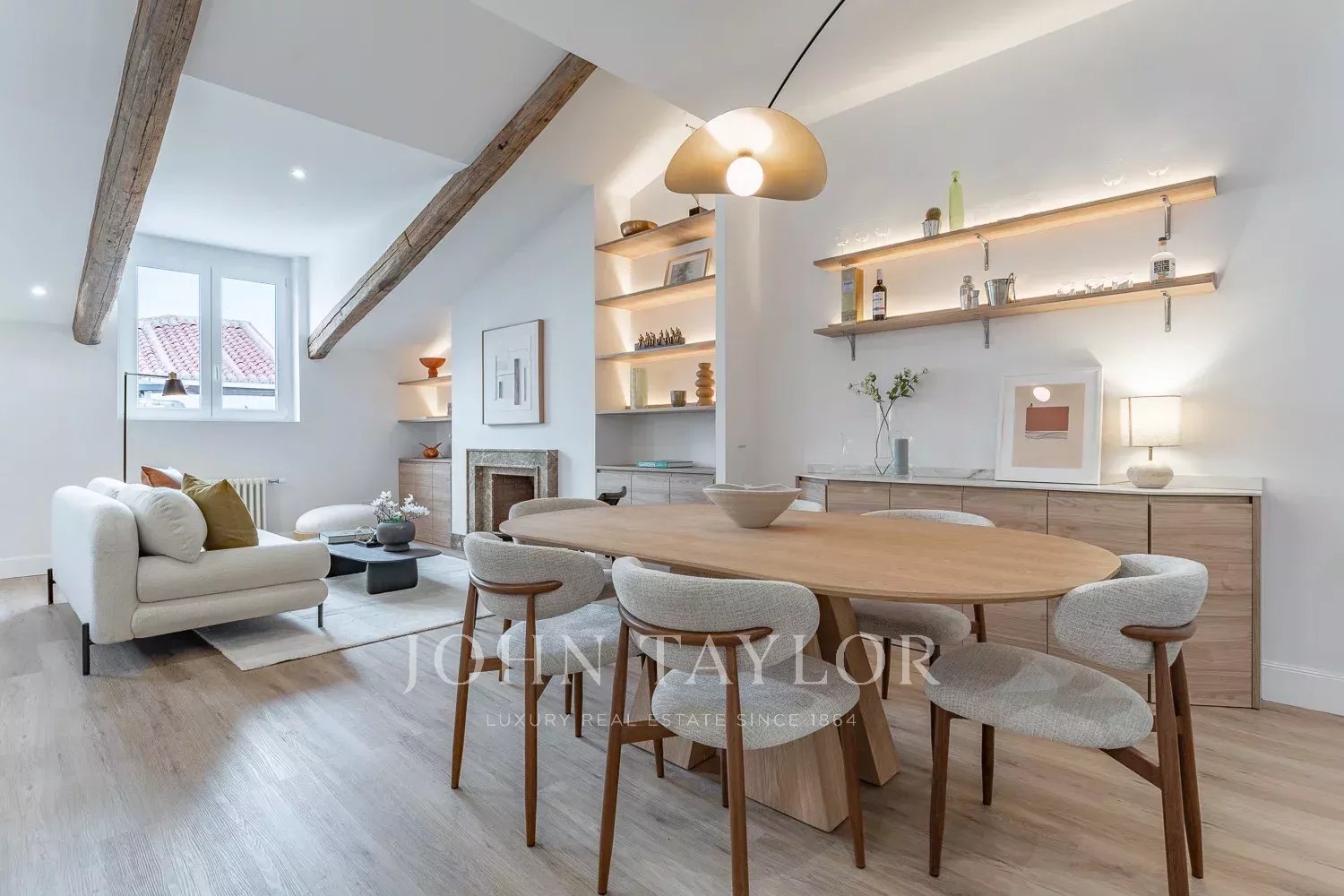 На последнем этаже классического здания расположена эта впечатляющая квартира площадью 137 м², недавно отремонтированная с изысканным вкусом, сочетающая в себе изысканность, естественное освещение и дизайн, призванный заставить вас влюбиться с первого мгновения.