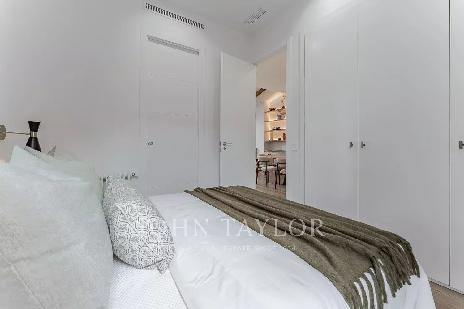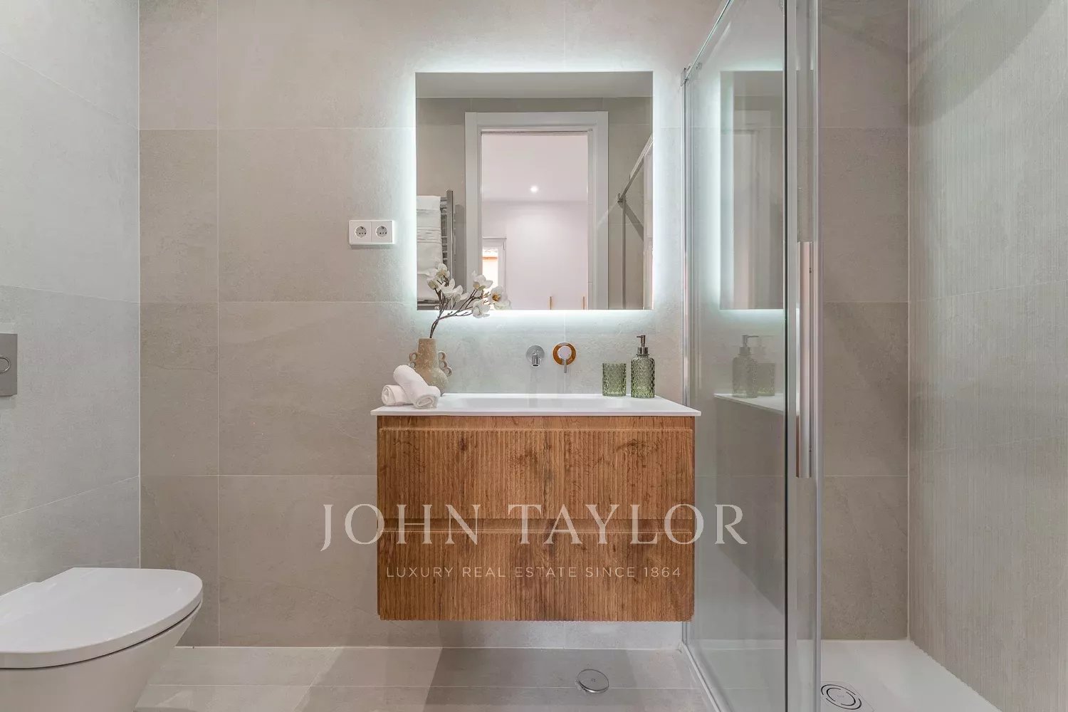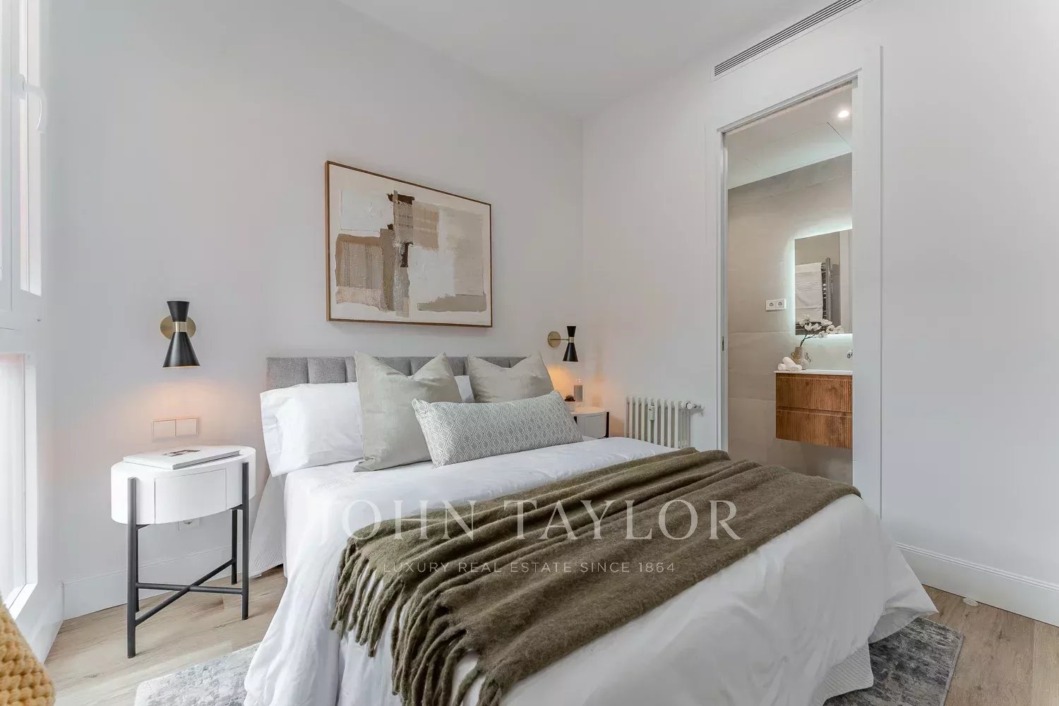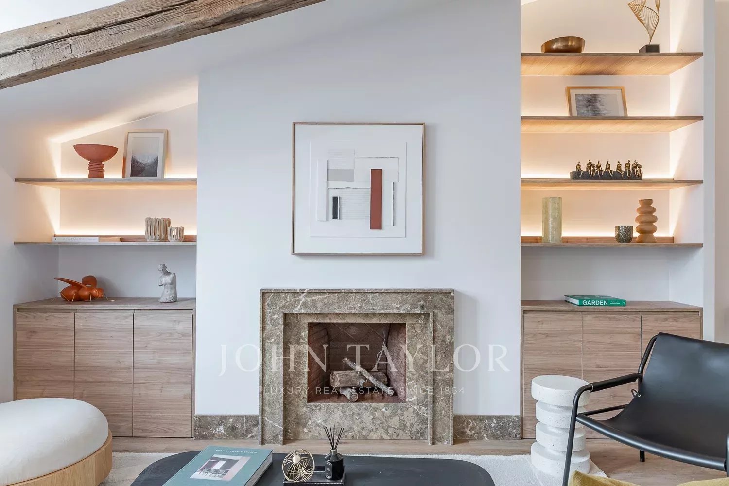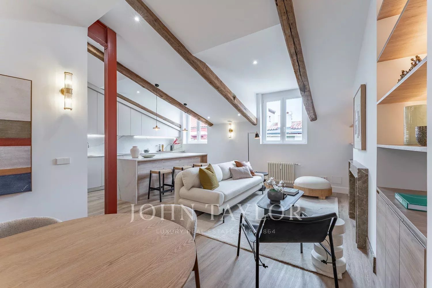 На последнем этаже классического здания расположена эта впечатляющая квартира площадью 137 м², недавно отремонтированная с изысканным вкусом, сочетающая в себе изысканность, естественное освещение и дизайн, призванный заставить вас влюбиться с первого мгновения.