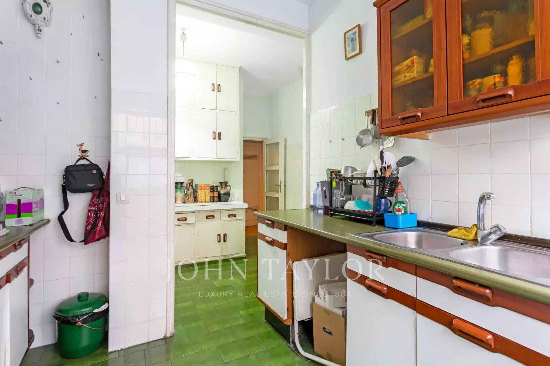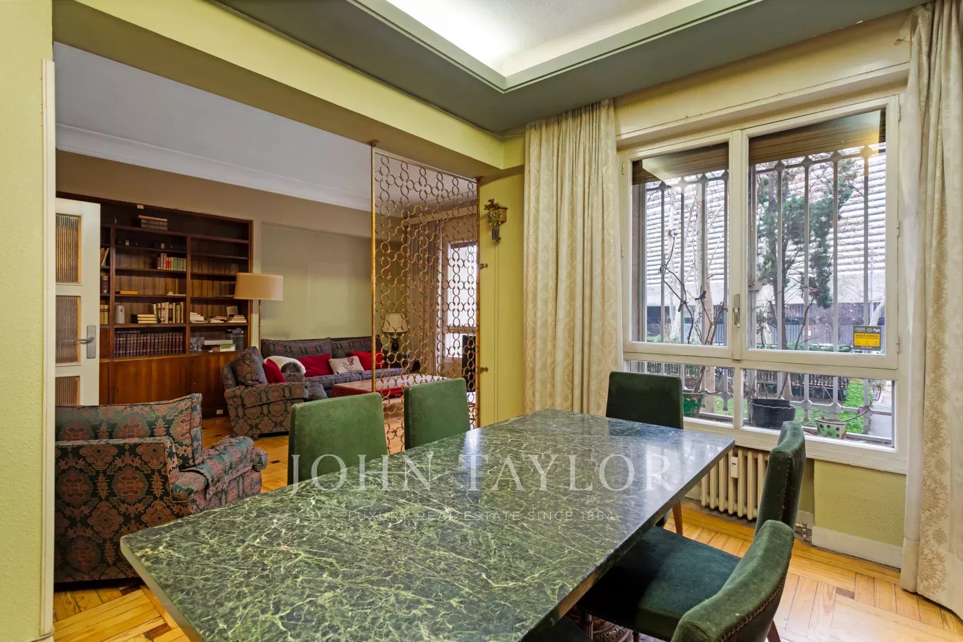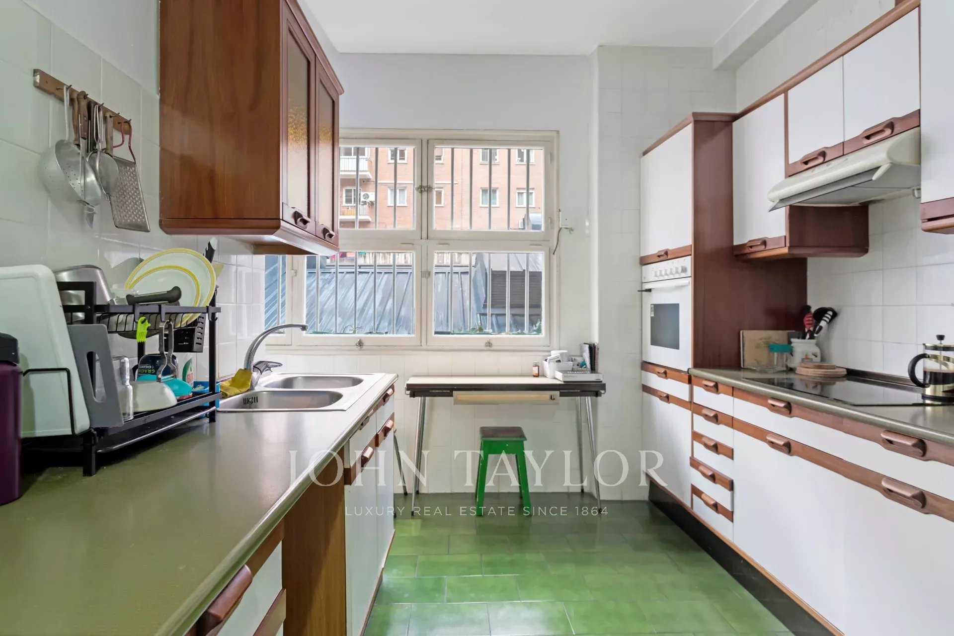 Это одноэтажная квартира на втором этаже с внешней южной ориентацией и реальной высотой 1-го этажа. Сторож / консьерж с квартирой в том же здании. Центральное отопление и водоснабжение с индивидуальными счетчиками по радиочастоте.