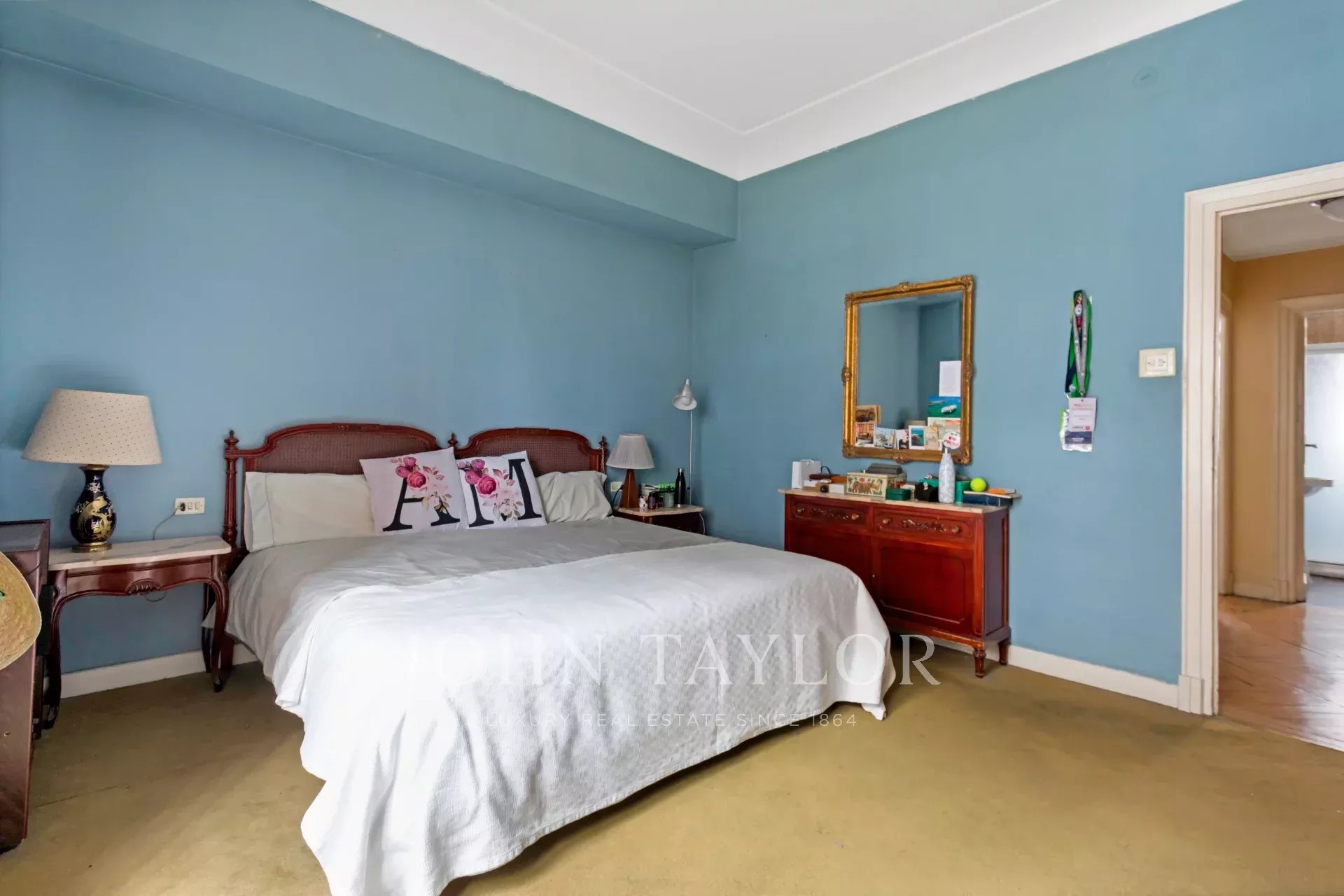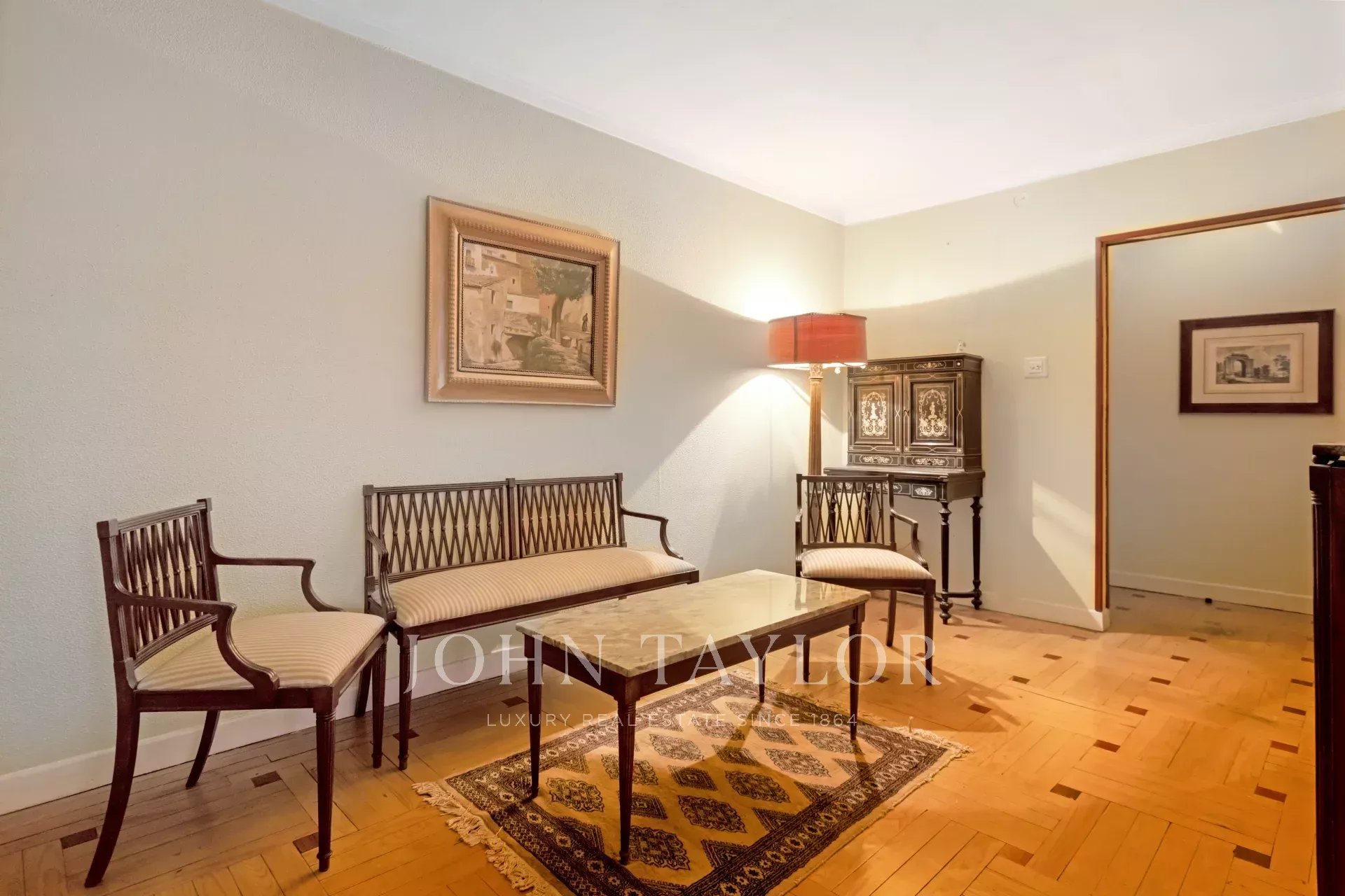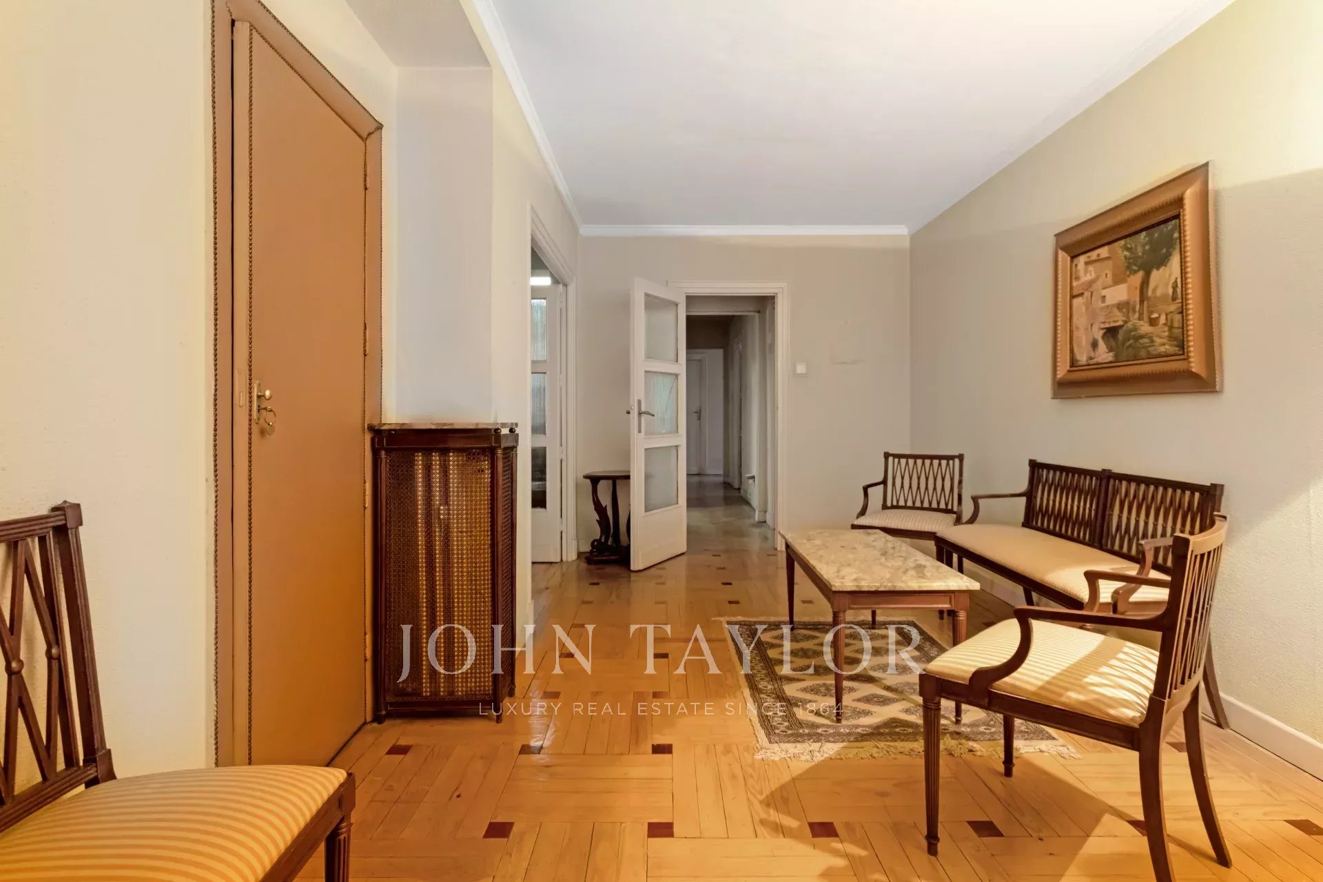 Квартира, площадью 186 м², с очень квадратной планировкой, состоит из четырех спален, одна из которых служебная, трех ванных комнат, просторной гостиной, столовой и кухни. Кроме того, имеется практичное отдельное подсобное помещение, а также просторная прихожая площадью 20 м².