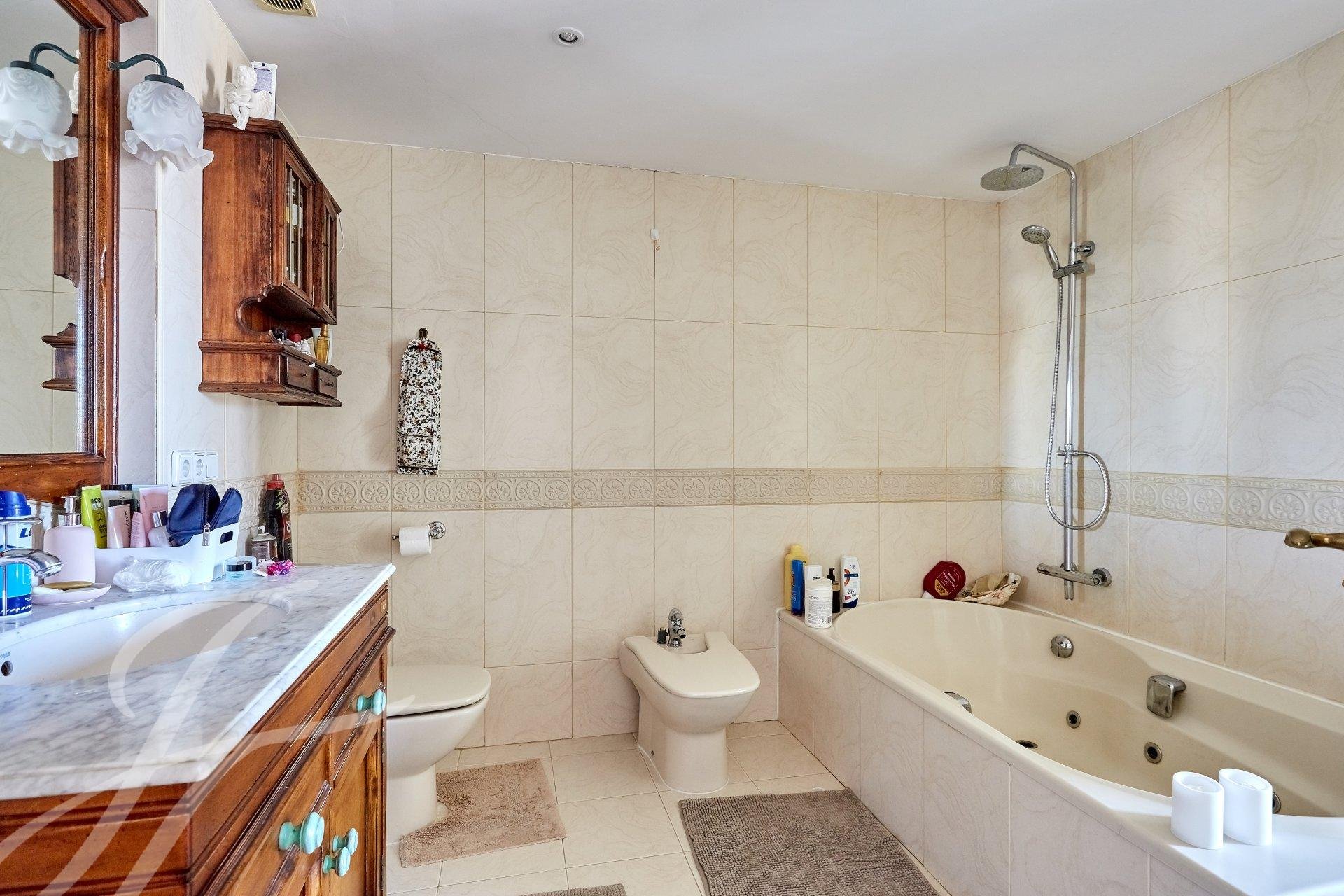 Мы входим в дом через светлый холл с гостевым туалетом, из которого можно попасть в комнату, которая в настоящее время используется в качестве личного кабинета. Мы попадаем в просторную гостиную с тремя комнатами с большими окнами, одна из которых с камином. Стоит отметить прекрасный вид и освещенность этих комнат, благодаря их южной ориентации. Переходим в зону отдыха, где находится главная спальня (изначально две) с гардеробной, ванной комнатой, отделанной мрамором, и небольшой террасой, а также две спальни с выходом на другую террасу, которые обслуживаются ванной комнатой.