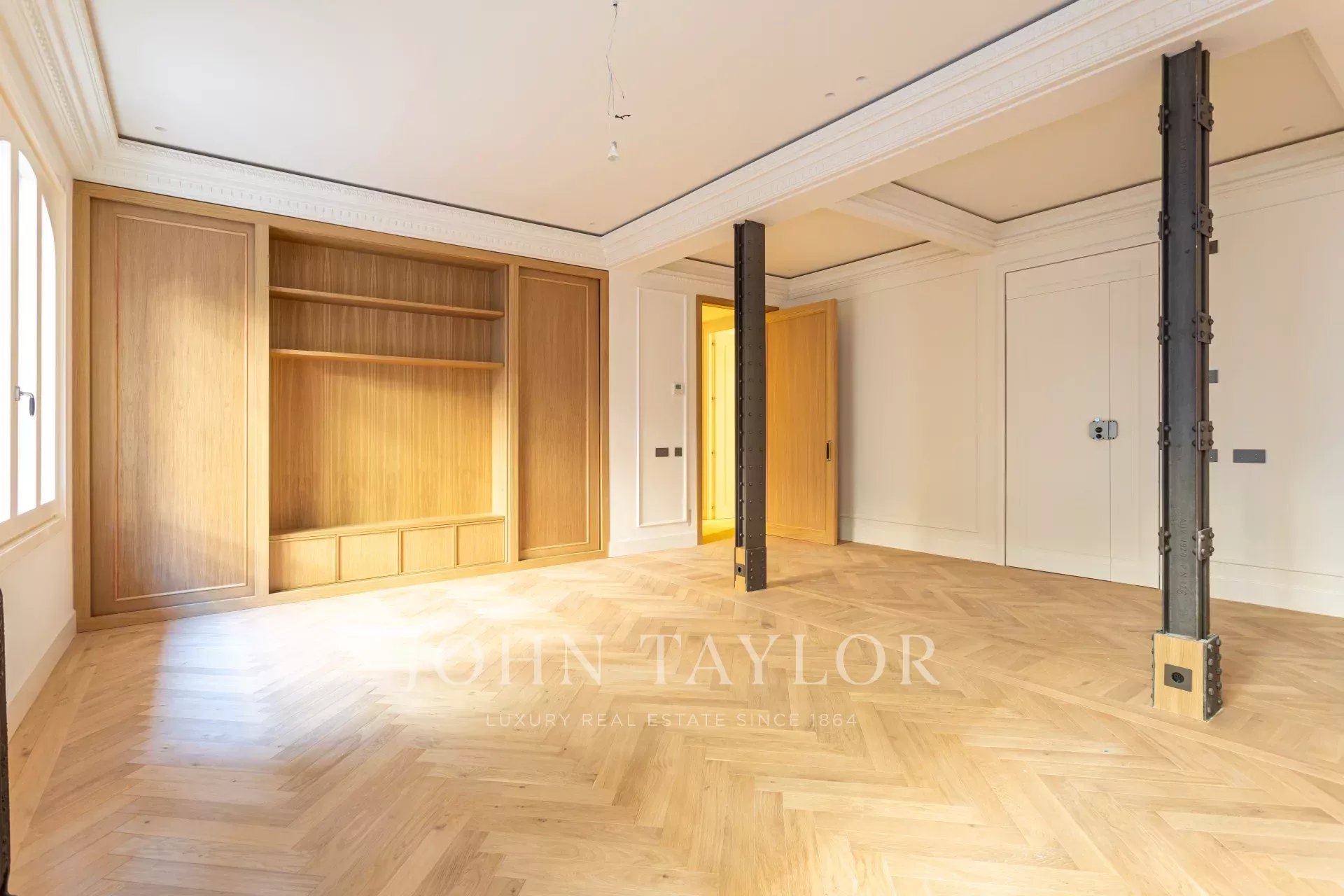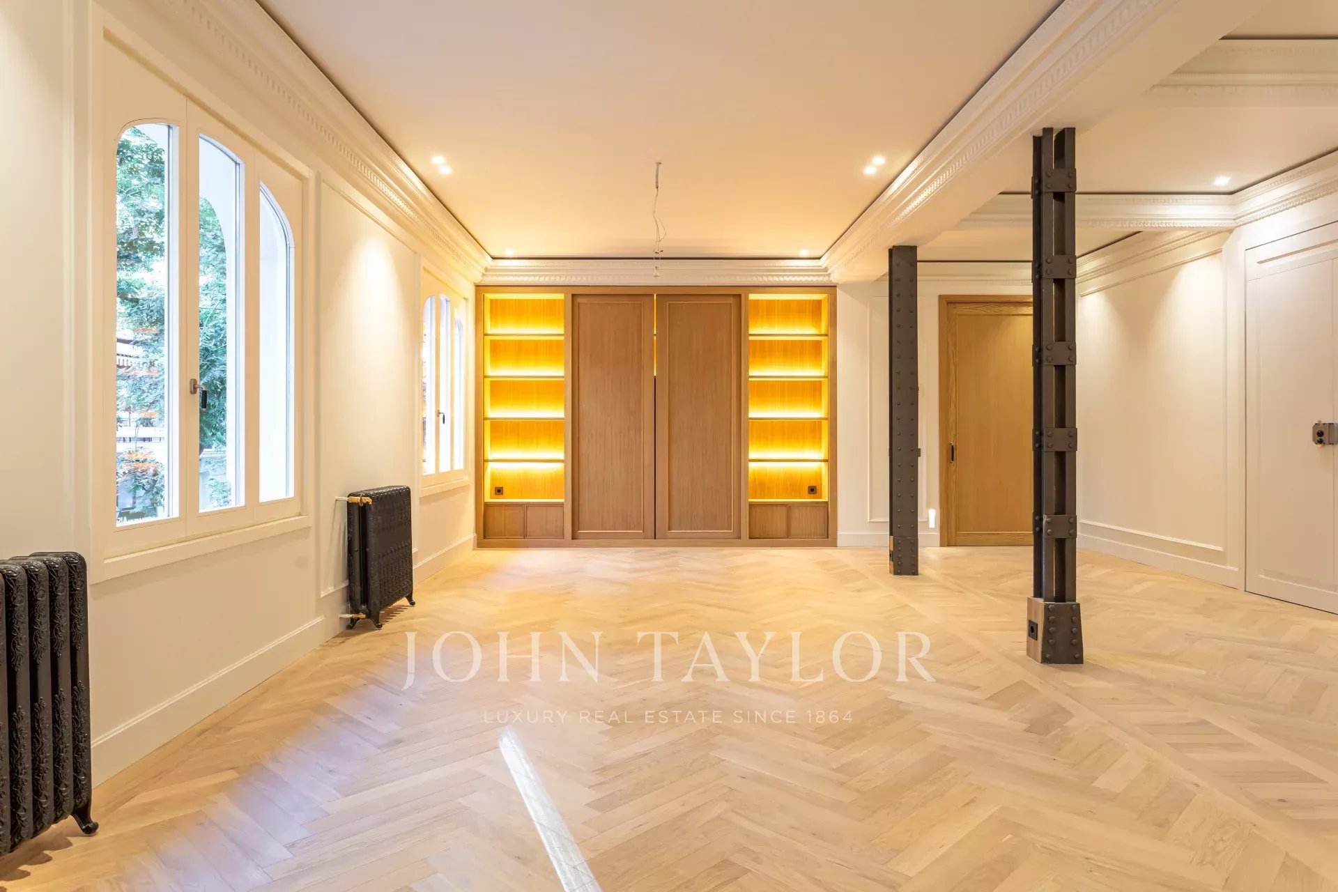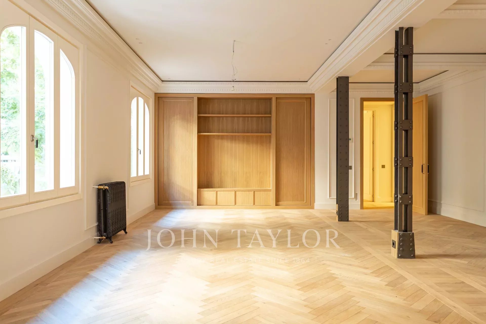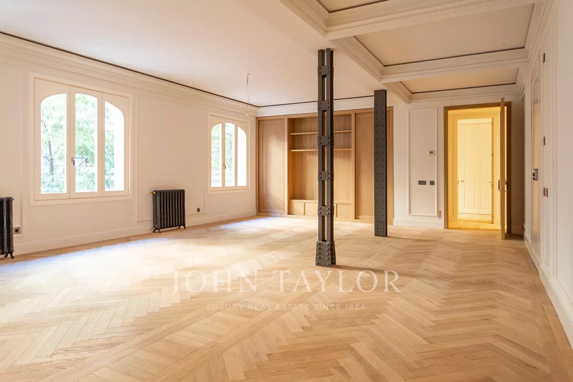 Гостиная и столовая очень просторные, открытого плана, с оригинальными железными колоннами и дубовым шкафом для книг и телевизора, сделанным на заказ. В квартире 4 полные и просторные спальни со встроенными шкафами. Ванные комнаты отделаны мрамором и оснащены высококачественной фурнитурой. Кухня была спроектирована Gunni&Trentino и полностью оборудована техникой Miele, как того и заслуживает категория этой недвижимости. Кухня полуинкорпорирована и имеет отдельную прачечную, оборудованную стиральной машиной и сушилкой, гладильной поверхностью и сушильной стойкой.