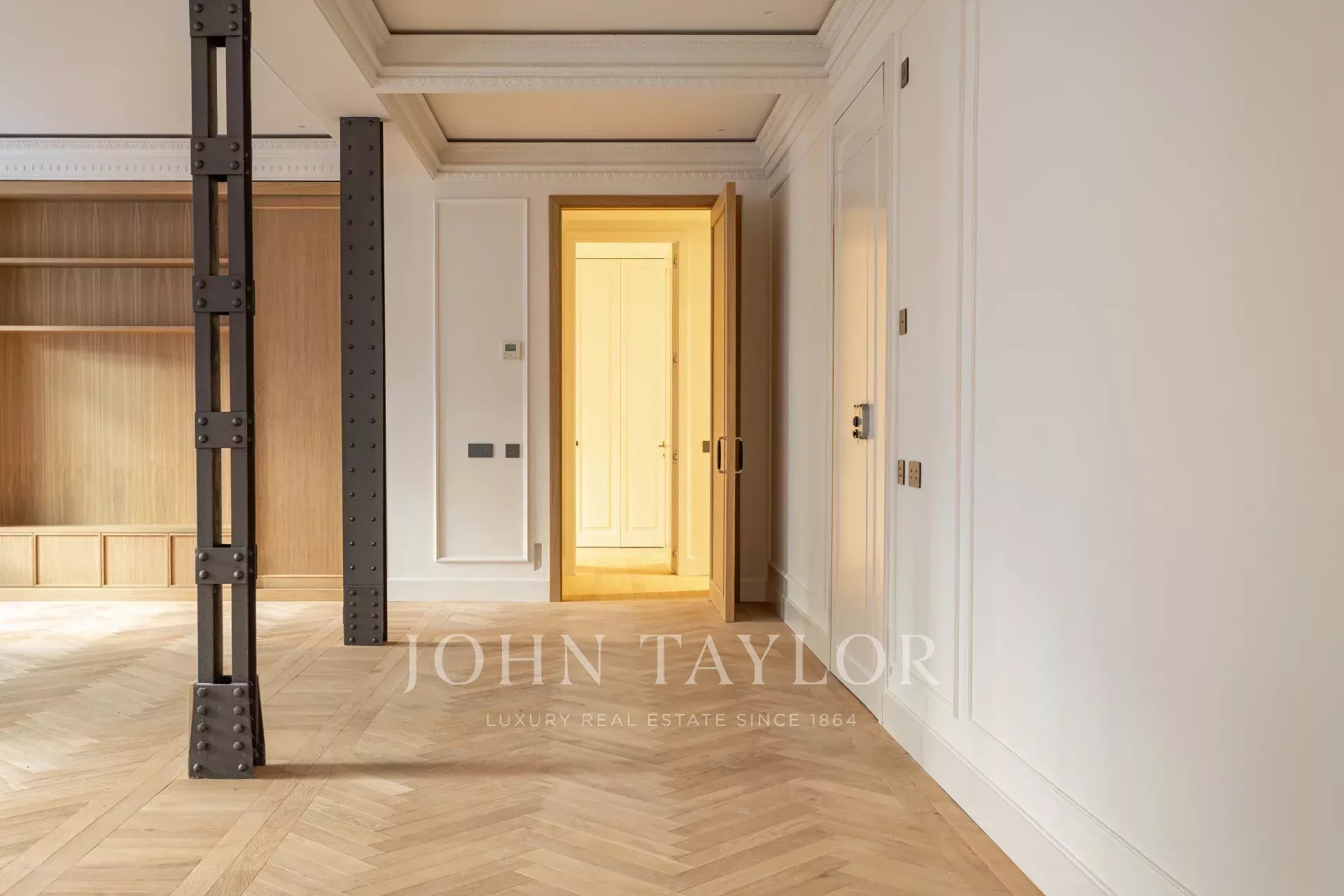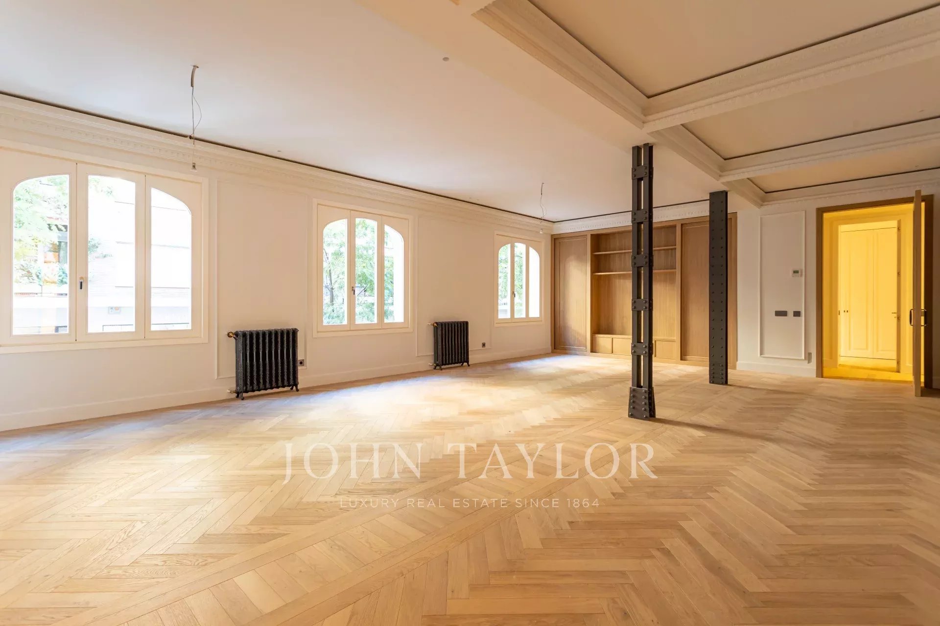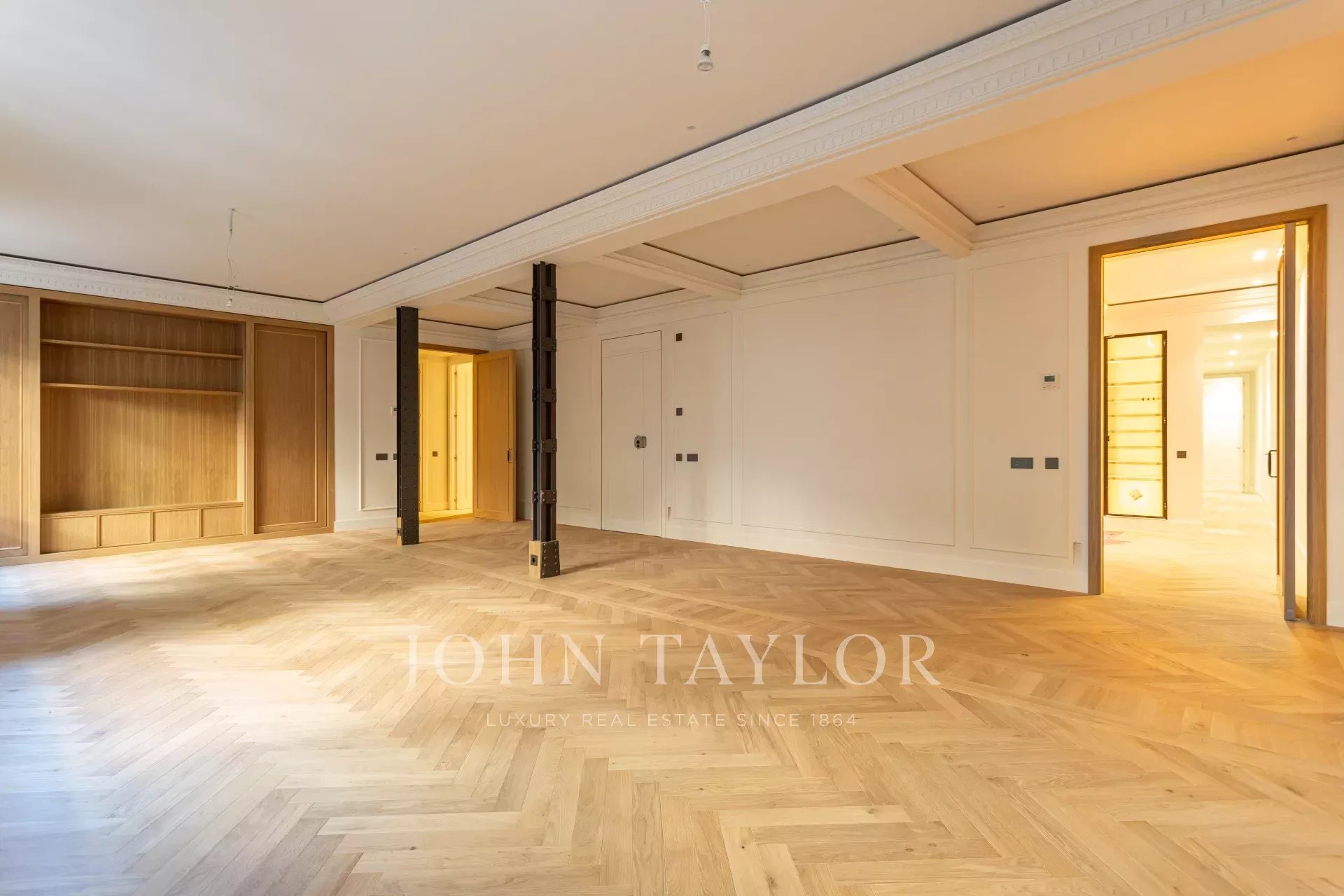 Гостиная и столовая очень просторные, открытого плана, с оригинальными железными колоннами и дубовым шкафом для книг и телевизора, сделанным на заказ. В квартире 4 полные и просторные спальни со встроенными шкафами. Ванные комнаты отделаны мрамором и оснащены высококачественной фурнитурой. Кухня была спроектирована Gunni&Trentino и полностью оборудована техникой Miele, как того и заслуживает категория этой недвижимости. Кухня полуинкорпорирована и имеет отдельную прачечную, оборудованную стиральной машиной и сушилкой, гладильной поверхностью и сушильной стойкой.